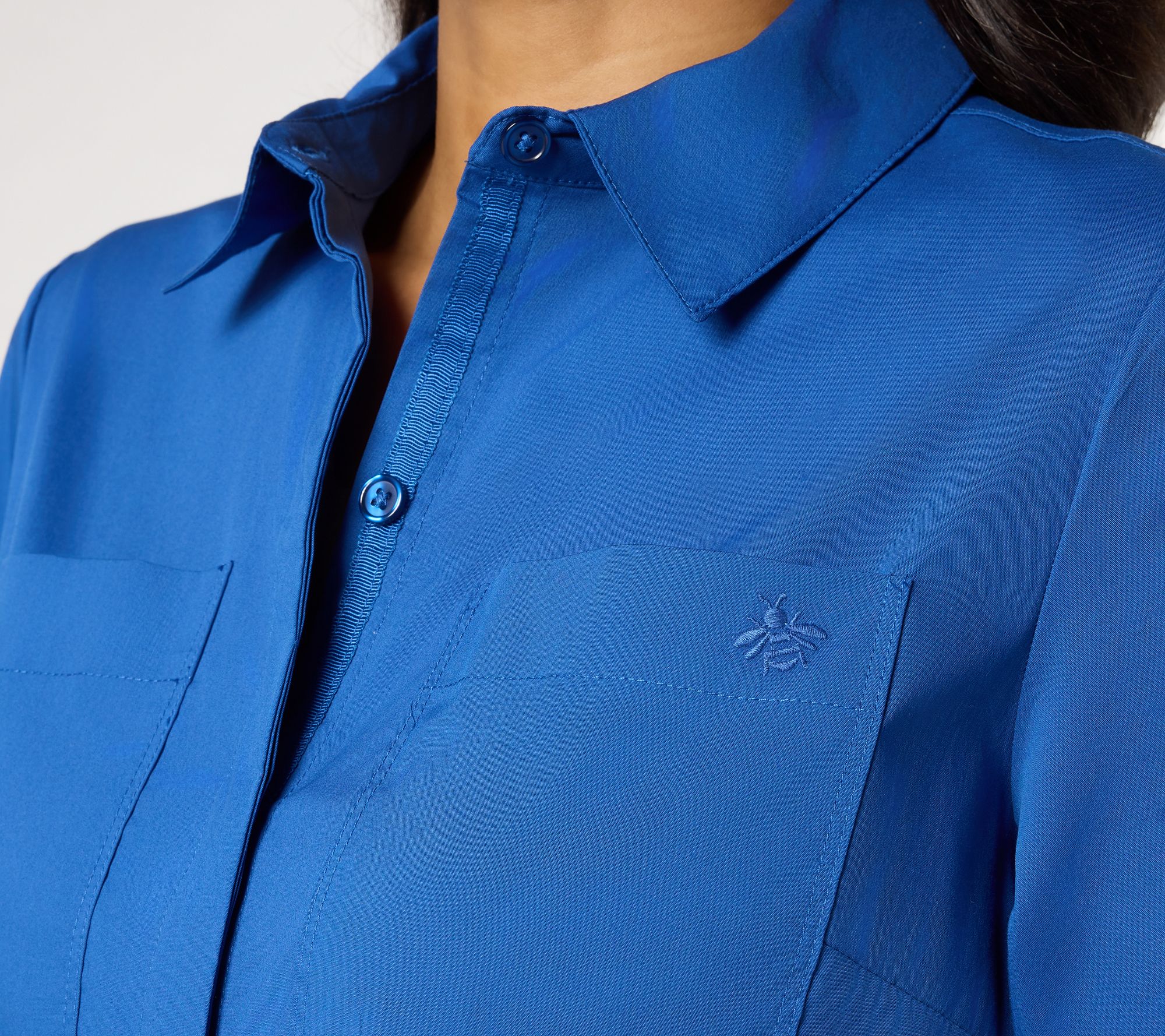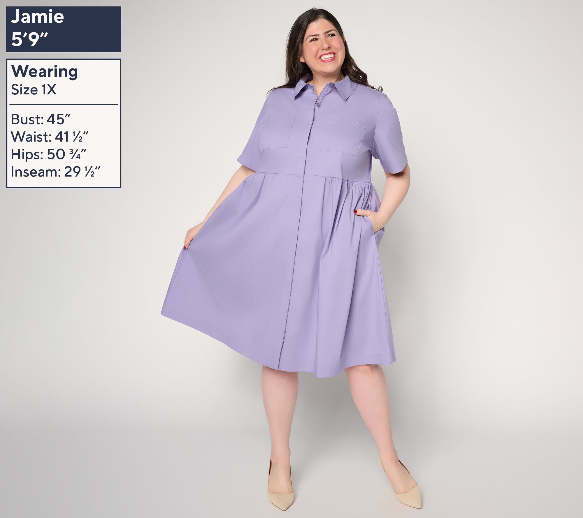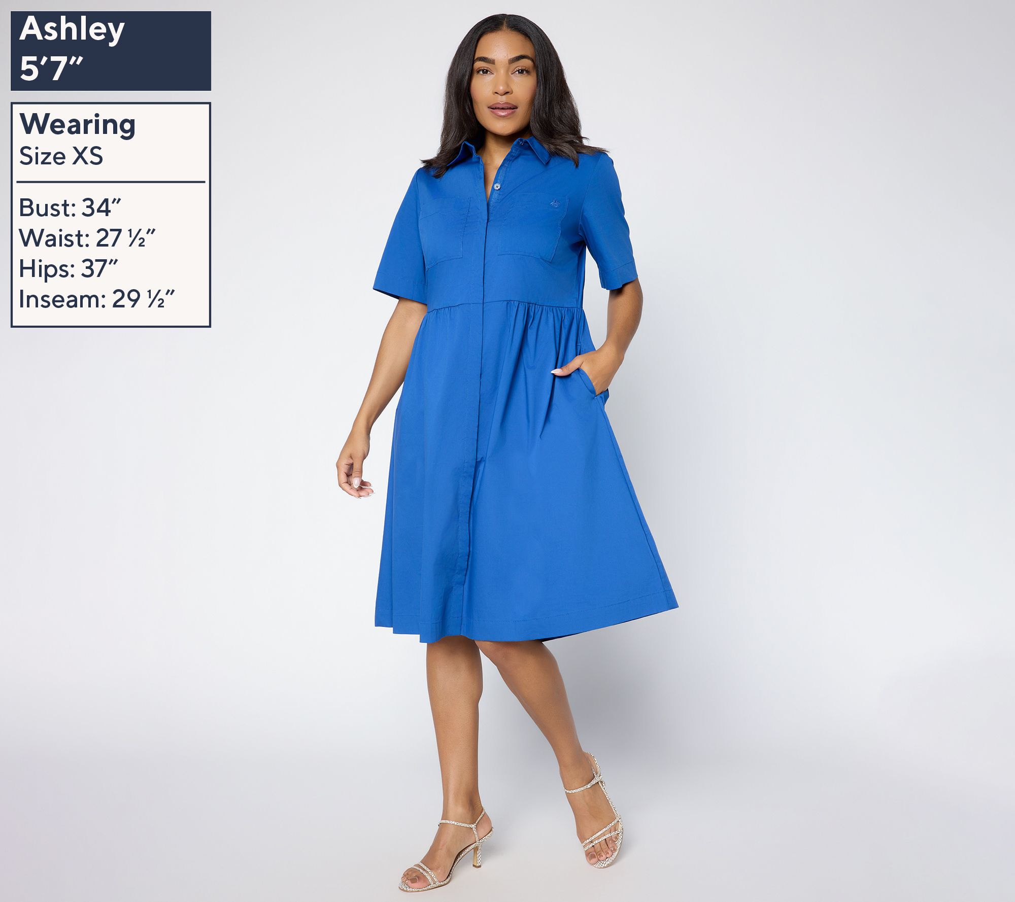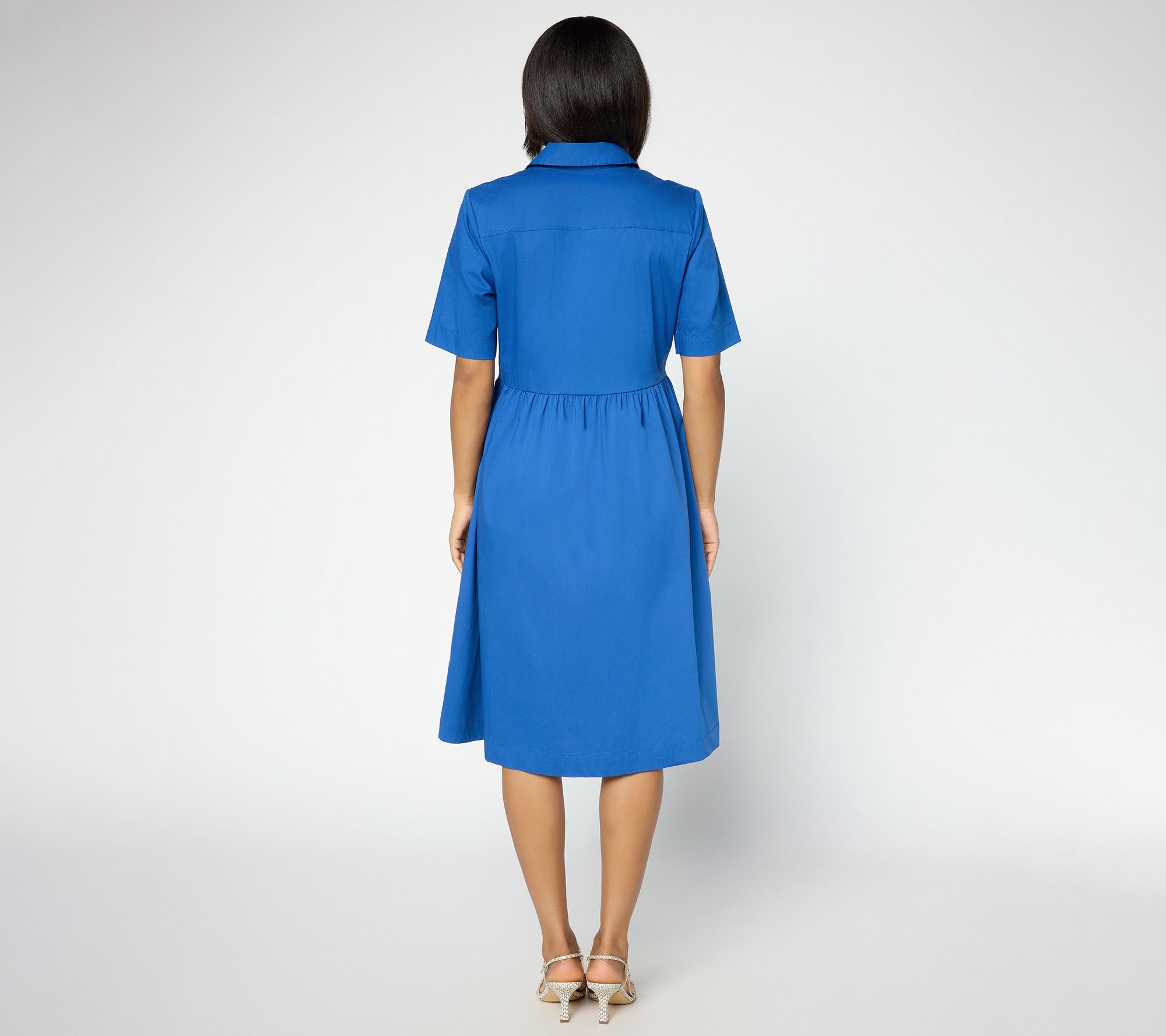 A crisp woven poplin dress makes moving from busy afternoons to casual gatherings effortless. Notable for its classic shirt-like details -- like a collar, hidden button placket, and chest pocket -- this semi-fitted midi-dress is designed for comfortable style from office hours to after-hours. Waist seam shirring creates flattering movement in the skirt. From Joan Rivers Classics Collection®.
