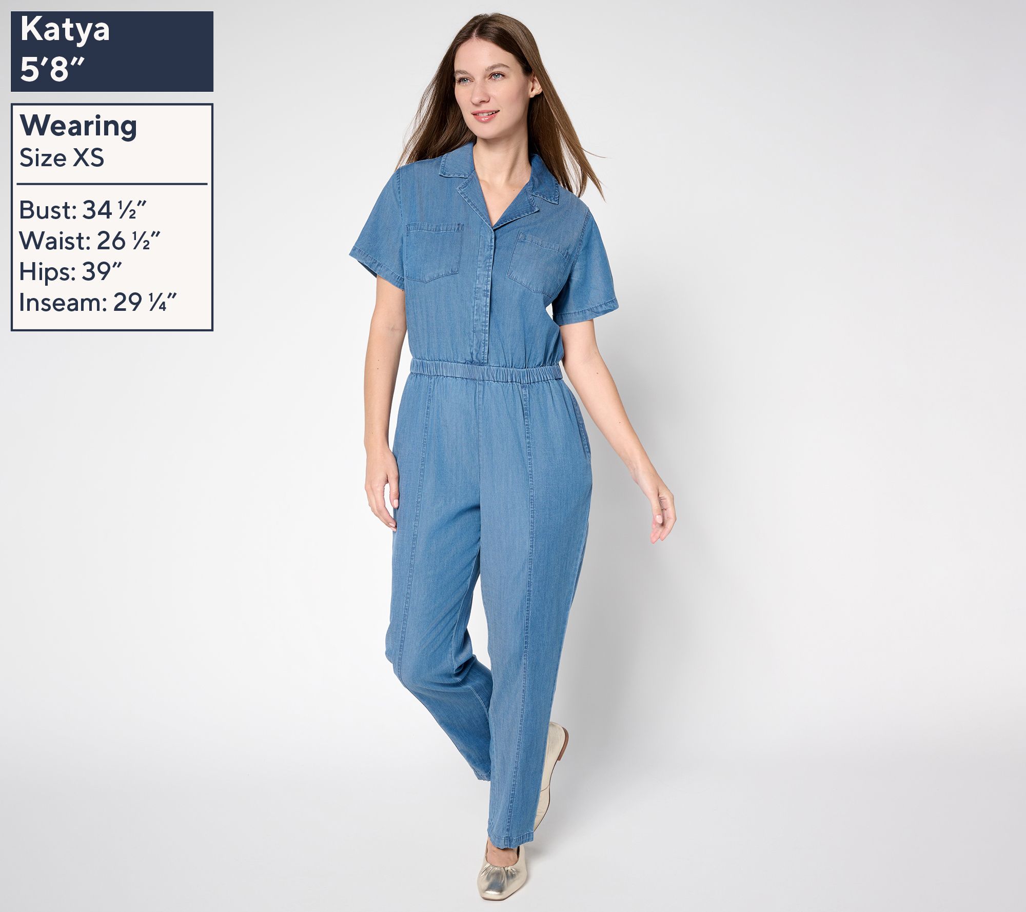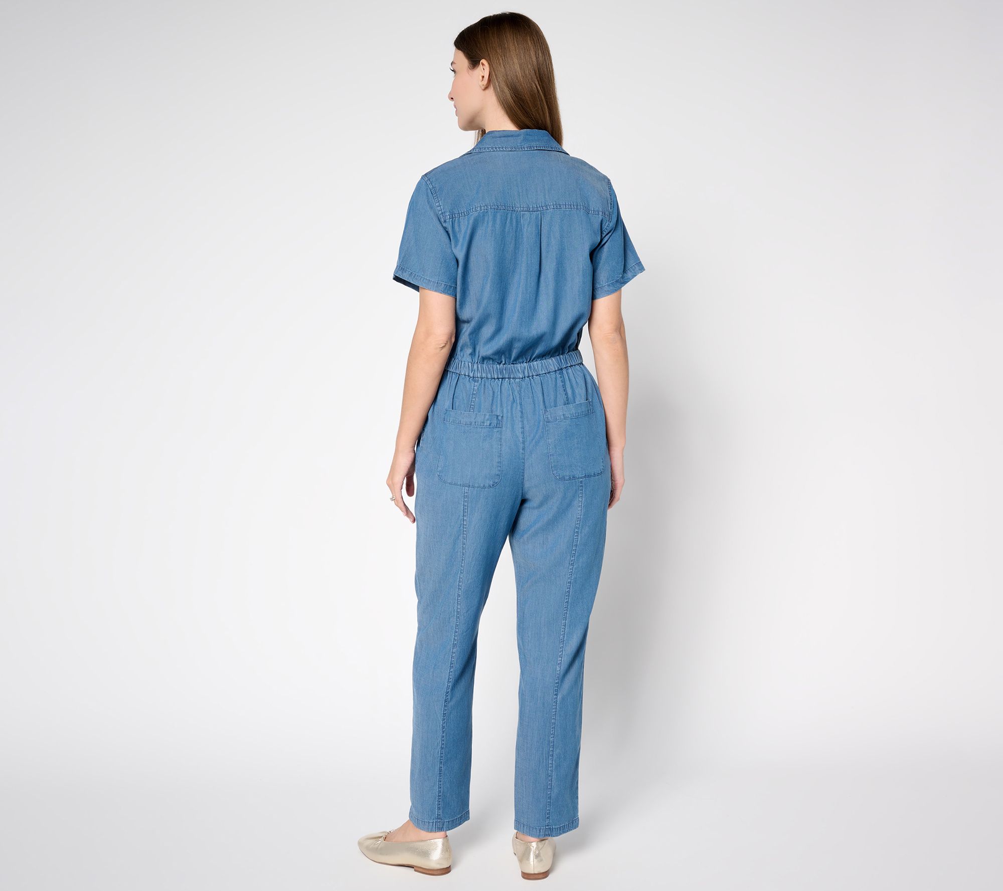 Found: confidence in a jumpsuit! This short-sleeve, ankle-length design is crafted from smooth, flattering lyocell -- with a bit of stretch for easy movement throughout your day. Hidden buttons at the front and an elastic waist make it a breeze to put on -- or slip off for bathroom breaks! But our favorite feature? How effortlessly it becomes a canvas for all your new-season style moments. Top it with a cute cardi (tied at the neck, perhaps?), a statement necklace, or a pretty scarf. Fabulous! From the Joan Rivers Classics Collection®.