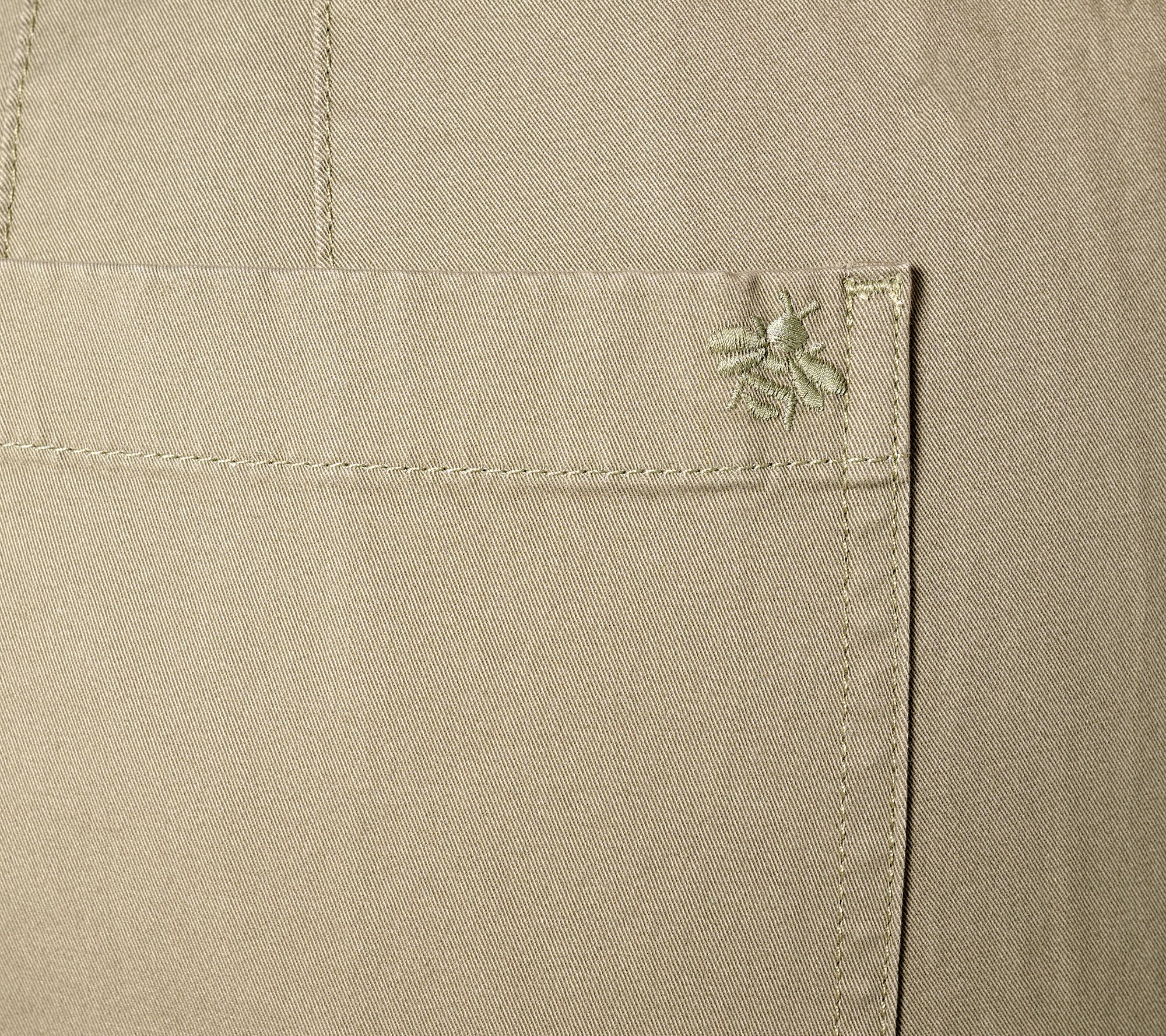 • Features: belt loops, back waist darts, back patch pockets, front and back crease lines, clean-finished turnback hem