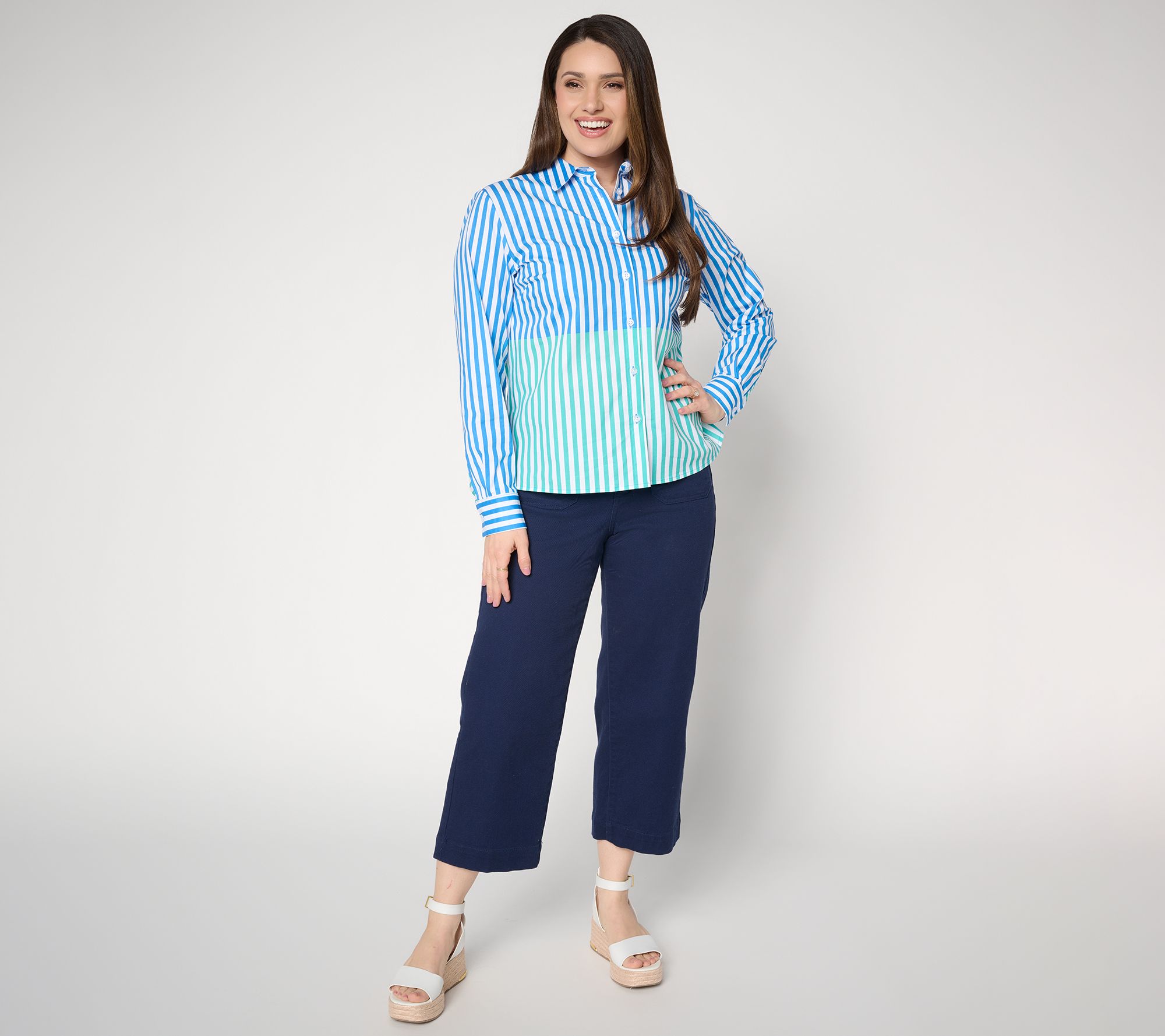 Morning meetings, casual gatherings, and everything in between -- this Classic Fit split-stripe shirt brings versatility and sophistication to your wardrobe. With crisp woven fabric and thoughtful details like side slits and a cuffed sleeve, it's a go-to piece for pairing with jeans or dressing up with a skirt. From the Joan Rivers Classics Collection®.