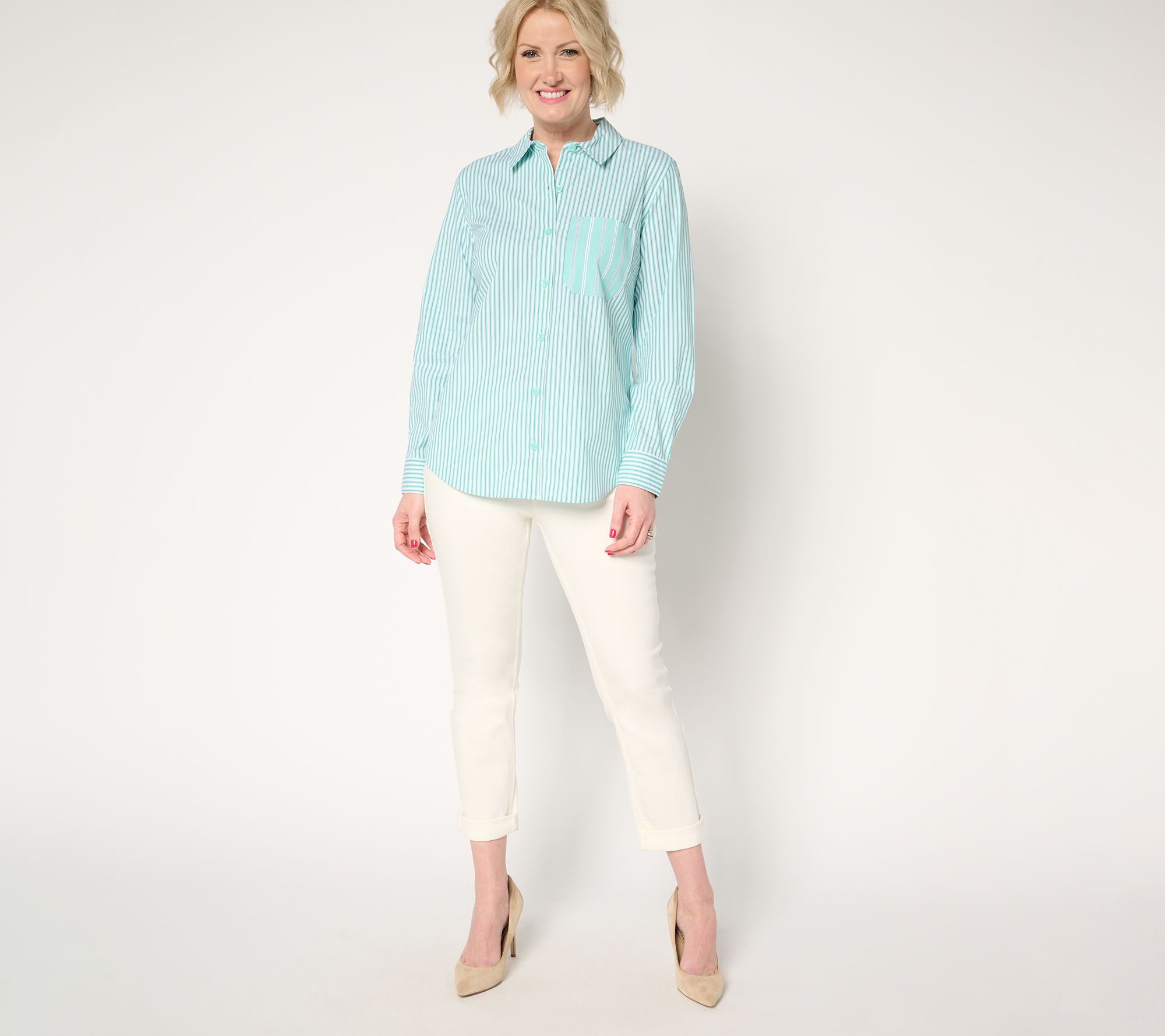 Church potlucks to PTA meetings, the crispness of cotton is always a good choice. This mixed stripe button-down shirt keeps things caszh with a playful design, while a sprinkle of spandex means more freedom of movement (ideal for your ever-changing schedule). You'll always feel appropriately dressed when last-minute plans pop up. From the Joan Rivers Classics Collection®.