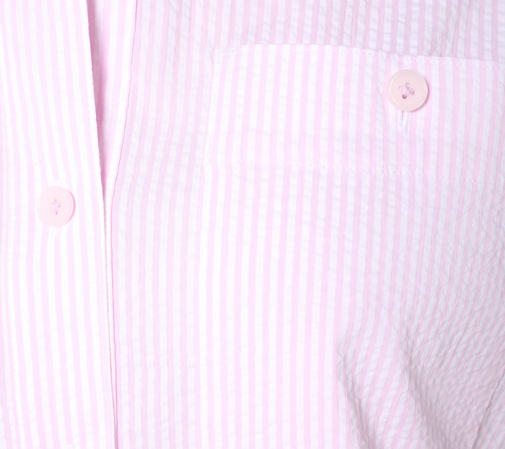 • Features: stretch seersucker, dolman sleeves, button front, patch pockets at front chest, curved hem