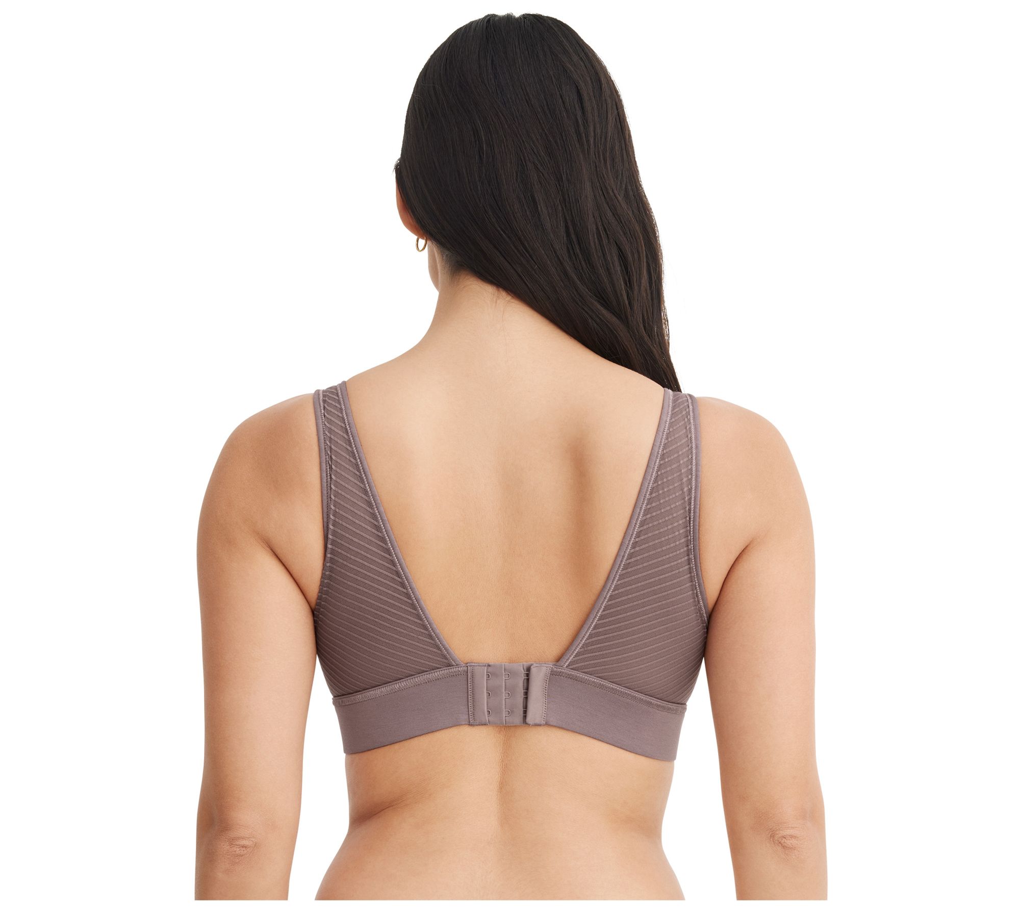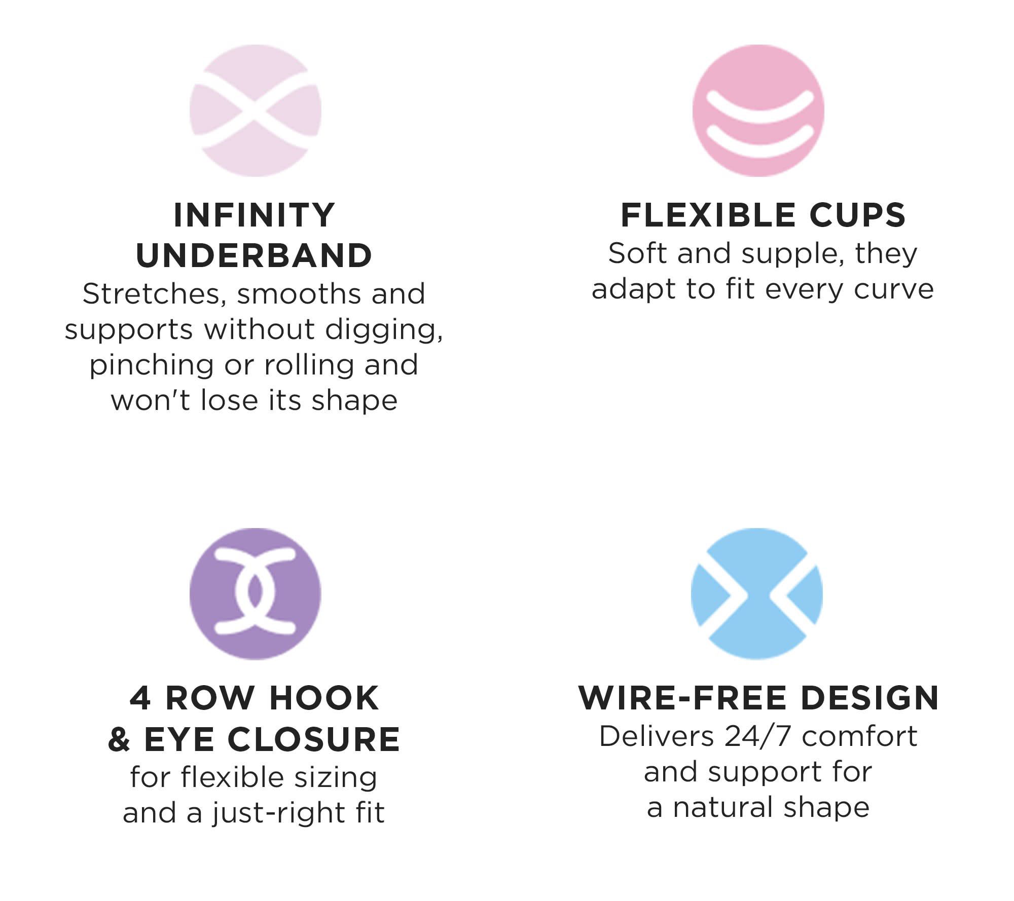 • Features: wire-free, soft sewn-in cups, infinity underband, four hook-and-eye closures, lined, V-neck mesh