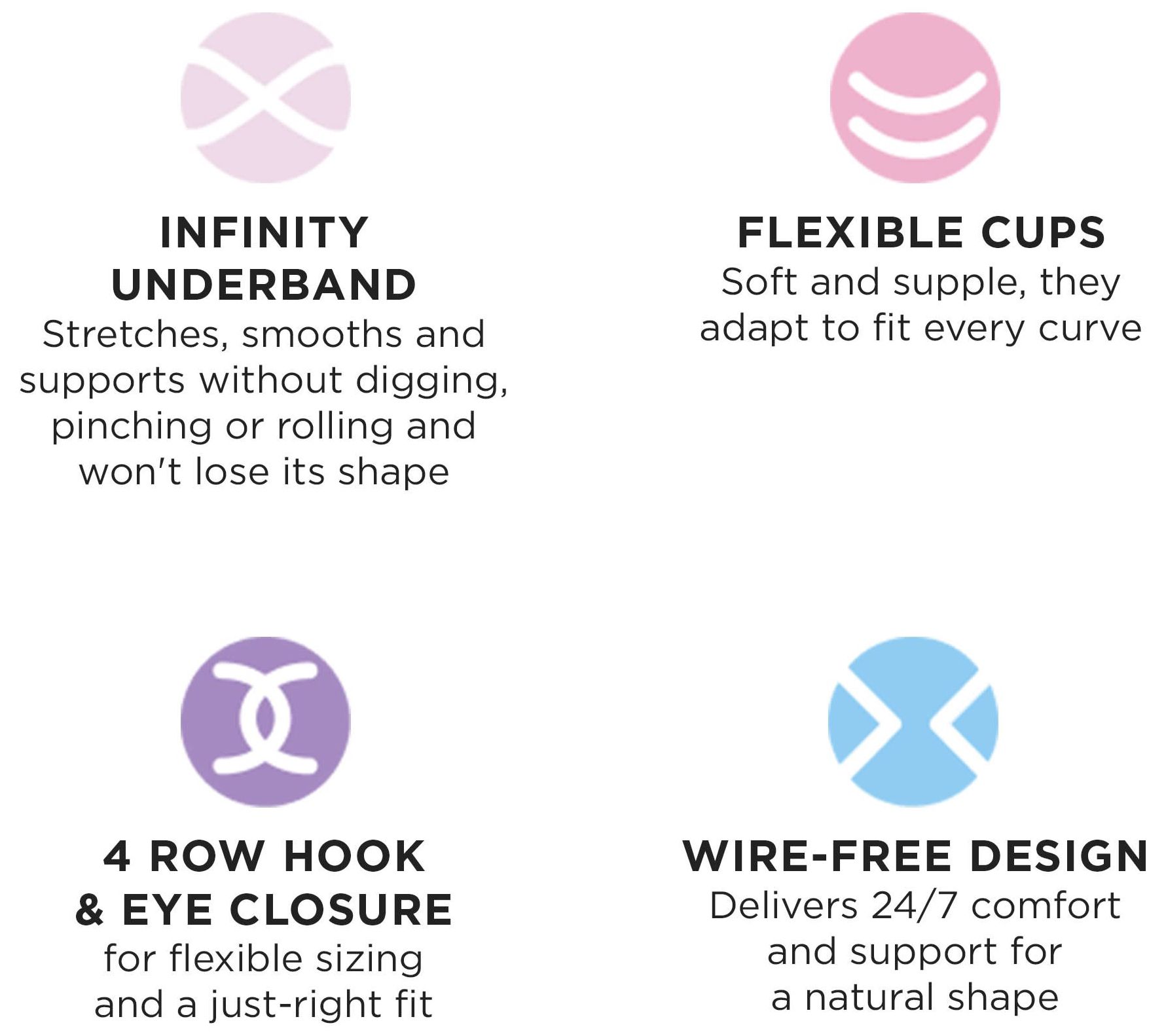 • Features: wire-free, soft molded cups, infinity underband, four hook-and-eye closures