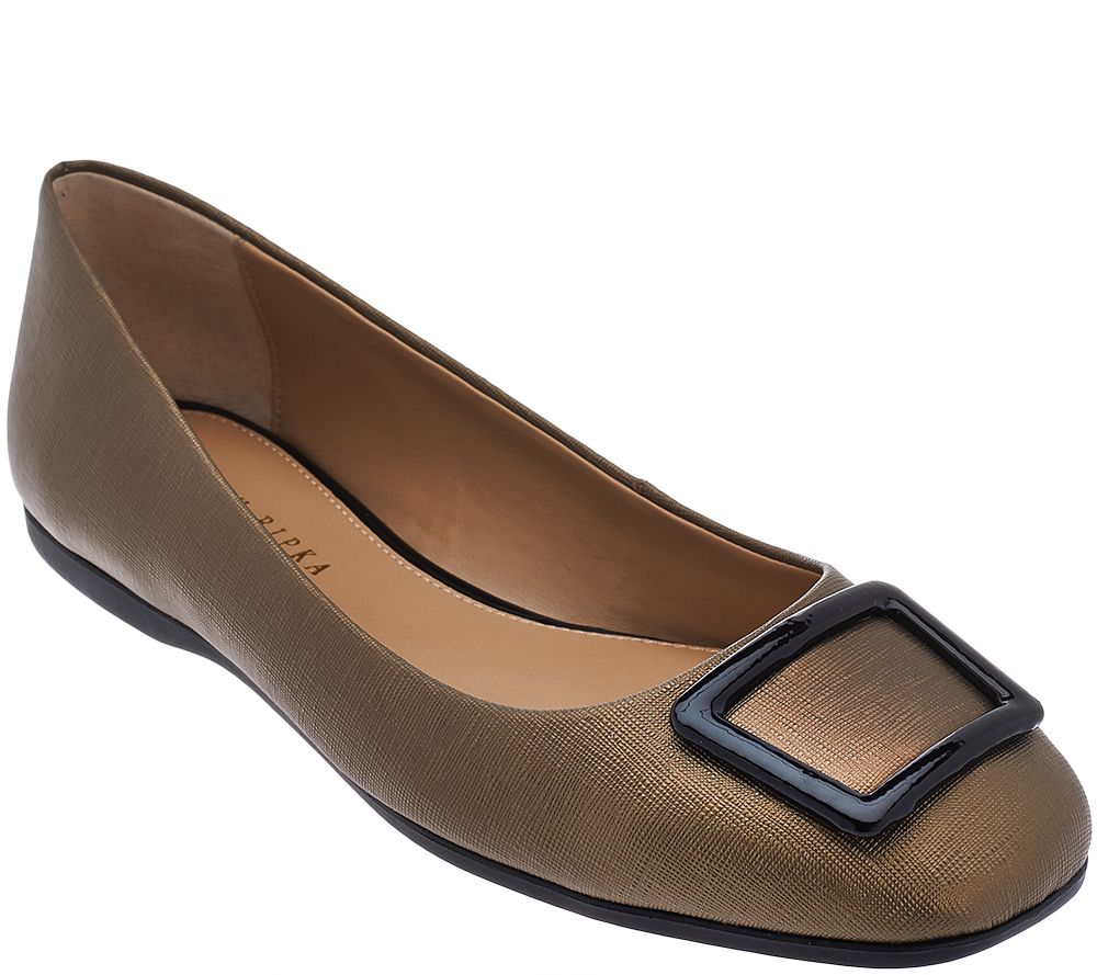More bang for your buckle. Flats get just a bit fancier with the Saffiano leather Sally slip-on from Judith Ripka. The oversized buckle on the vamp adds an eye-catching designer detail to the simply sensational--and tastefully textured--style. Slide these on with everything from leggings to your sleekest skirt. From Judith Ripka.