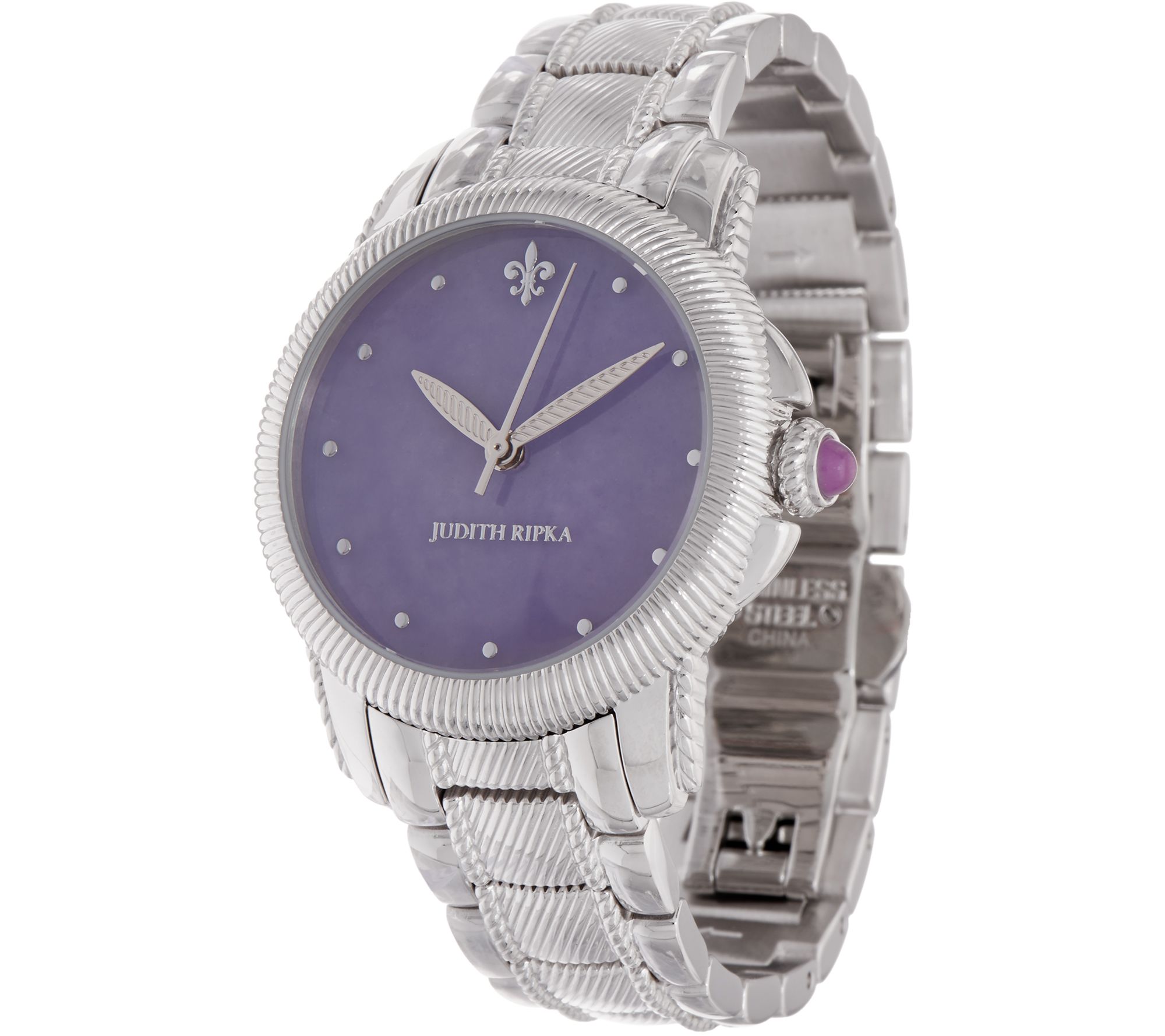 • Round, berge-textured case; stainless steel caseback; jade cabochon on crown