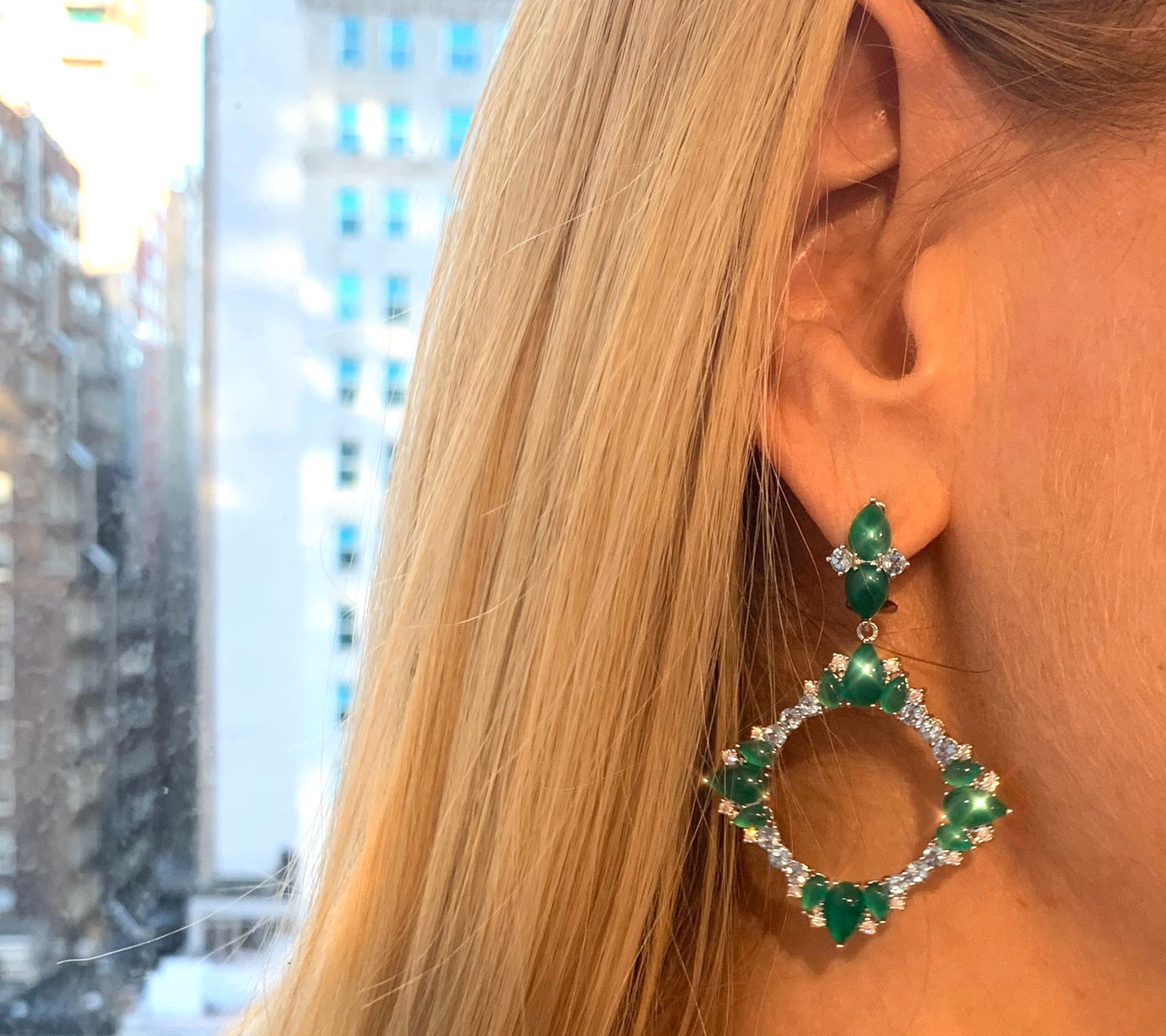 • Front-facing hoop design; prong-set, round Diamonique simulated diamonds; three prong-set, pear-shaped, green chalcedony cabochons north, south, east and west of bottom hoop with three round, prong-shaped Swiss blue topaz in between; top has two prong-set round blue topaz and two prong-set pear green chalcedony cabochon stones; berge texture throughout; polished and textured finish; rhodium plating