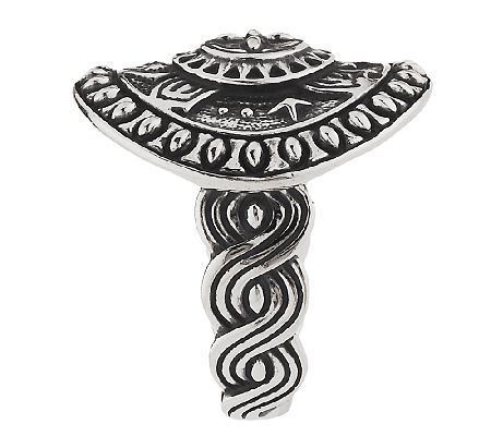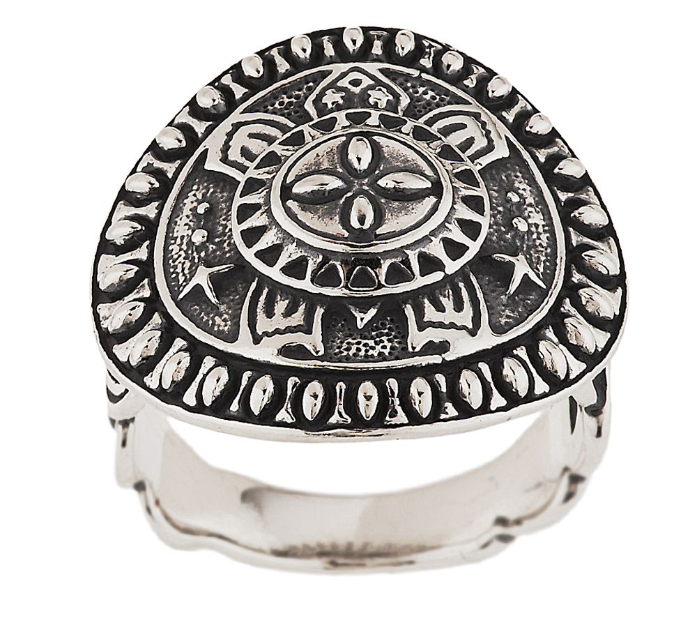 • Round shaped ring; dimensional turtle design in the center; beaded border and braided design on shank; highly polished; oxidized finish