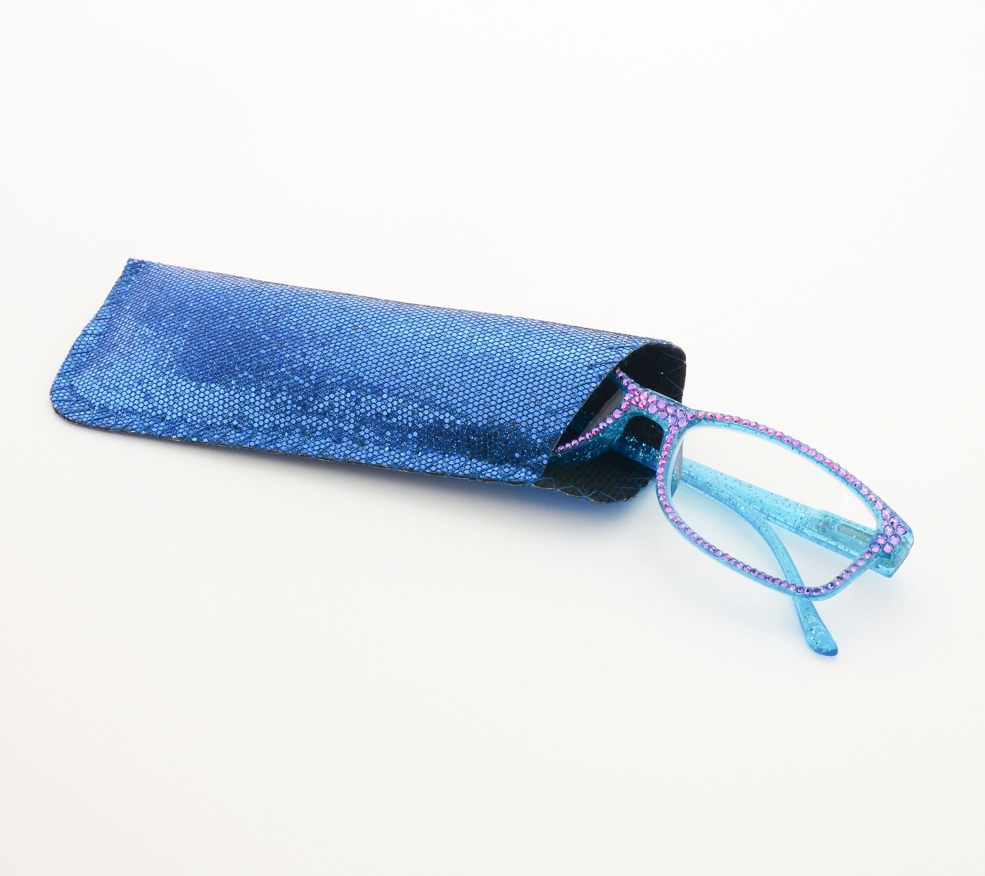 Add a sparkling accent to your day with the Glitter Goddess reading glasses. The shimmering blue glitter frame is paired with blue faceted stones to brighten up every moment that calls for precise focus. From Kirks Folly.