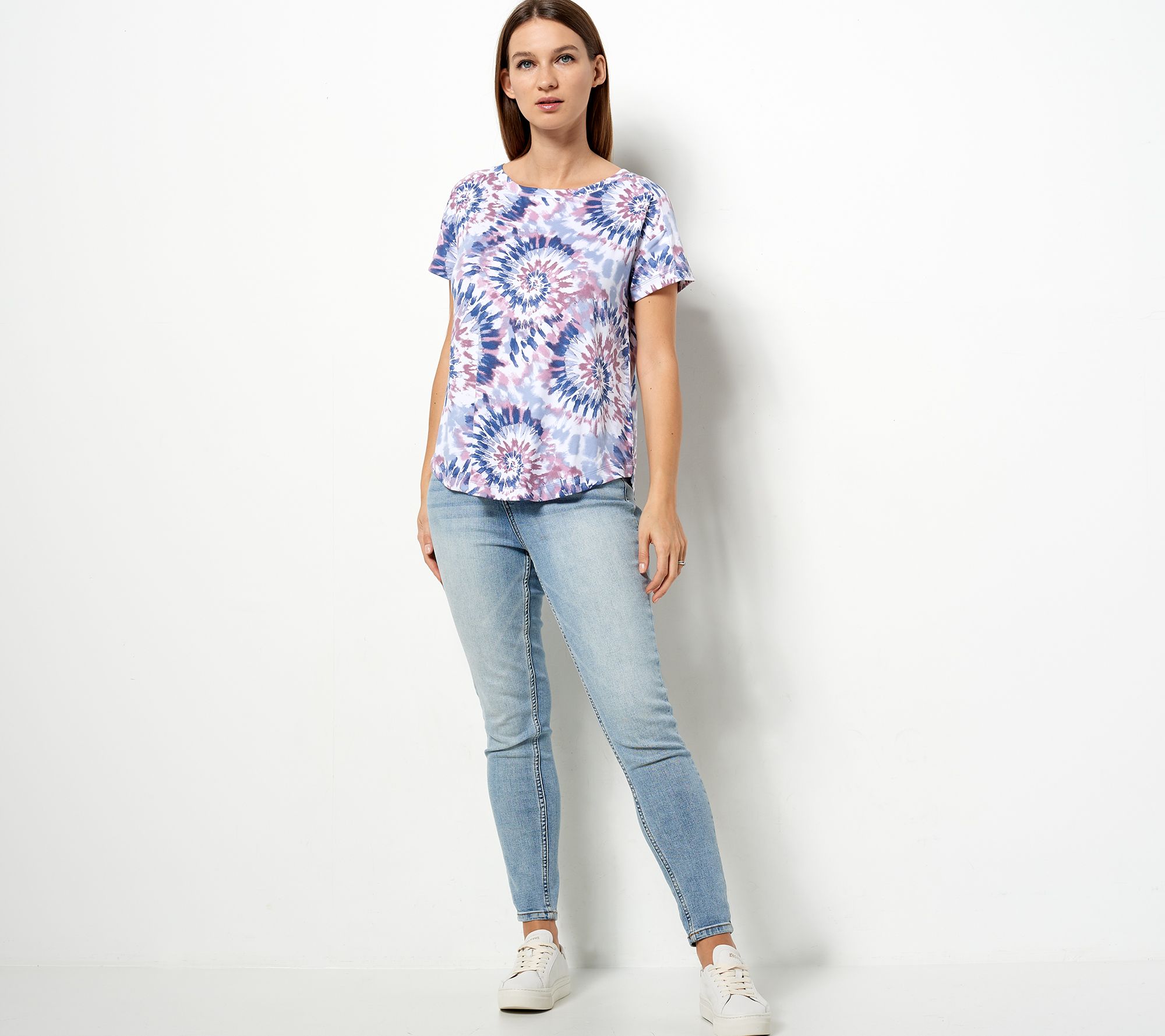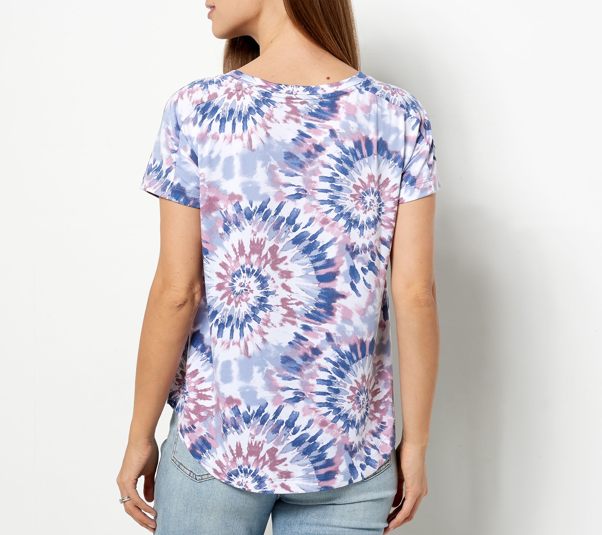 • Features: crew neckline, back neck tape, drop shoulder, short sleeves, shirttail hemline