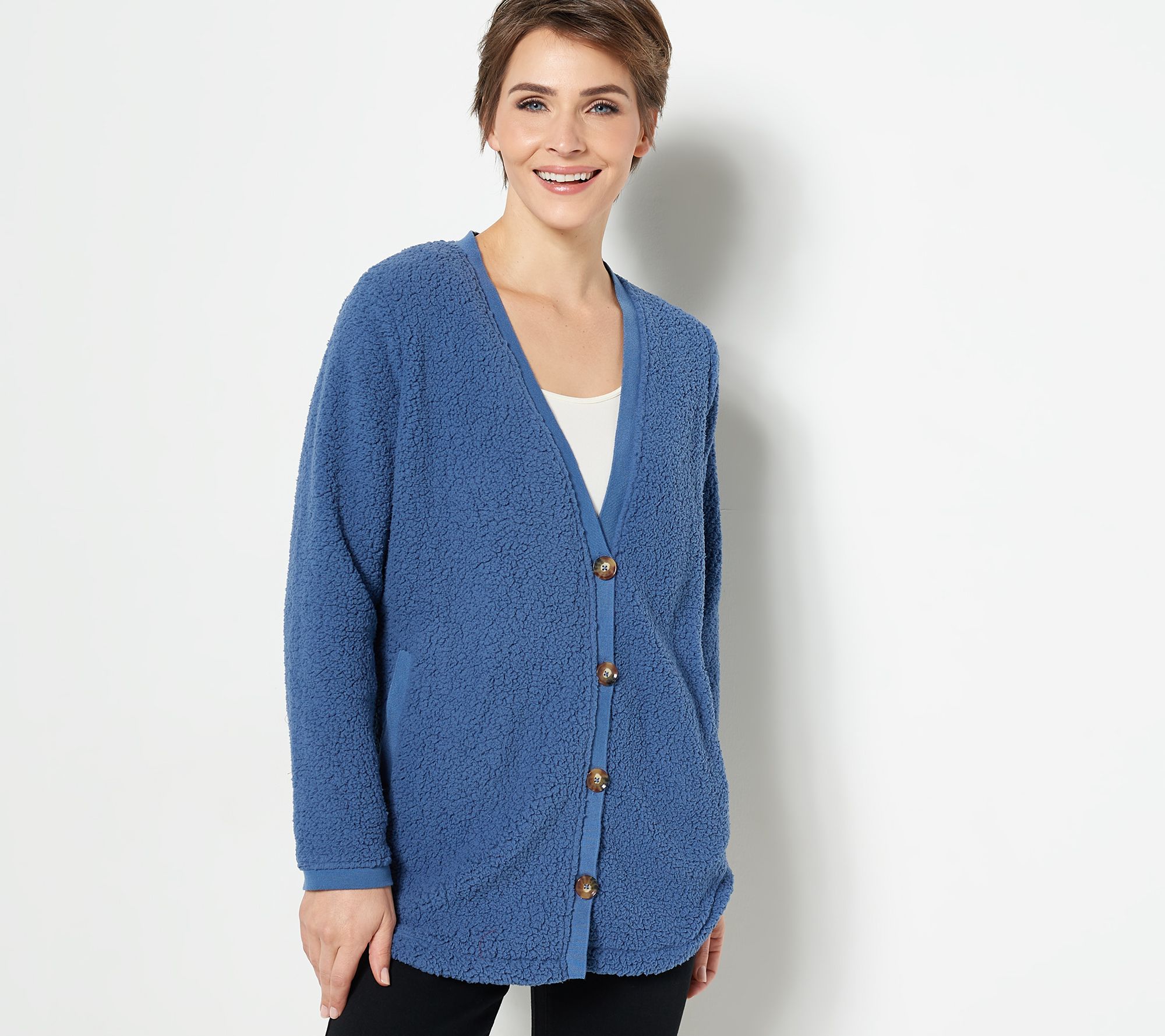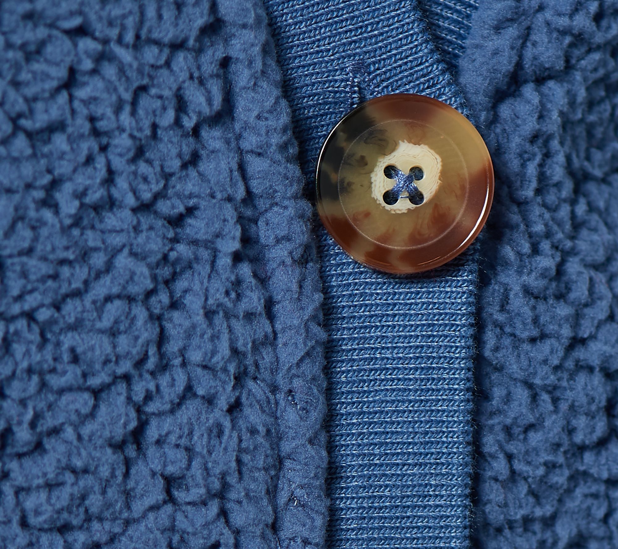 • Features: popcorn Sherpa texture, faux-tortoiseshell buttons, rib trim detail, welt pockets, back neck tape