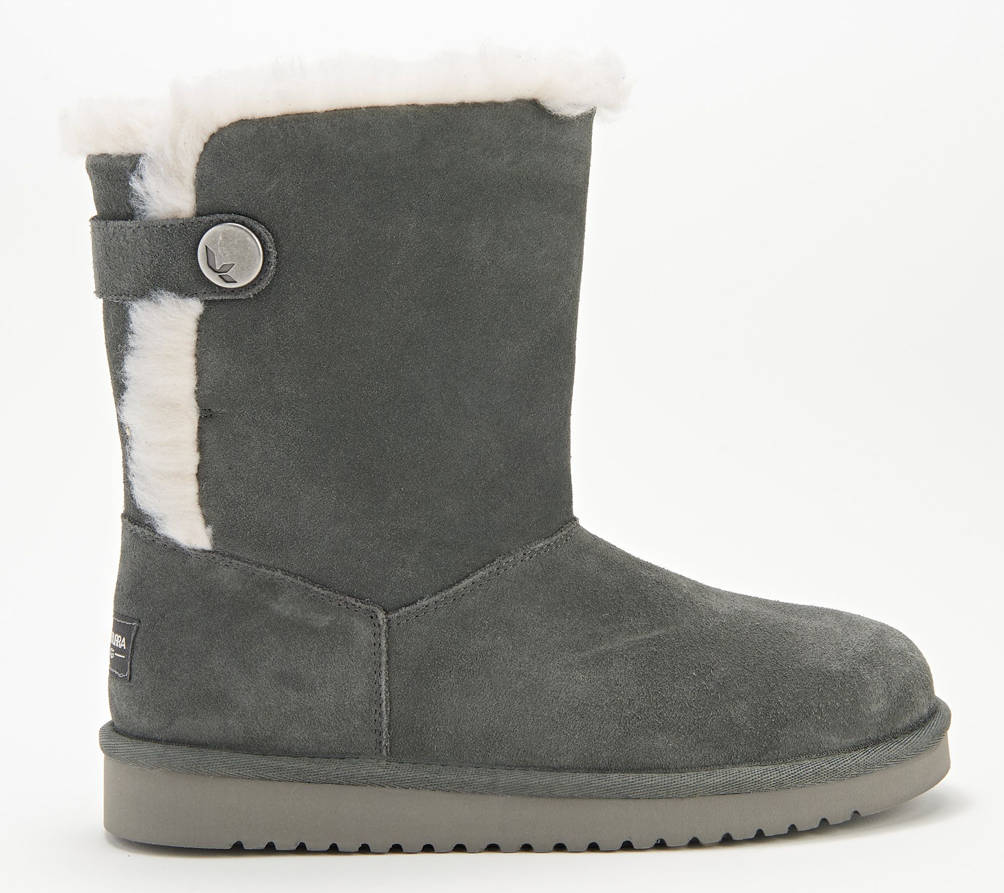 Koolaburra by UGG Suede Button Short Boots - Jordina. This short boot features a soft inner lining and gold button on the calf. Padded insole for comfort: textured outsole for traction. Sole thickness approx.: .94". Shaft height:8"; Opening circ.:14". Content: Leather Upper; Textile Lining; Balance manmade. COO:Imported. *Fit:True to size. "As Is"item See A383184
