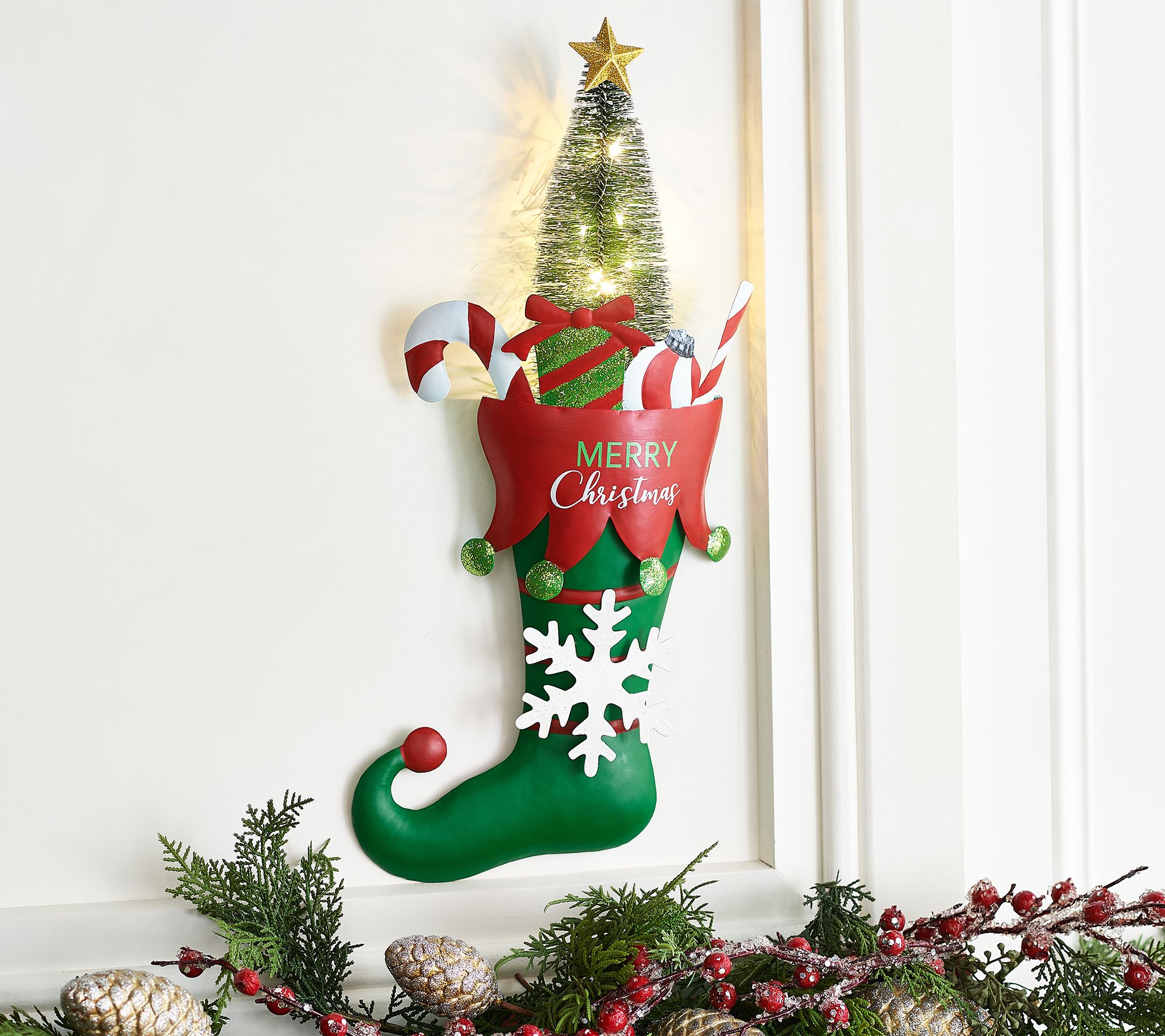 Tiptoe on over and pick up one of these charming stockings to really show off your holiday spirit! A splash of fairy lights adds gentle illumination for the festive season. From Kringle Express.