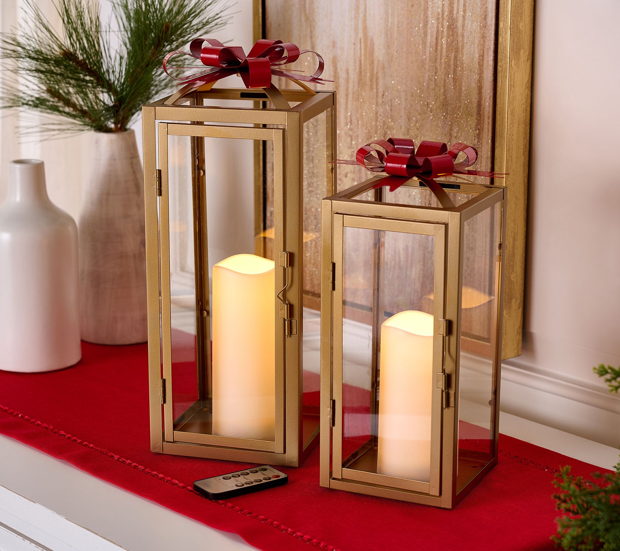 • Includes two flameless metal lanterns, two removable Christmas bows, and remote control with pre-installed battery