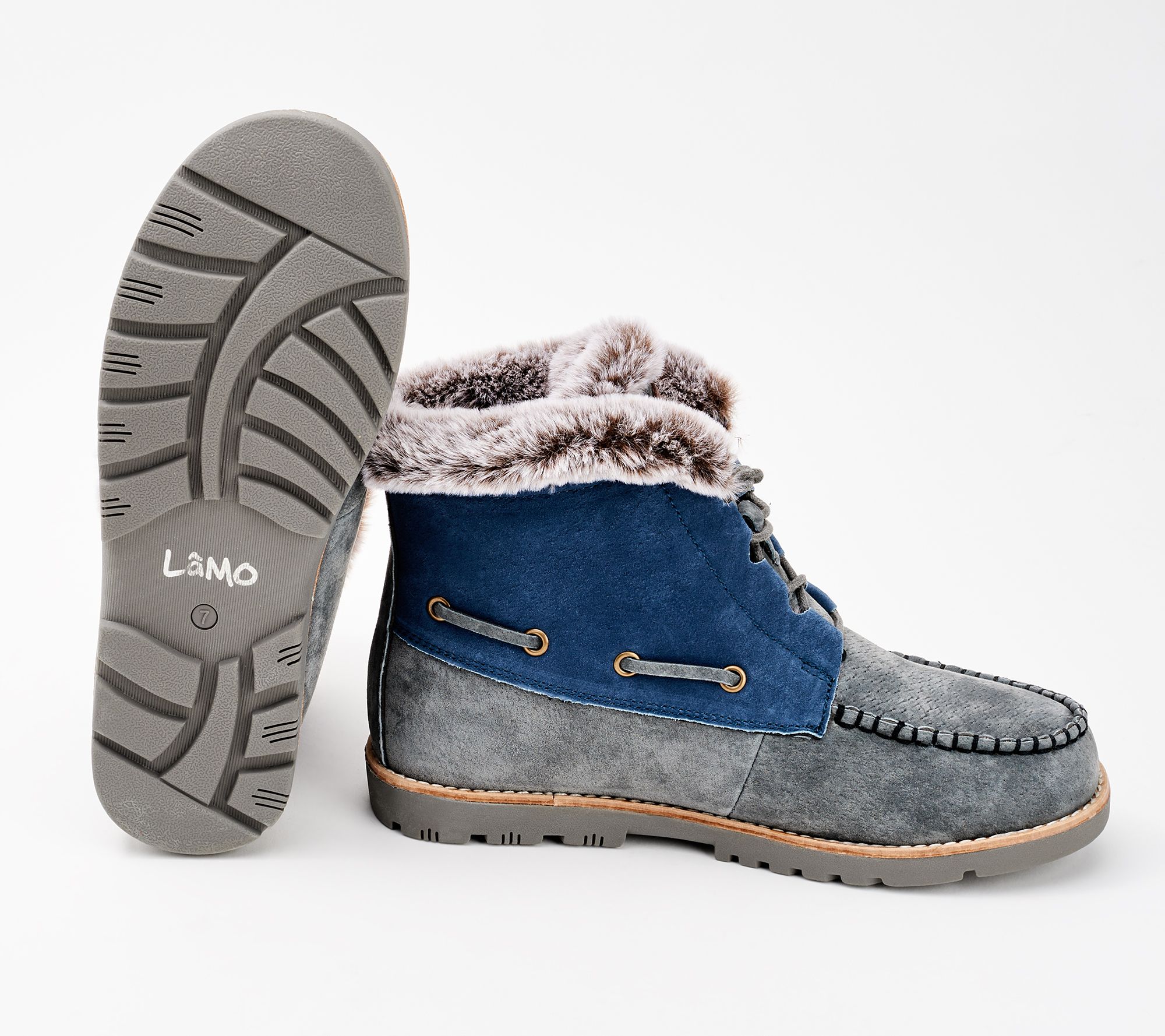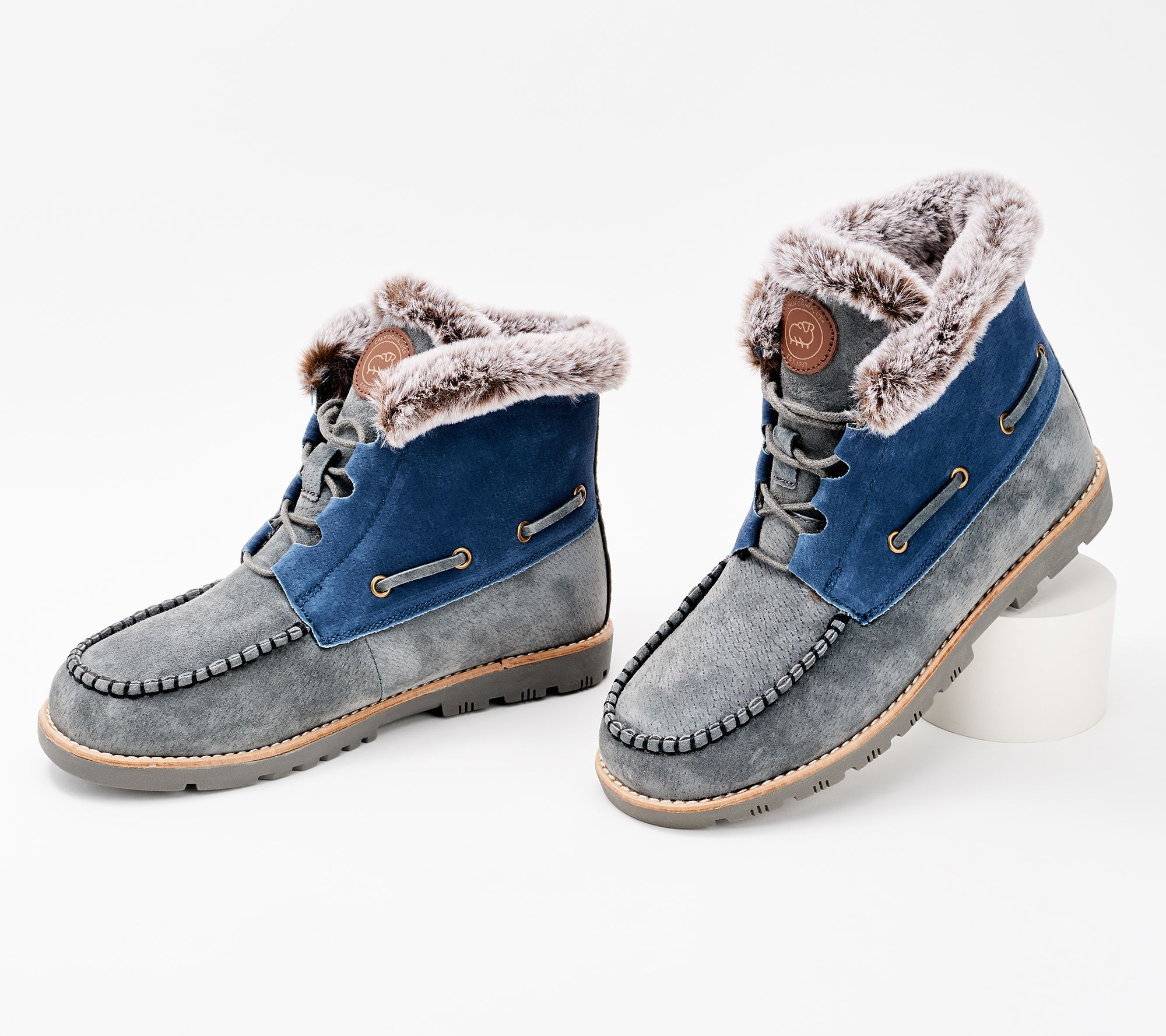 You'll be wearing these suede lace-up boots all season long thanks to a comfy memory foam footbed, trendy stitched detail, and luxe faux fur cuff. From Lamo.