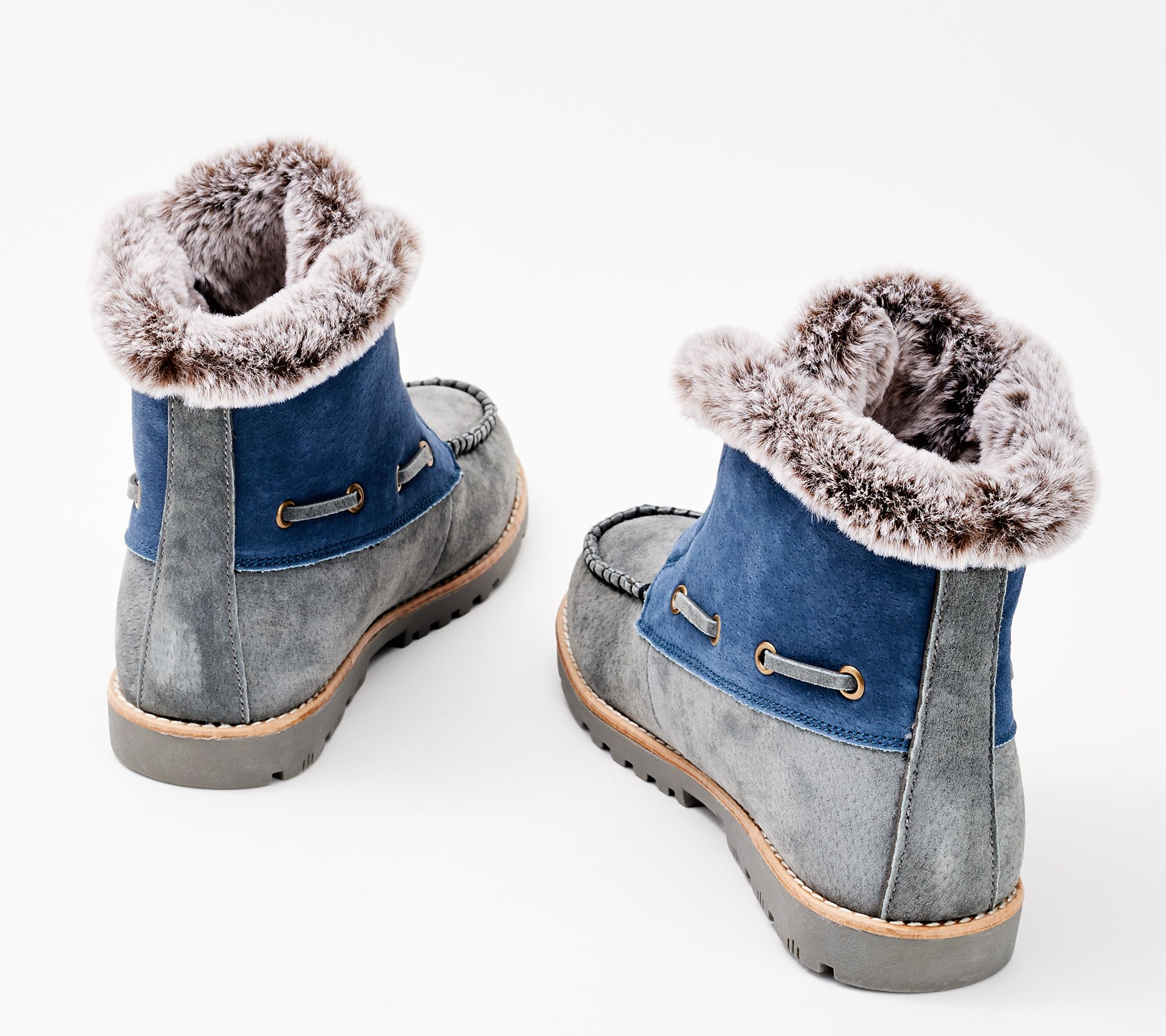 • Lace-up closure, faux rabbit fur collar, water-resistant