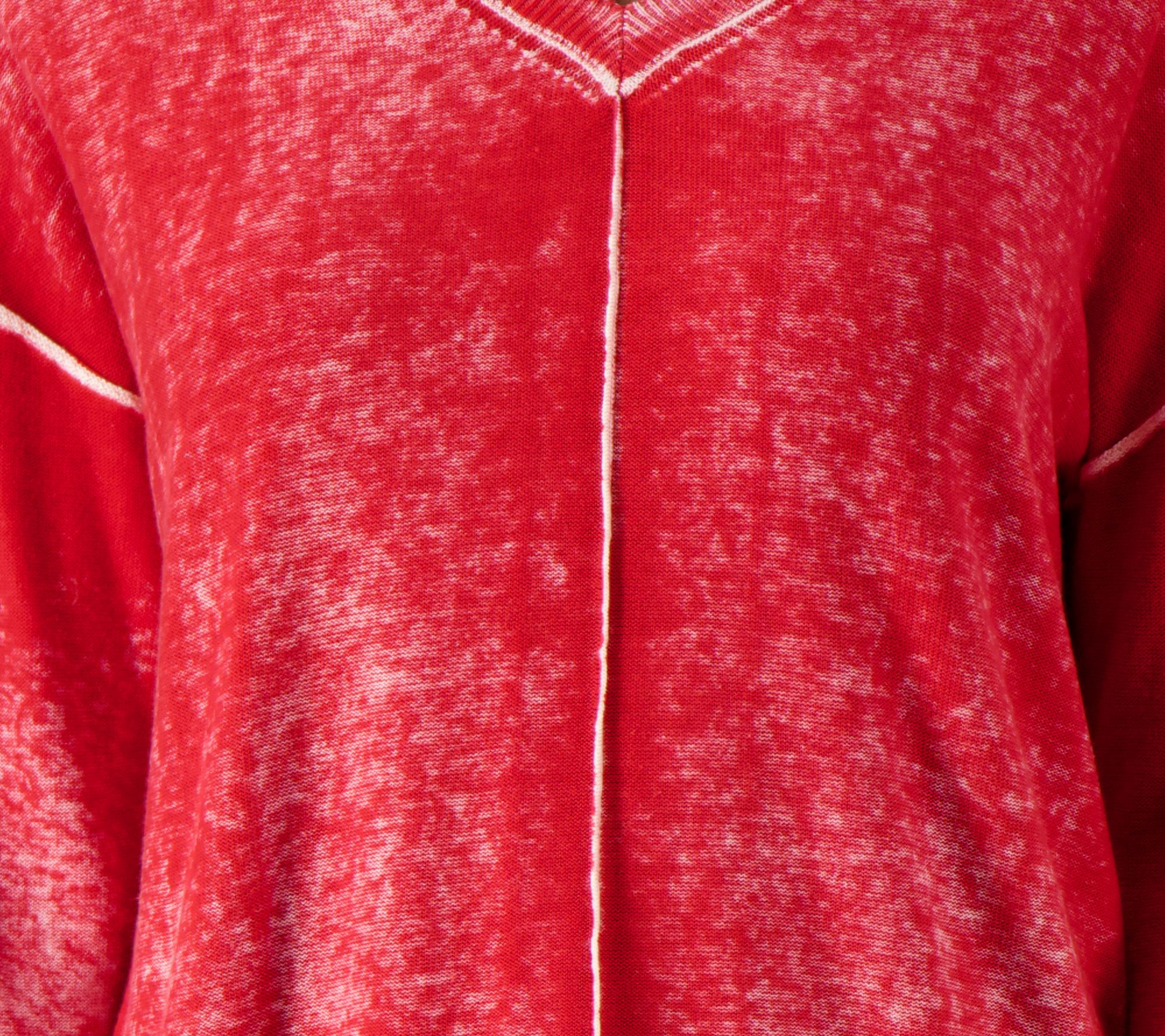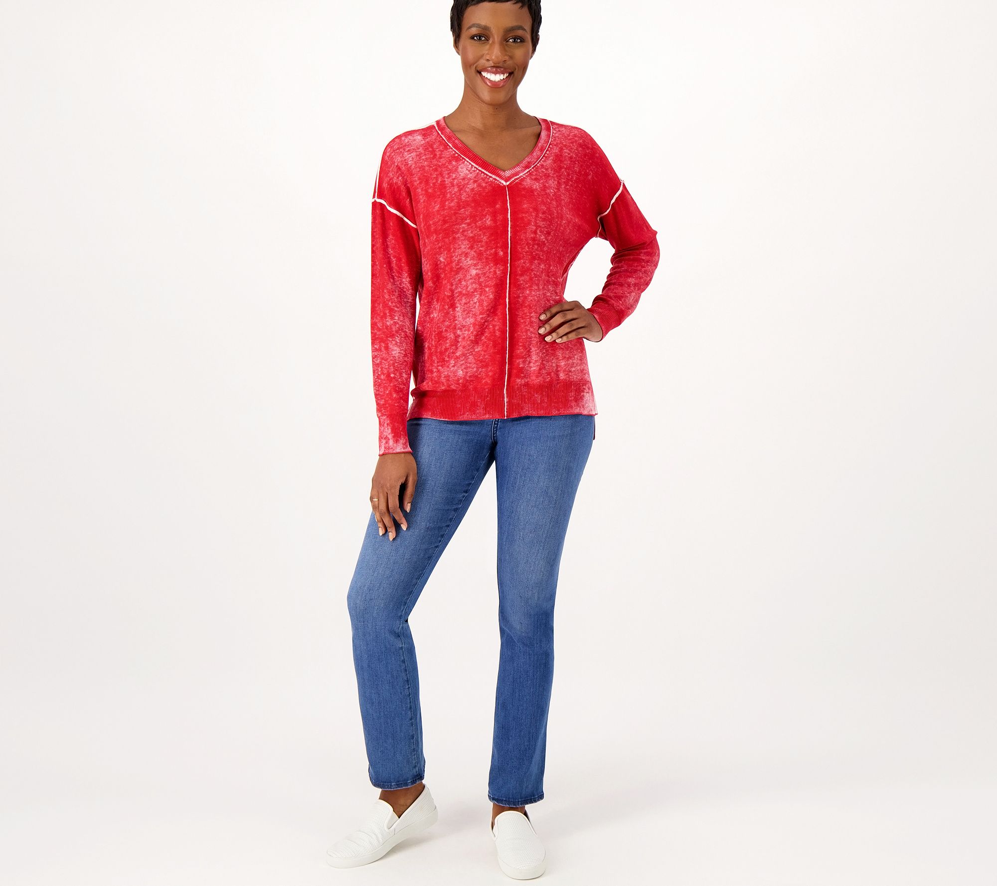 • Features: acid-wash pattern; dropped shoulder; V-neckline; ribbed trim at neckline, cuffs, and hemline; seam detail at center front and back; side slits; hi-low step hemline