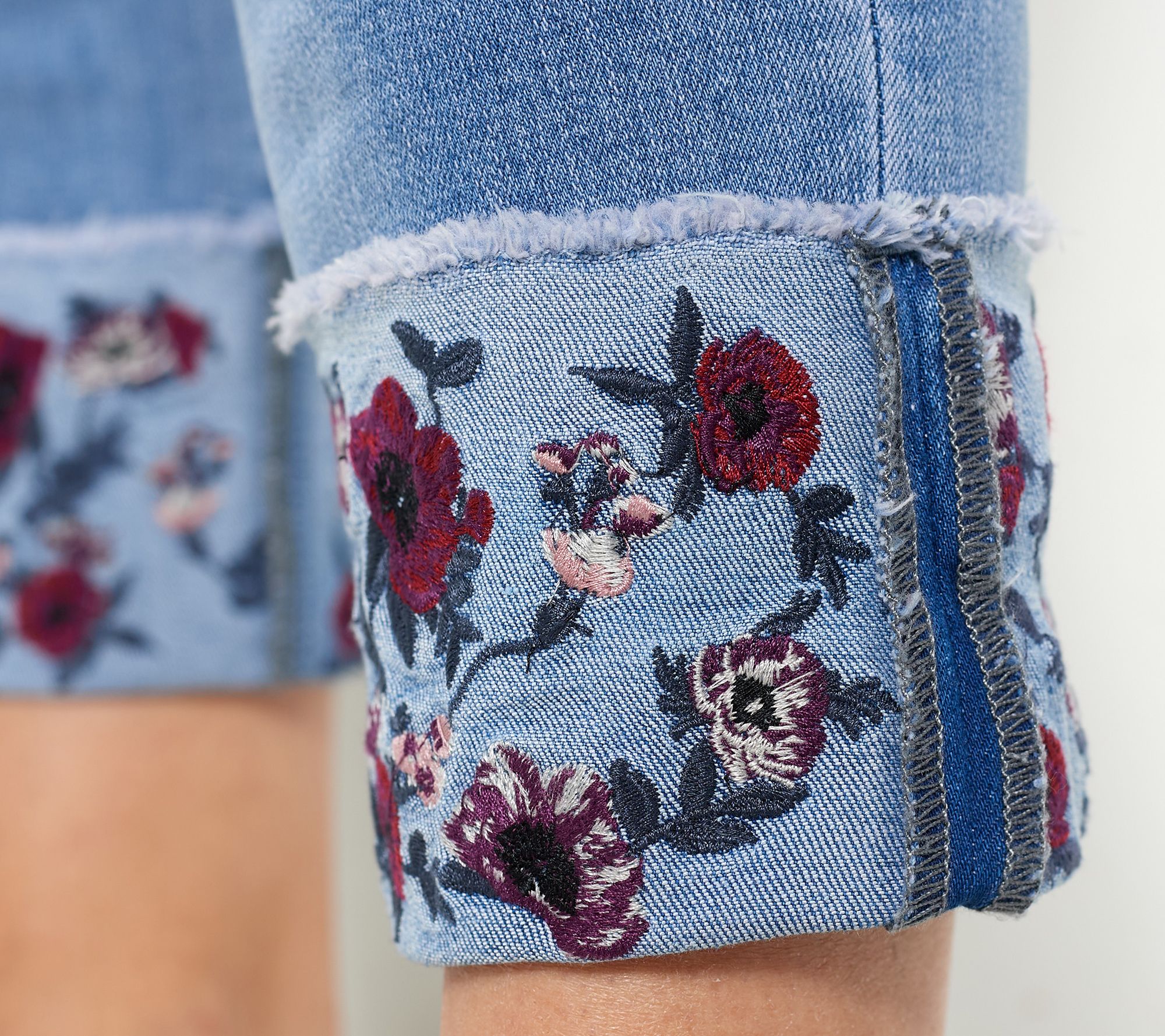 • Features: five-pocket styling, cuffs, floral embroidery detail