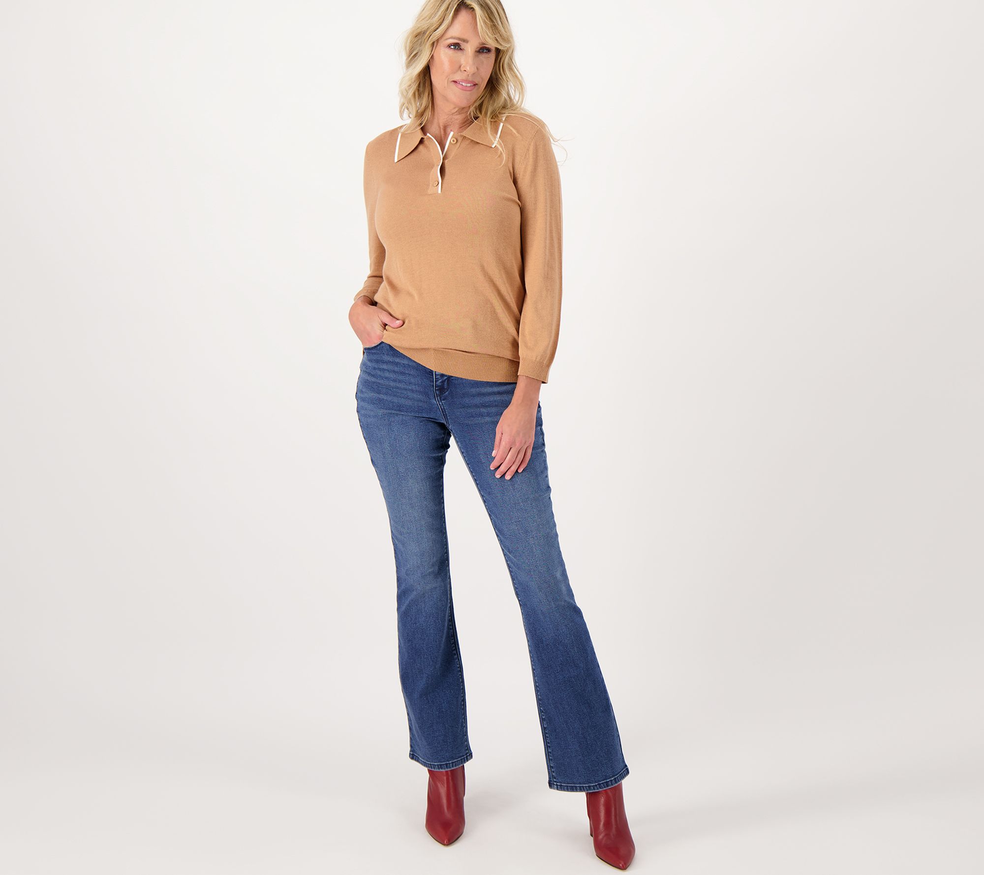 You'll be set for sartorial success in these bootcut jeans. The fitted silhouette accentuates curves and elongates the legs. Double win! From Laurie Felt Los Angeles.