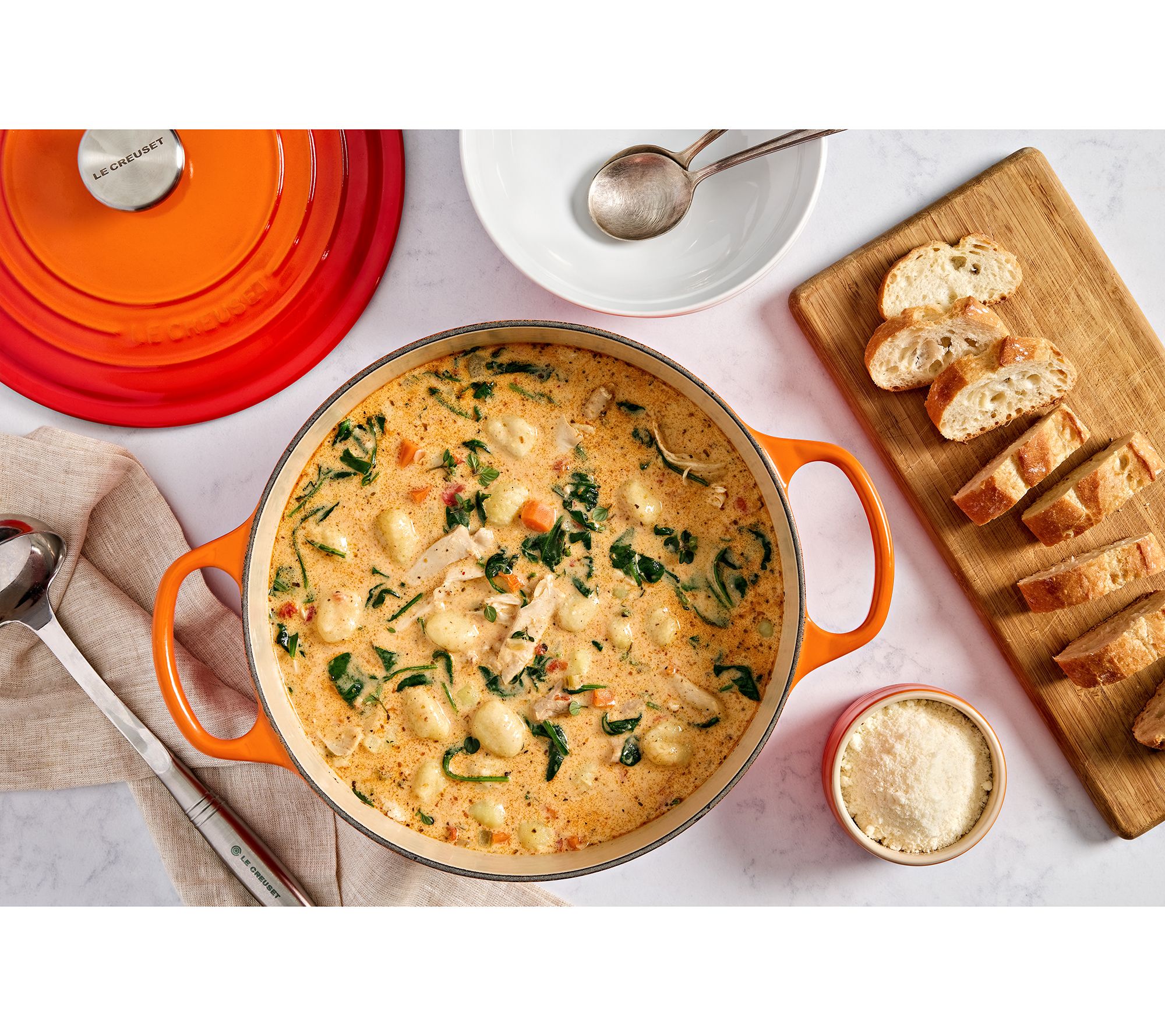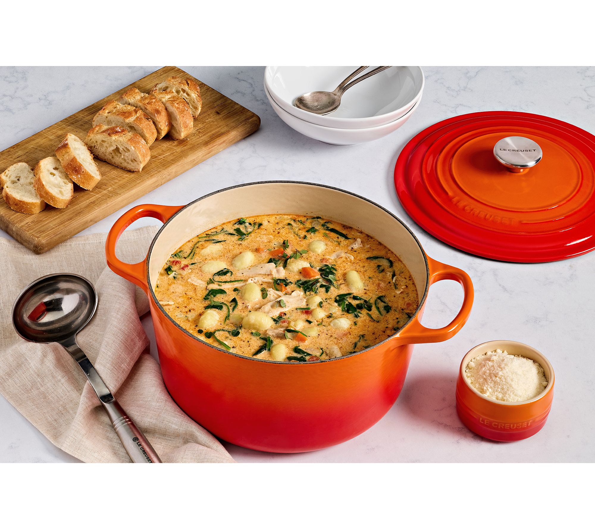 Chicken noodle soup, beef stew, fried chicken, homemade bread -- timeless recipes and crave-worthy comfort food are given new life thanks to the superior capabilities of this iconic kitchen staple. From Le Creuset.