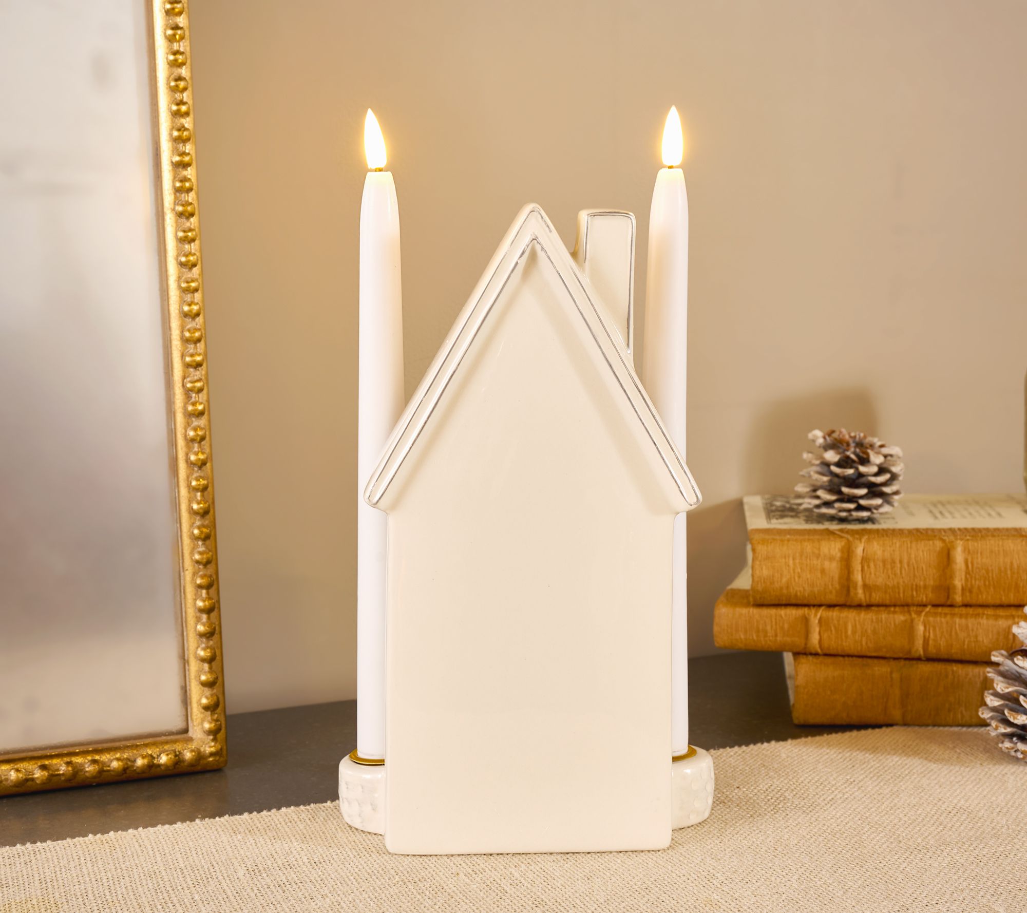 Create a festive atmosphere with this lovely ceramic holiday scene. Two flameless taper candles feature a convenient six-hour timer, making it easy to enjoy a warm, flickering glow without the hassle. From Lightscapes.