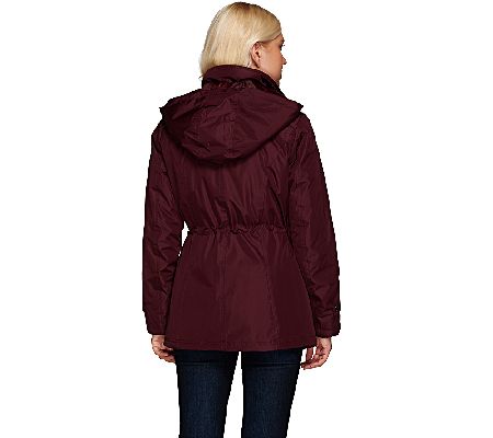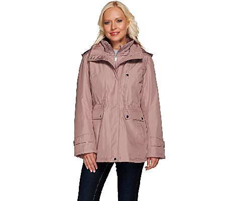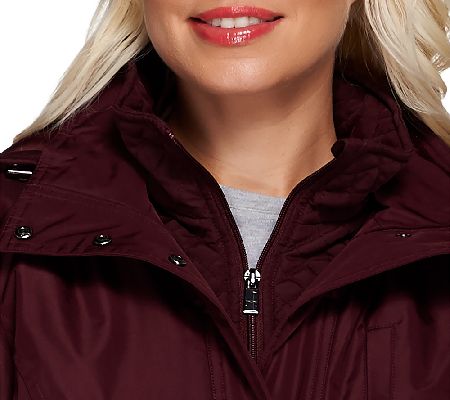 Embrace mother nature. This stylish Liz Claiborne New York anorak coat is fashionable with a quilted collar and plaid lining, yet practical with a removable hood, multiple pockets, and an adjustable waist tab. Perfect for a chilly day. From Liz Claiborne New York.