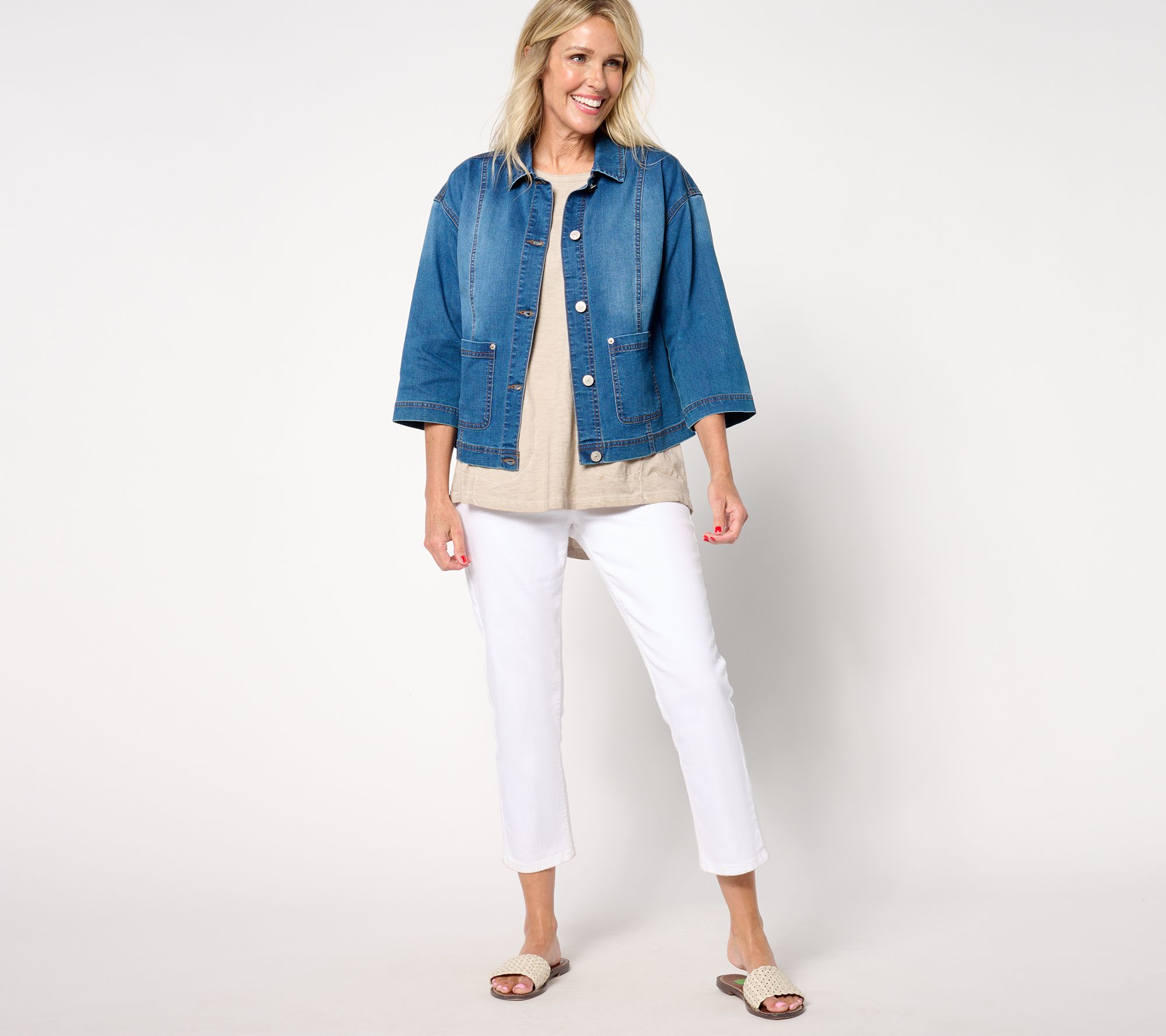 A relaxed fit denim jacket? Sounds like layering heaven to us! And with Lori Goldstein's designer touches (like princess seaming for flattering structure), this go-everywhere style maintains an elevated vibe, making it a natural partner to both everyday tees and fancy-ish dresses. (Love that look!) From LOGO by Lori Goldstein®.