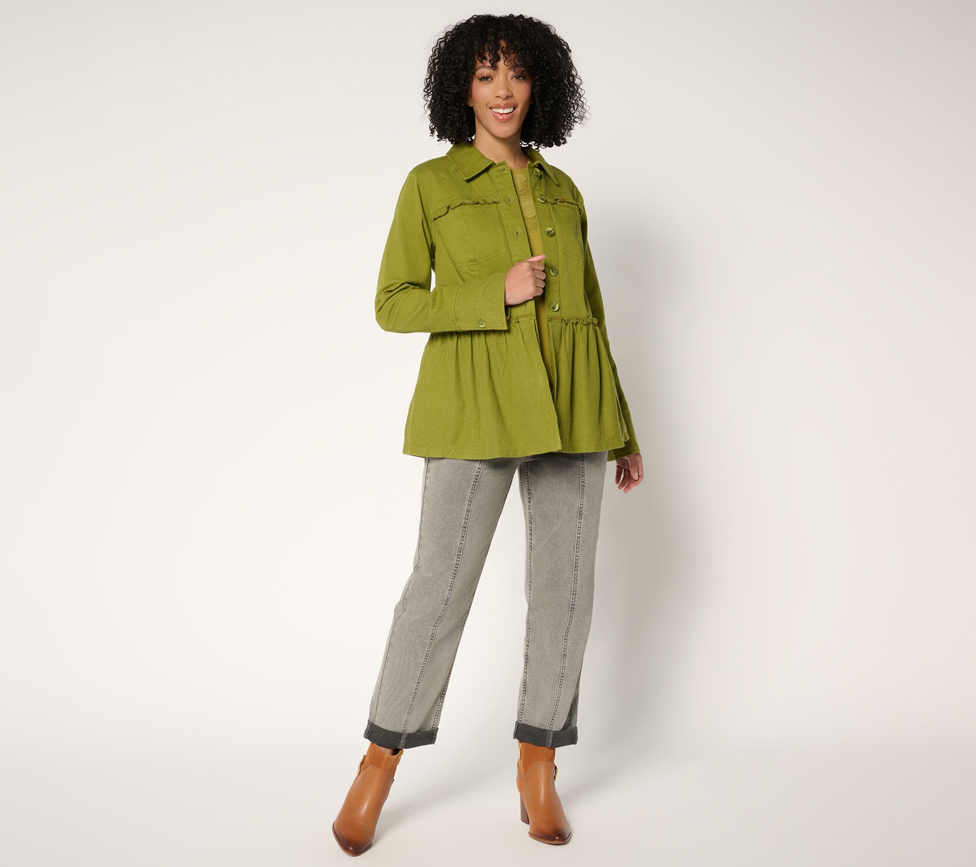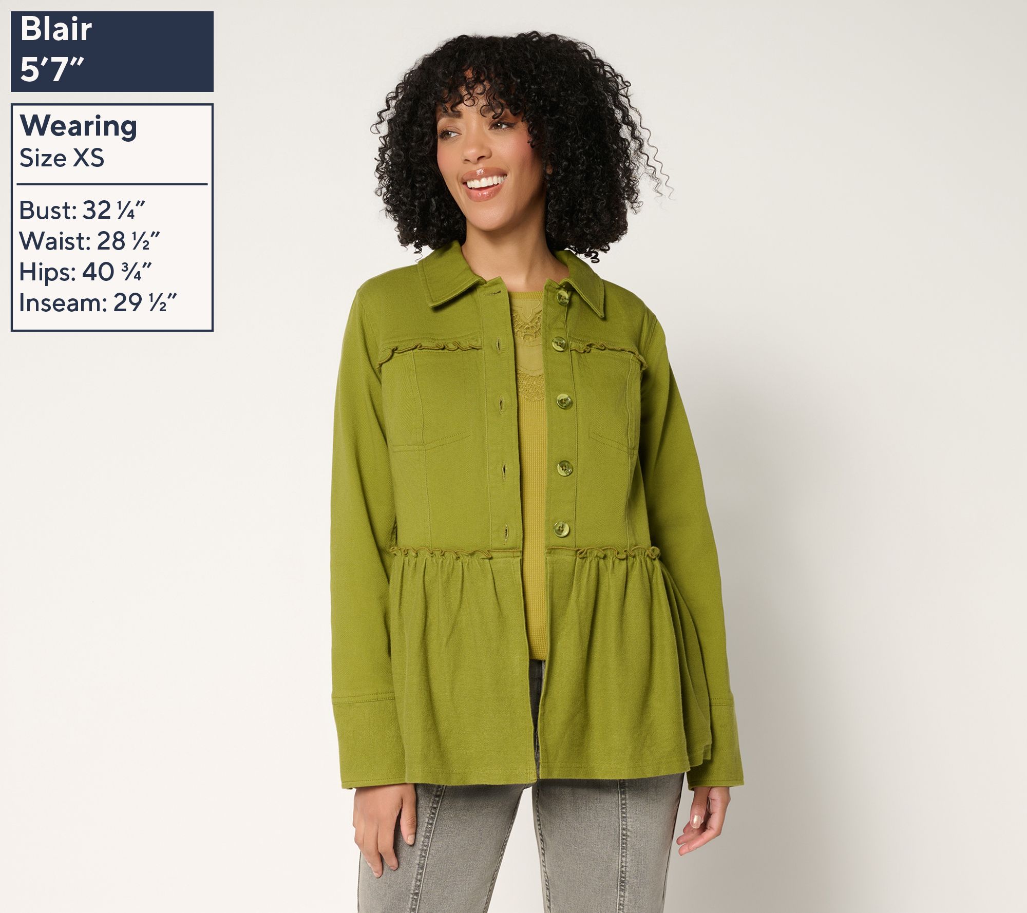 A morning at the market or an afternoon coffee run feels instantly more stylish when you slip into this peplum jacket. Its mix-media design and playful ruffle details create a flattering silhouette that adds interest to any casual outfit. From LOGO by Lori Goldstein®.