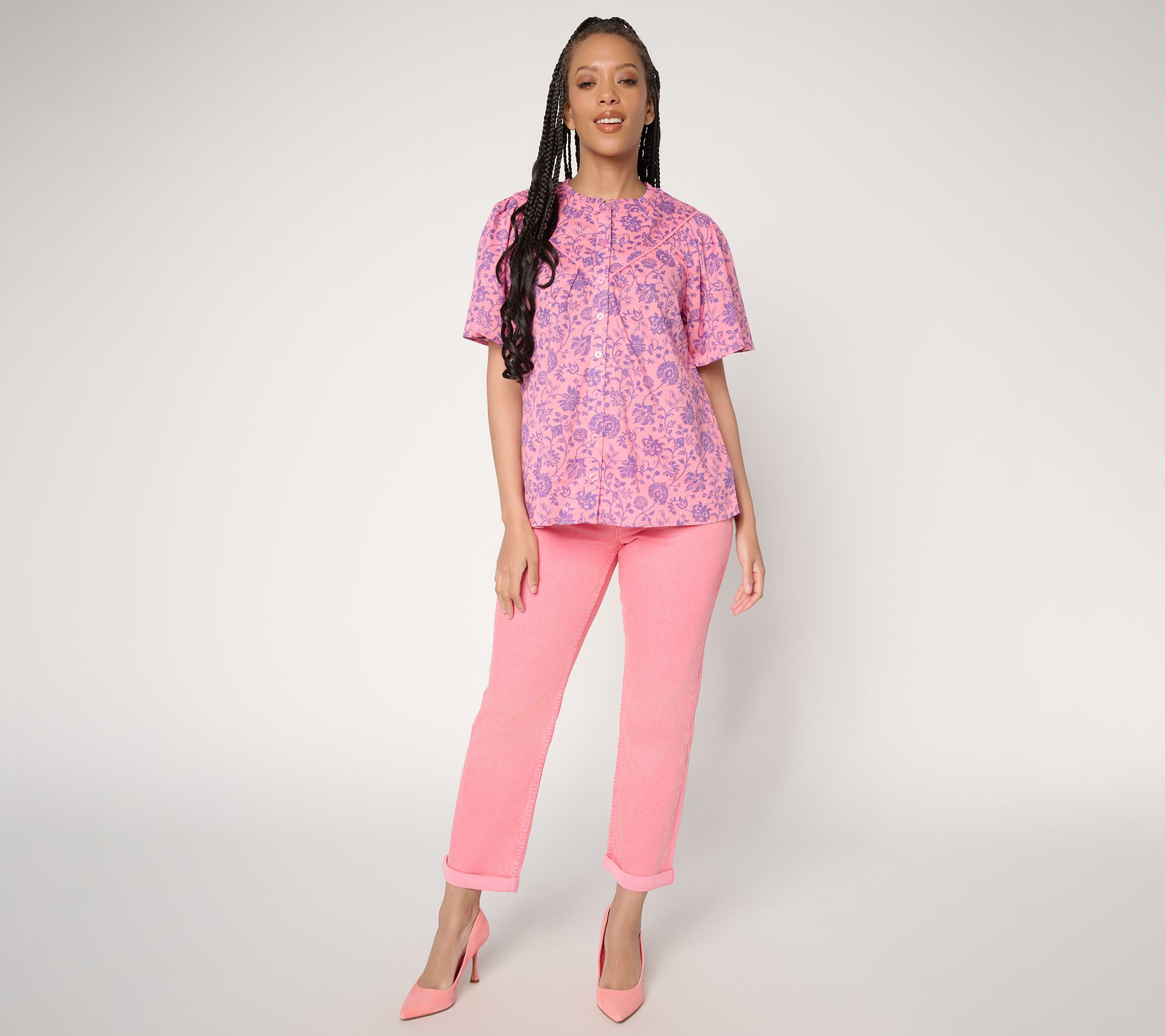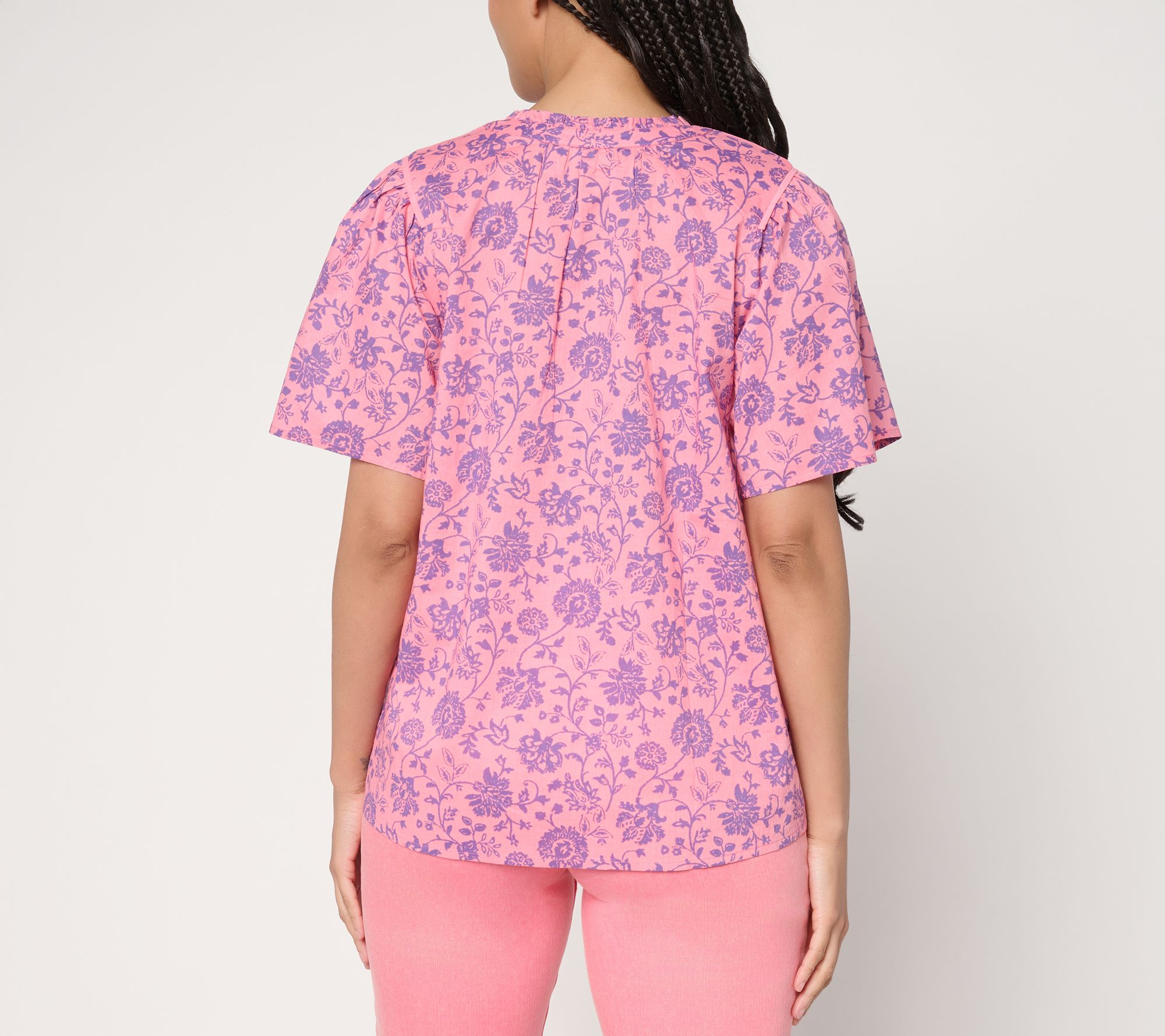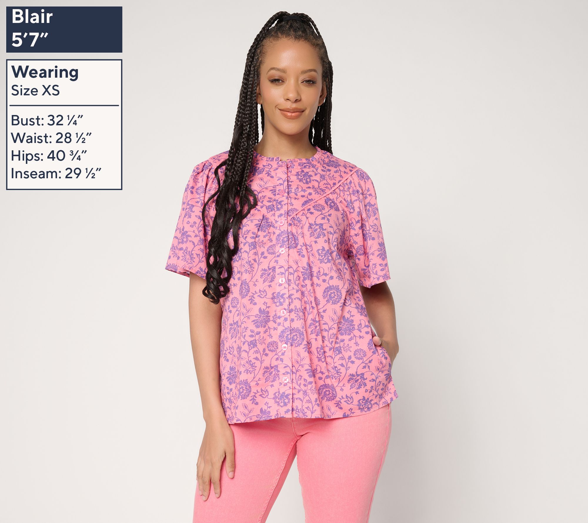 Stroll through sunny days or breeze into afternoon lunch plans in this airy cotton blouse, complete with a playful print and sweet details like a ruffled collar and shirring. Raglan sleeves and an angled yoke create easy movement, while the relaxed fit feels comfortable all day long. From LOGO by Lori Goldstein®.