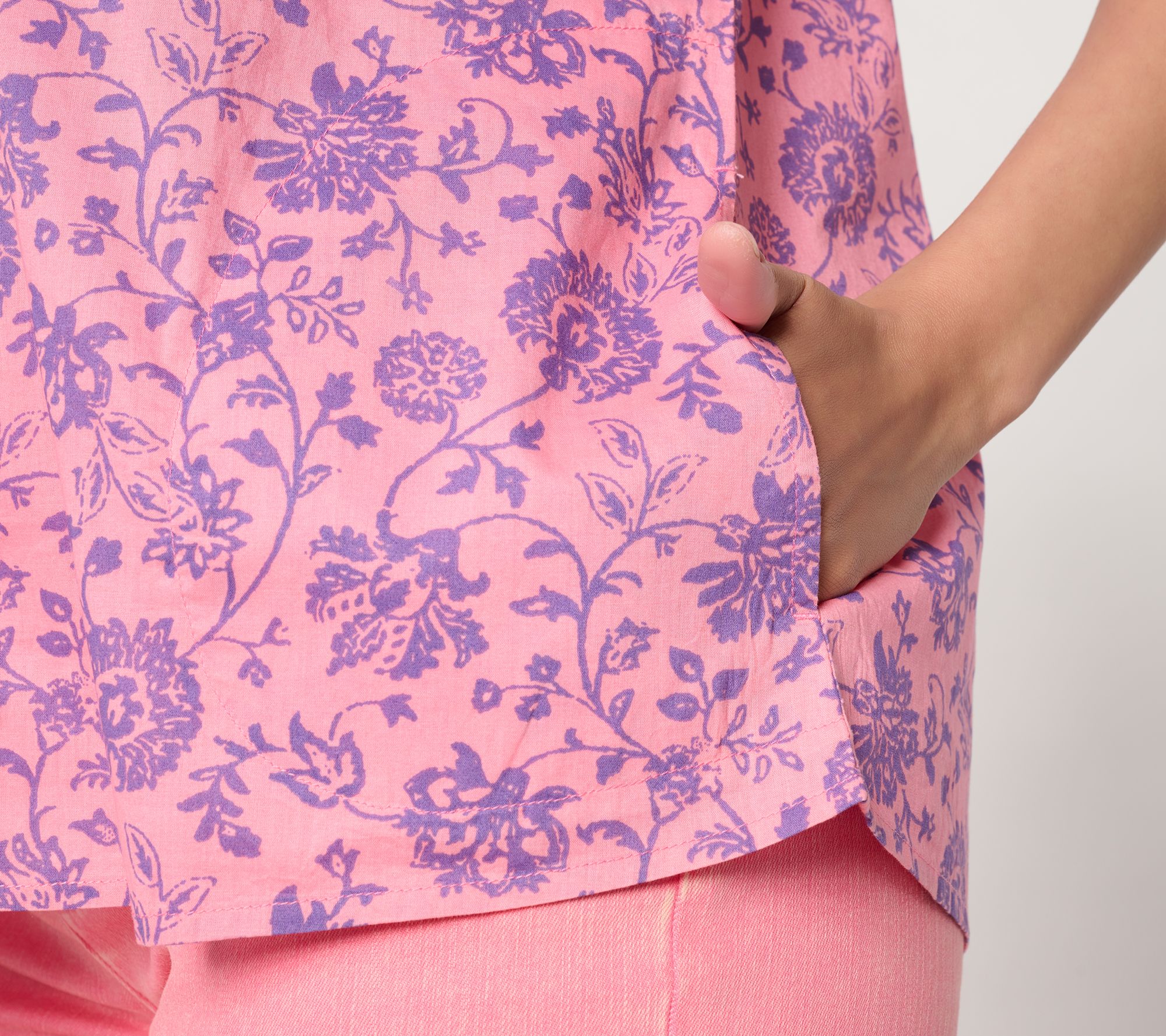 Features: printed, 1/2-length sleeves, raglan armholes, angled and shirred front yoke, collar band with ruffle, button-front closure
