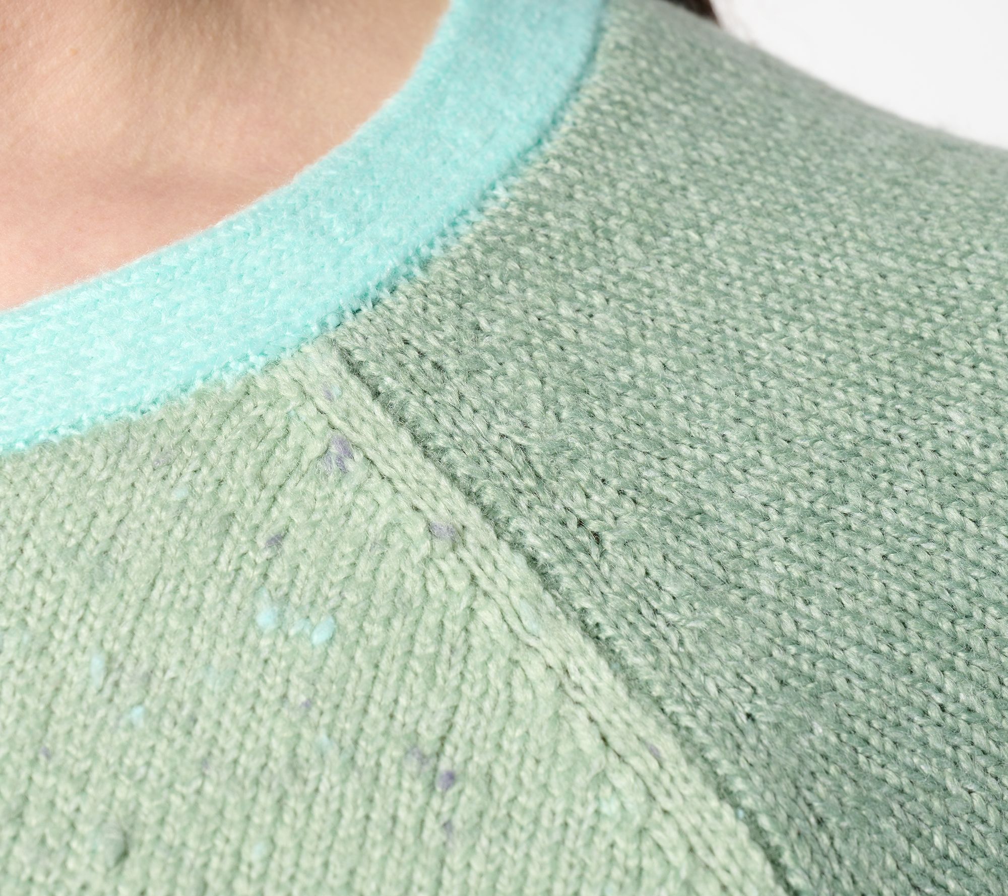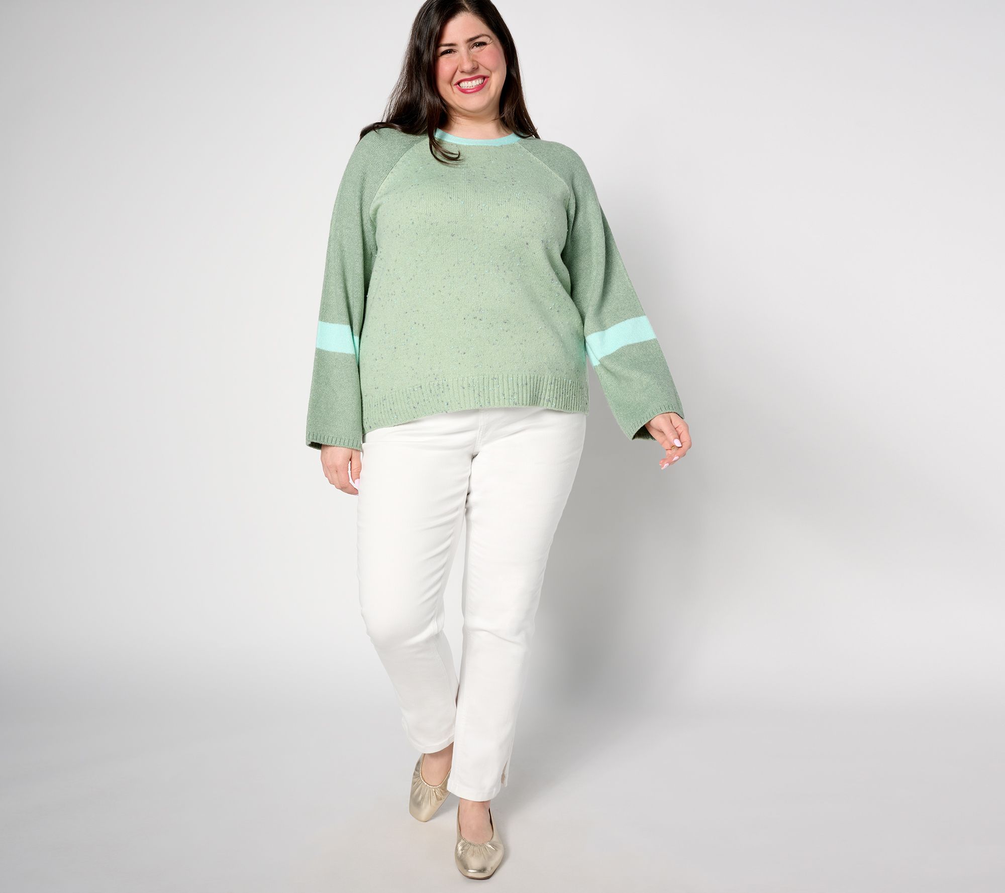 This lovely boat-neck sweater stands out with color-blocking details and bell sleeves. From LOGO by Lori Goldstein®.