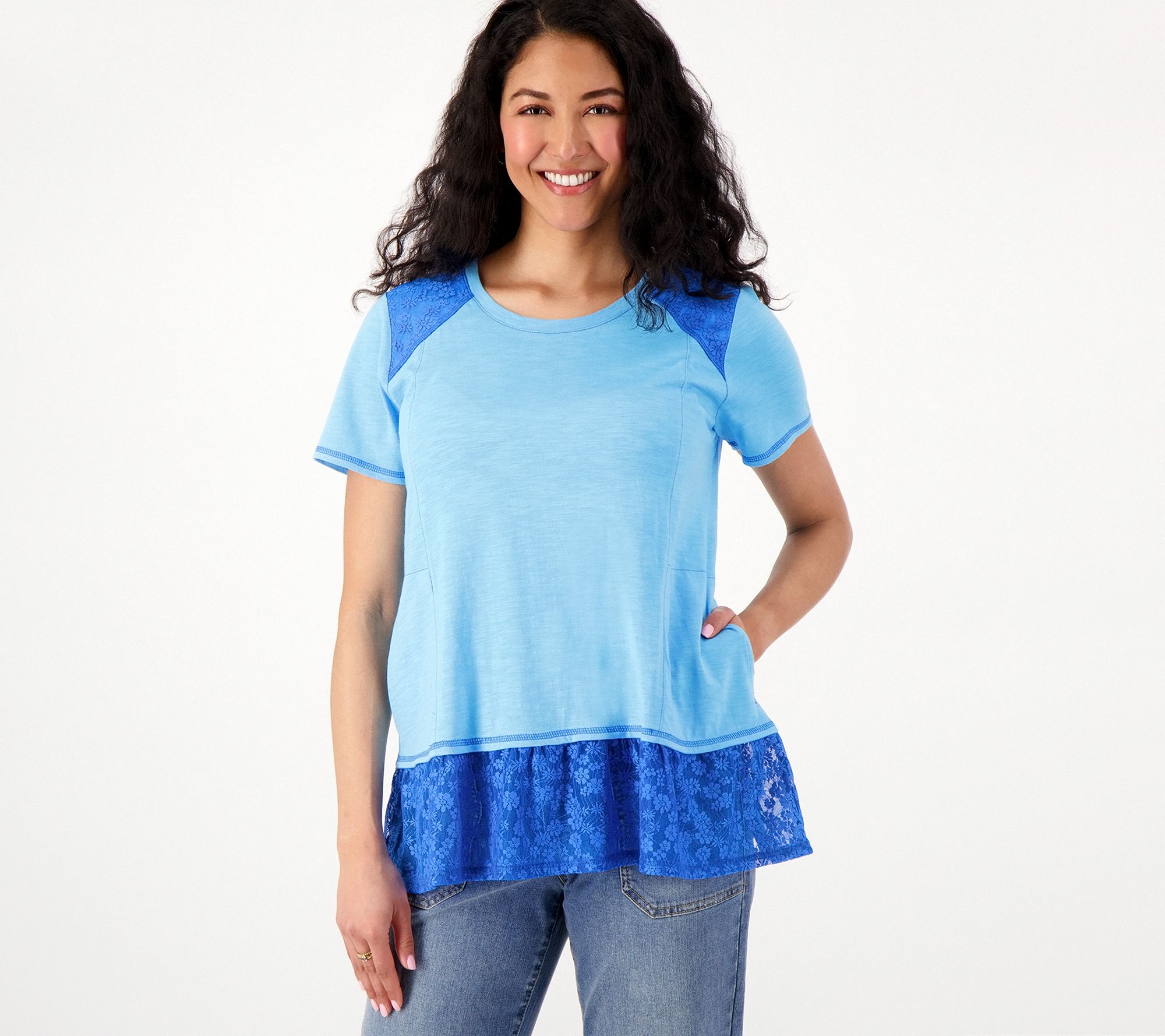 • Features: scoop neckline, short sleeves, on-seam pockets, lace trim detail at front and back yoke and bottom hem