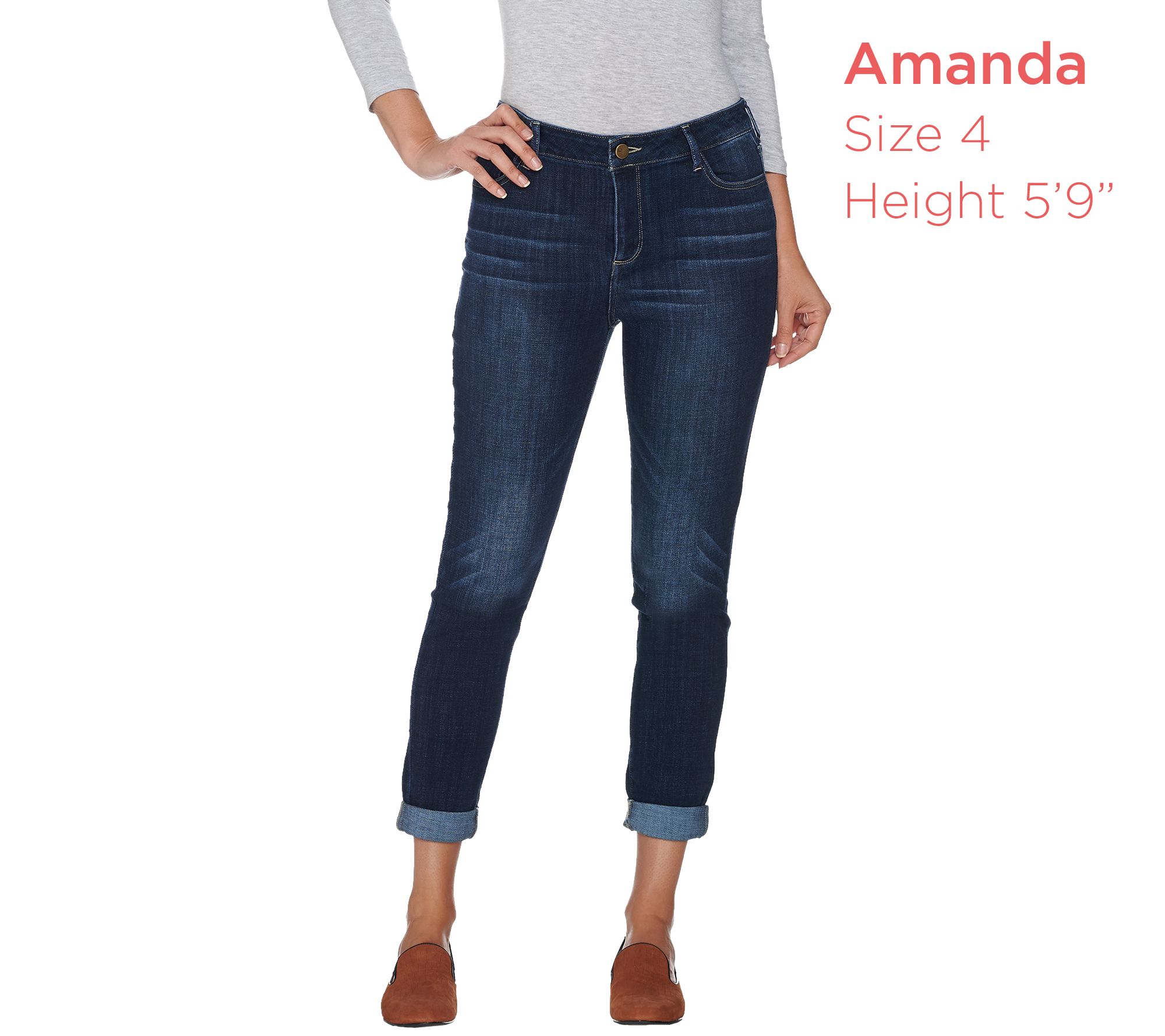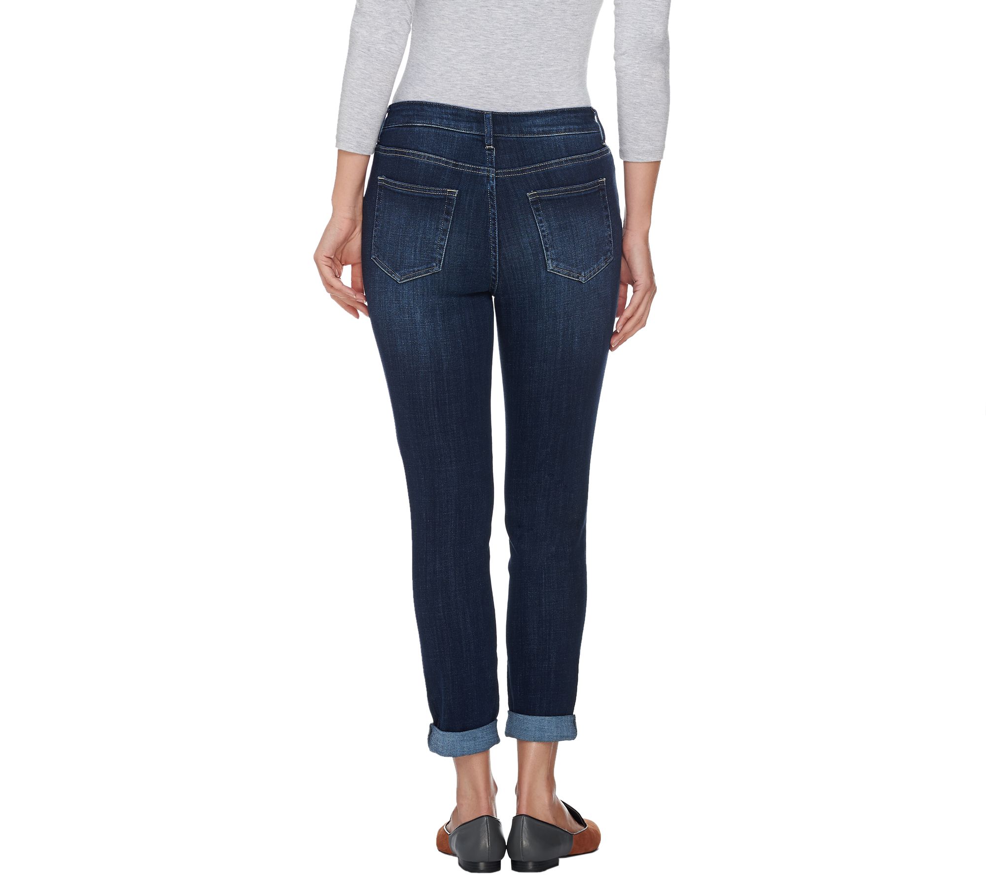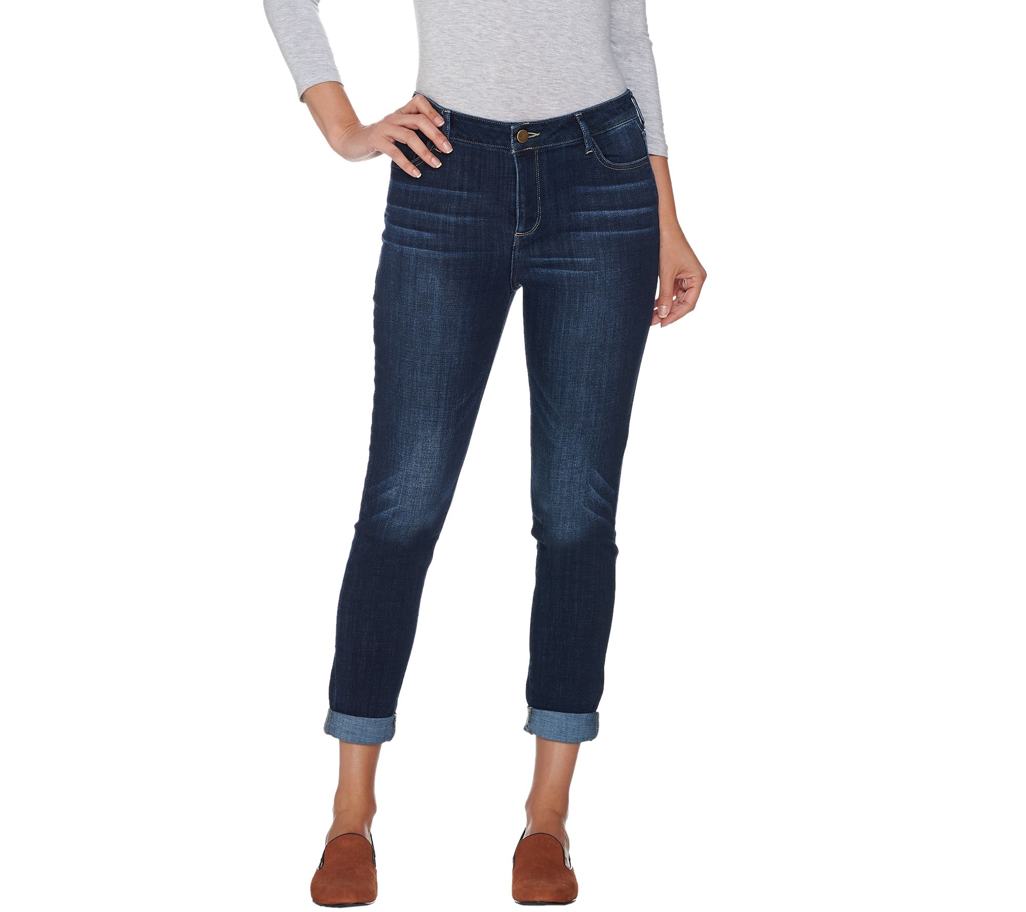Get that lovable, lived-in look and feel with LOGO's distressed jeans. Classically designed with five pockets, belt loops, and a zip-front fly, this standard style gets updated with a distressed look and rollable cuffs at the hem. From LOGO by Lori Goldstein.