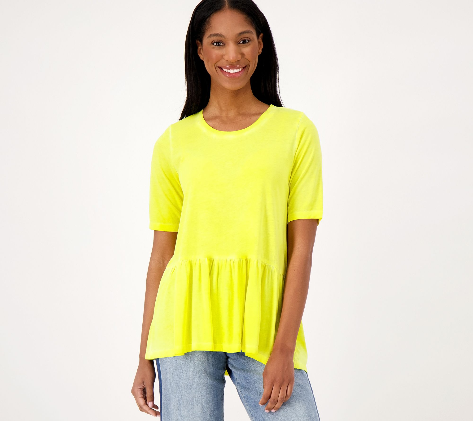 • Features: scoop neckline, peplum, distressed wash, elbow-length sleeves