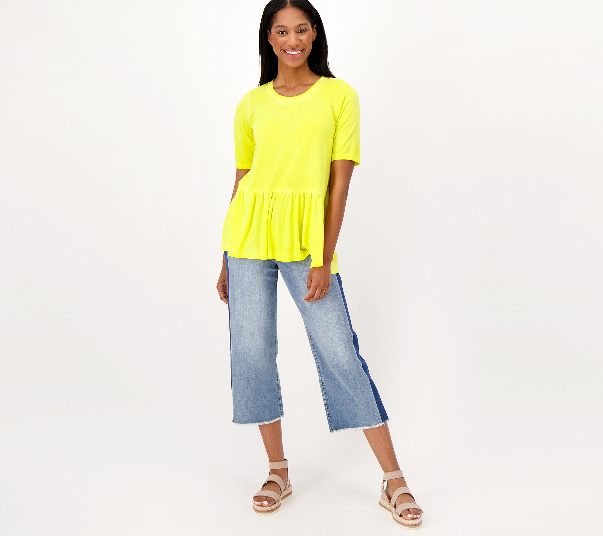 With a pop of peplum swing, this sweet cotton modal top brings movement to your wardrobe -- jazzing up your distressed denim or your comfy pull-on capris for that quick trip out or lounge day in. From LOGO by Lori Goldstein®.
