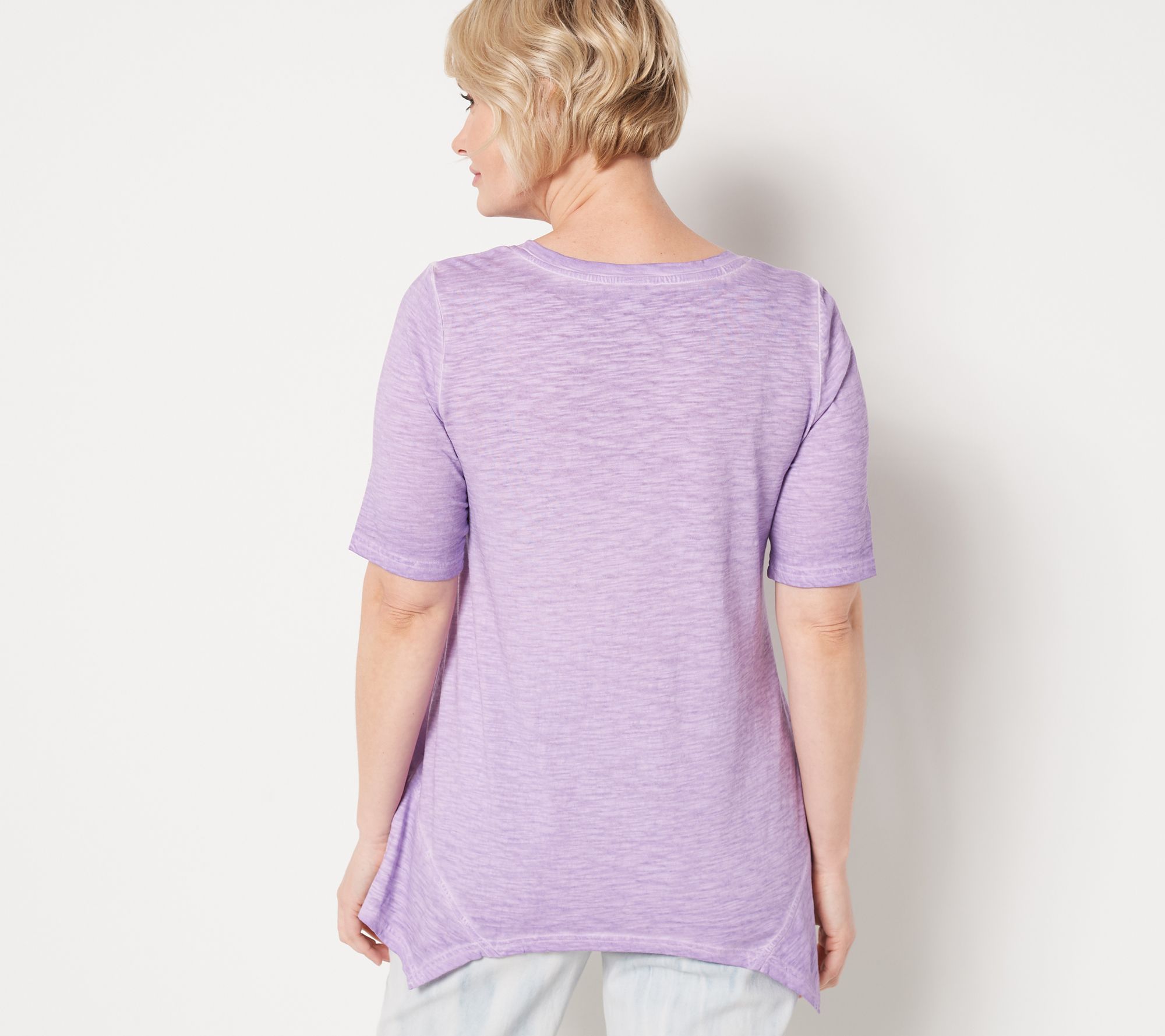 • Features: split crew neckline, distressed wash, elbow-length sleeves