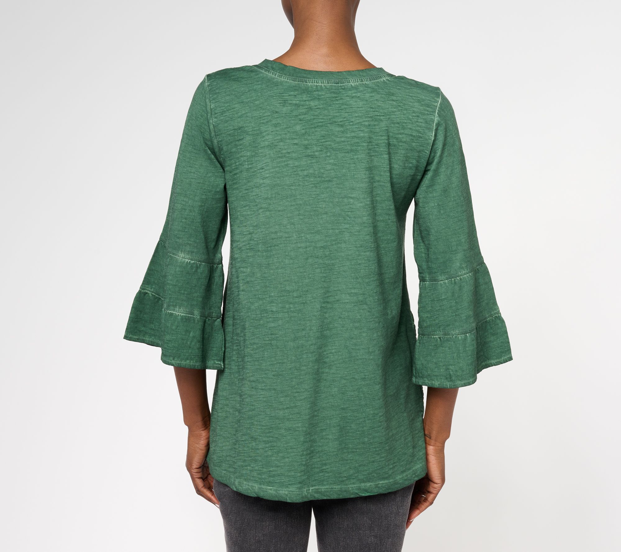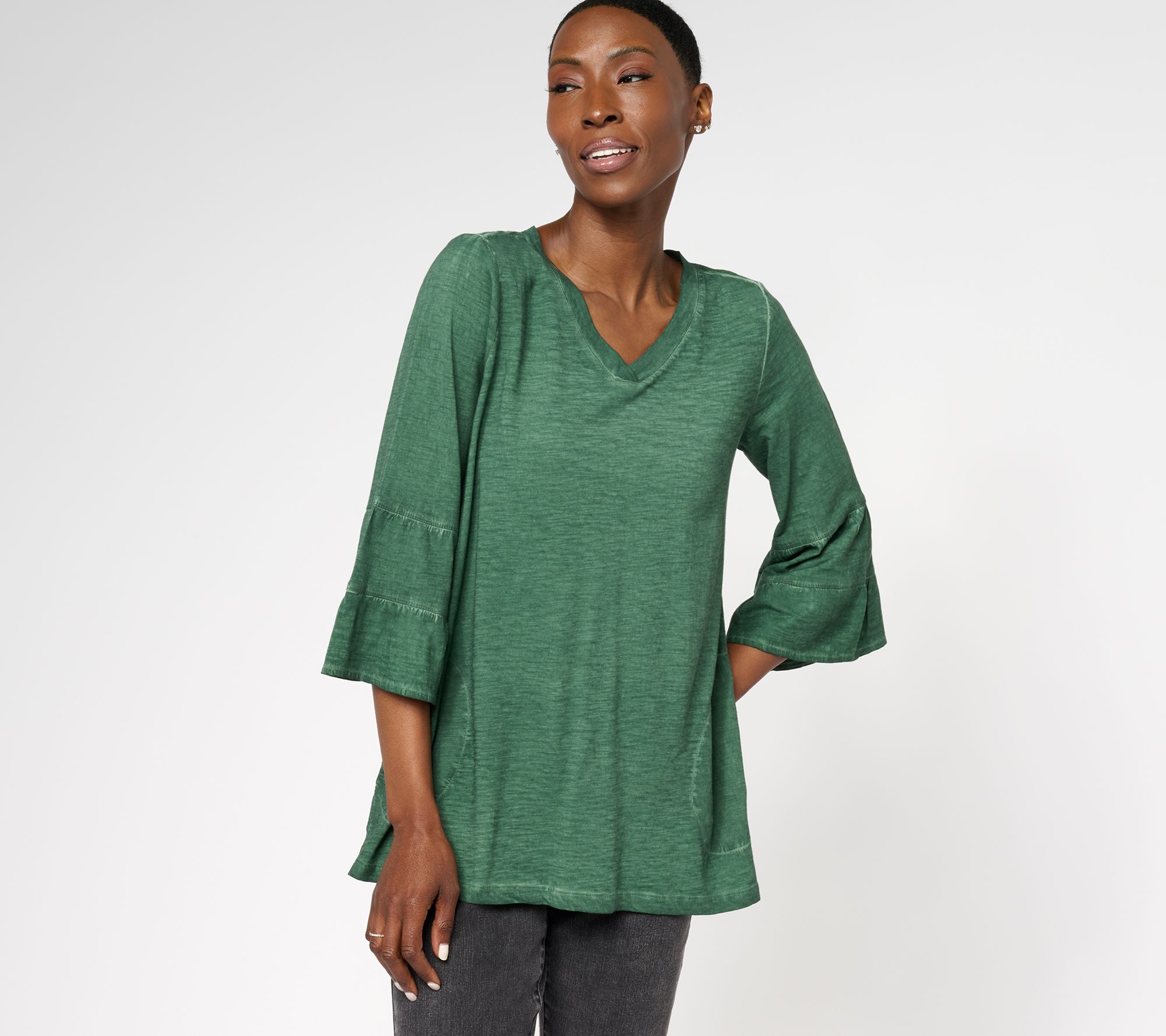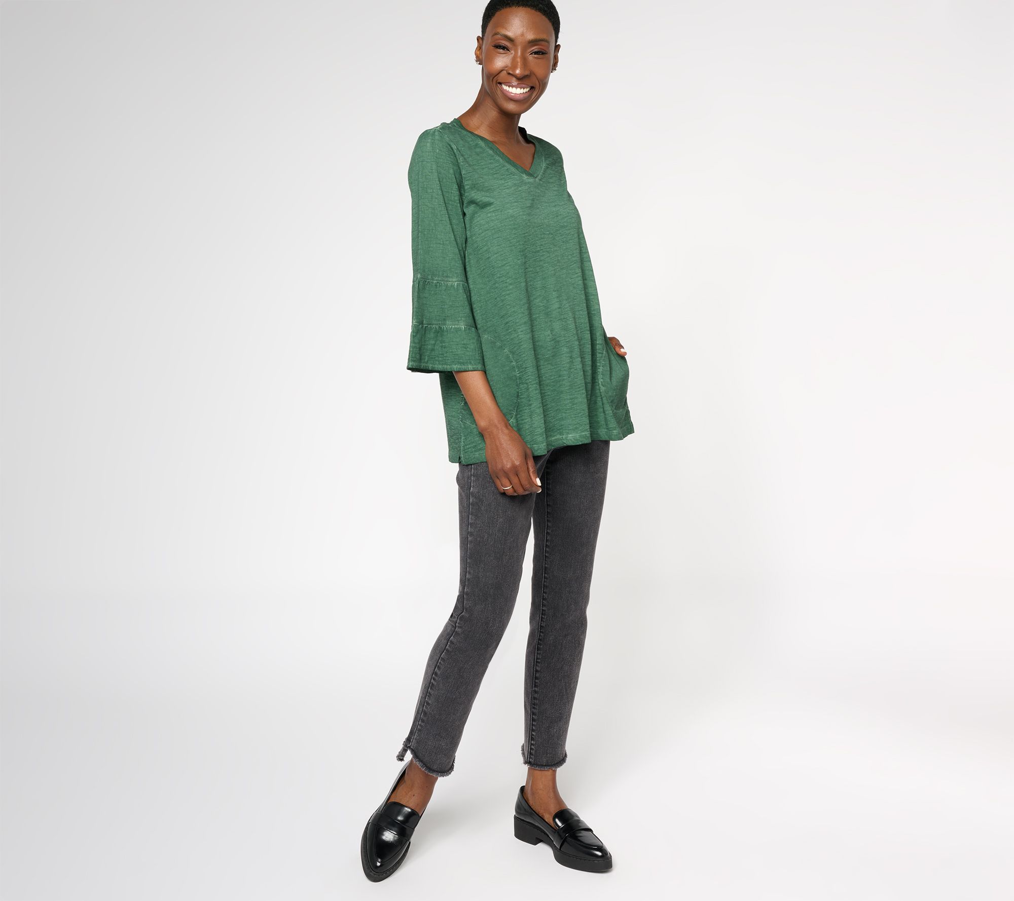 • Features: V-neck, 3/4-length sleeves, on-seam pockets, tiered style