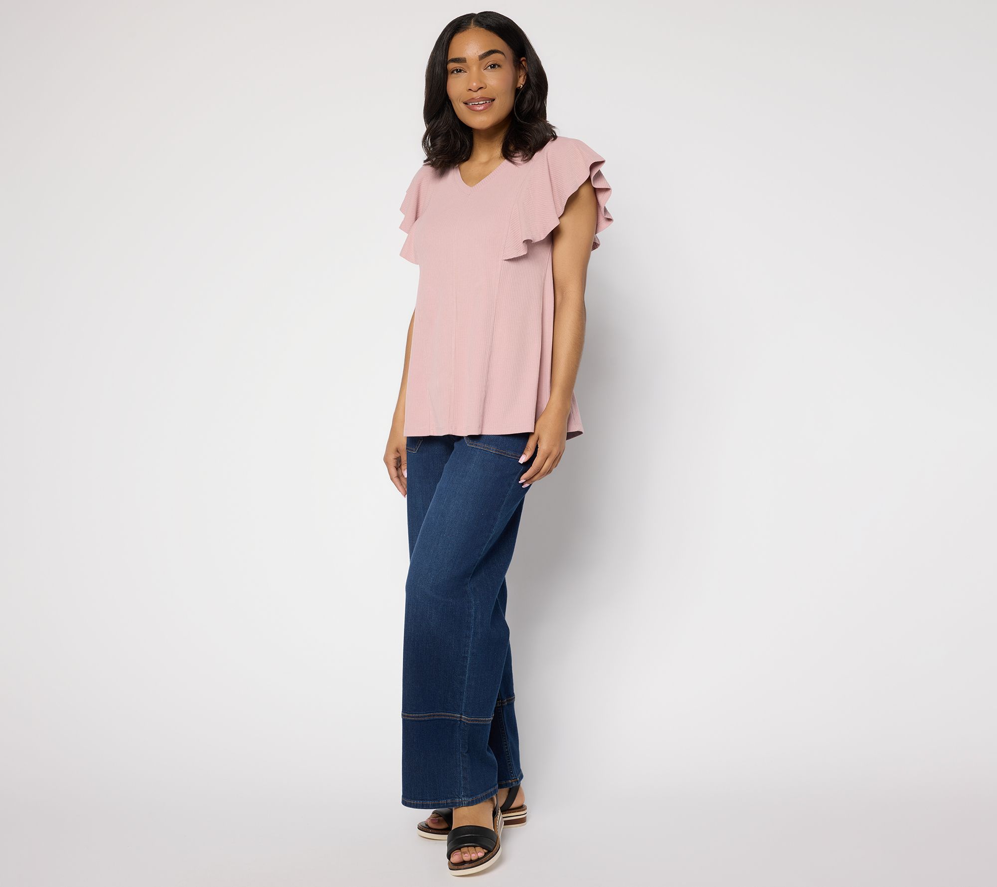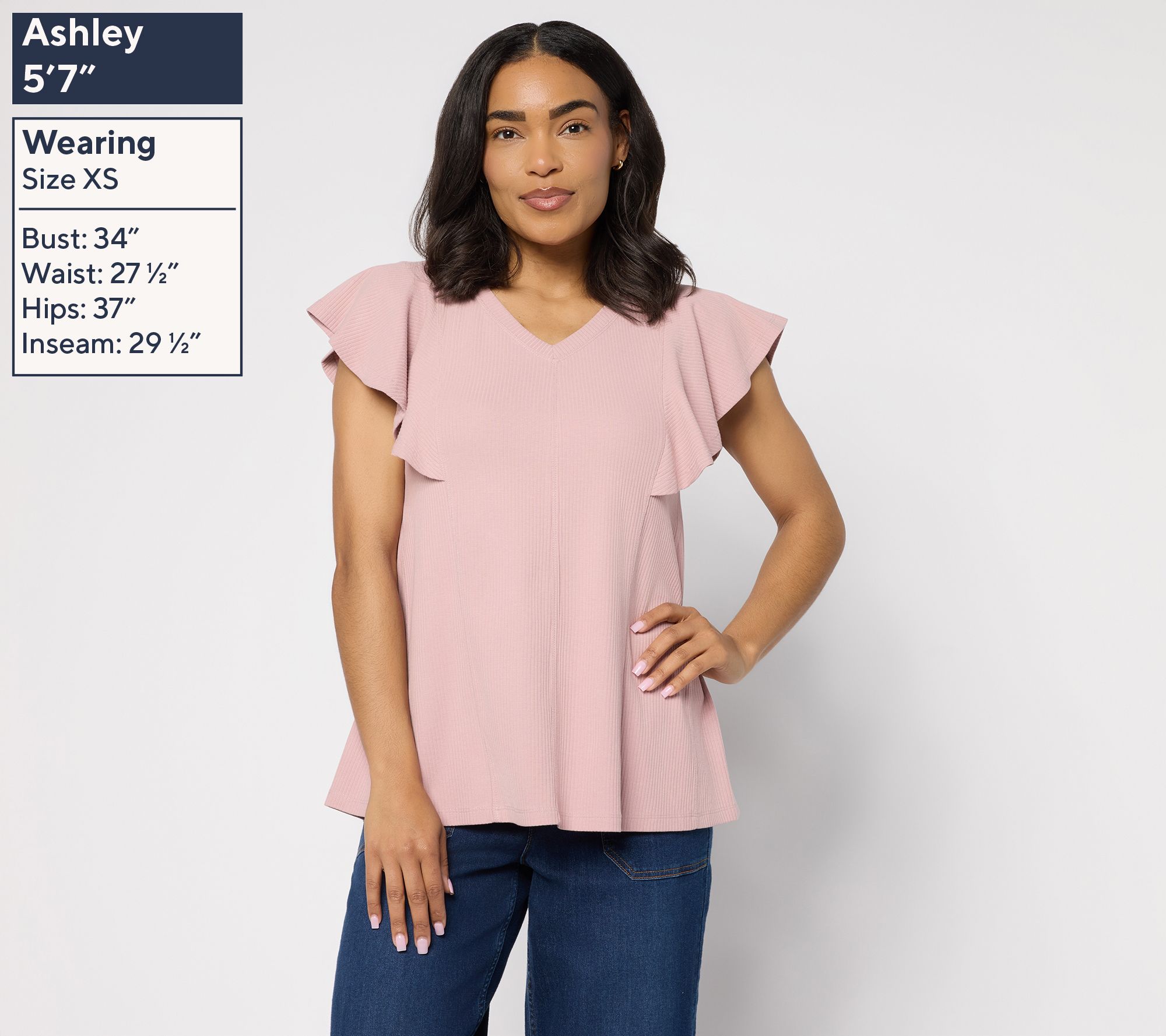 Feminine elegance at its finest, this flutter-sleeve top takes your look next level whether you're dressing it up or keeping it casual. A ribbed texture and flattering V-neckline further elevate this soon-to-be favorite. From LOGO by Lori Goldstein®.