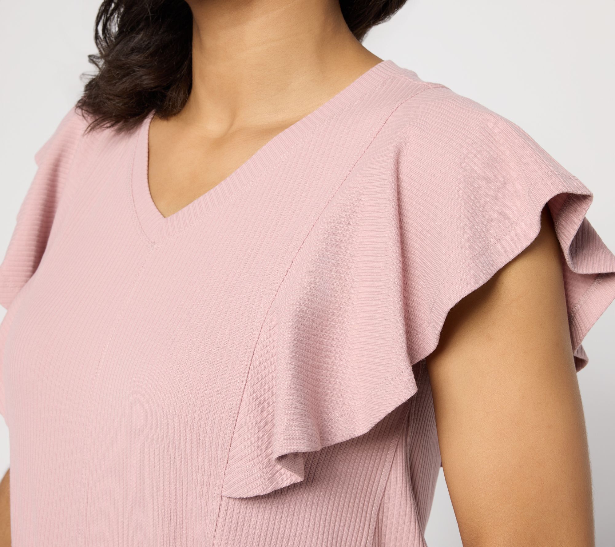 "As Is" LOGO by Lori Goldstein Flutter Sleeve Knit Ribbed V-Neck Top