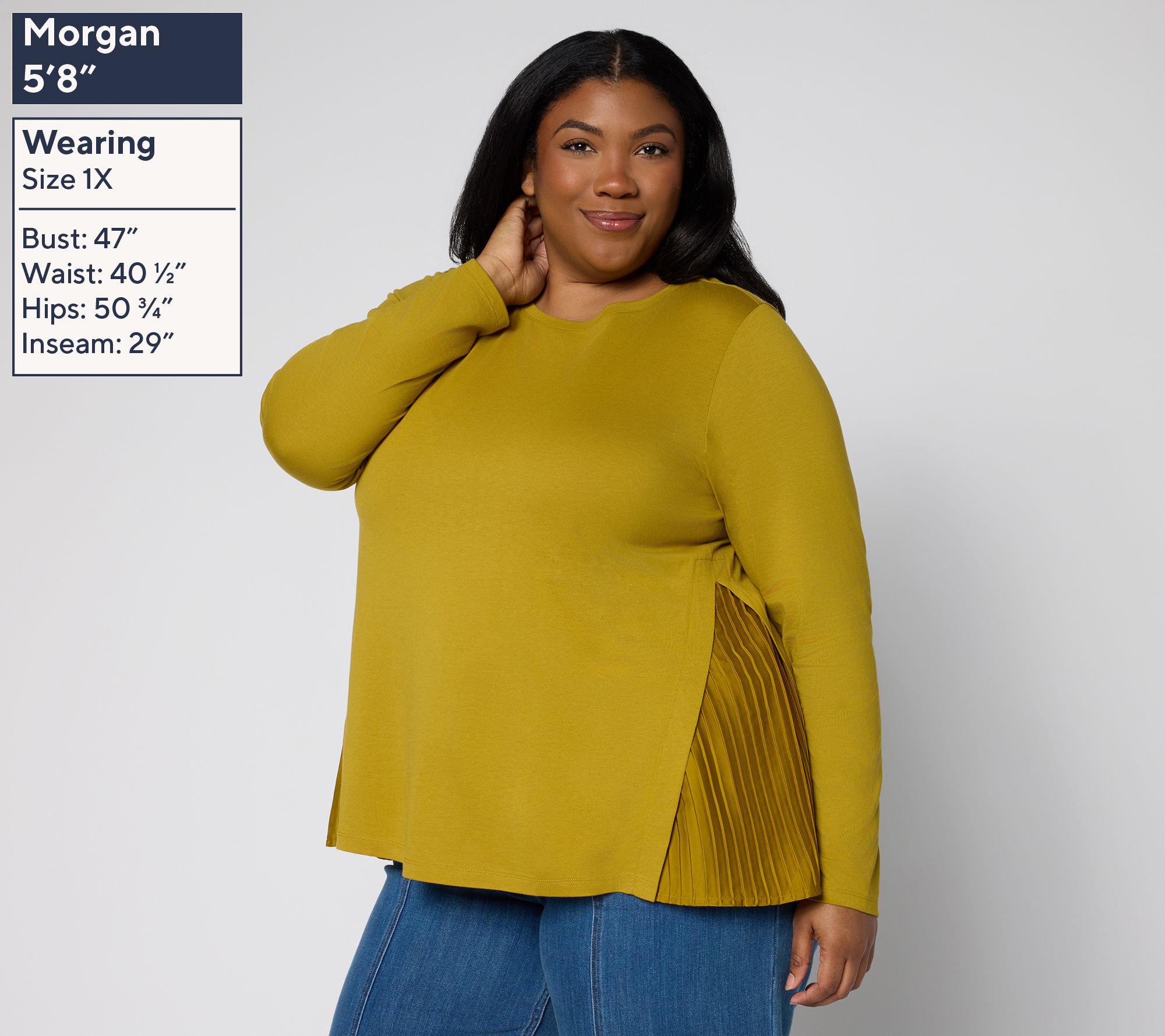 • Features: long sleeves, pleated godet inset at side seams