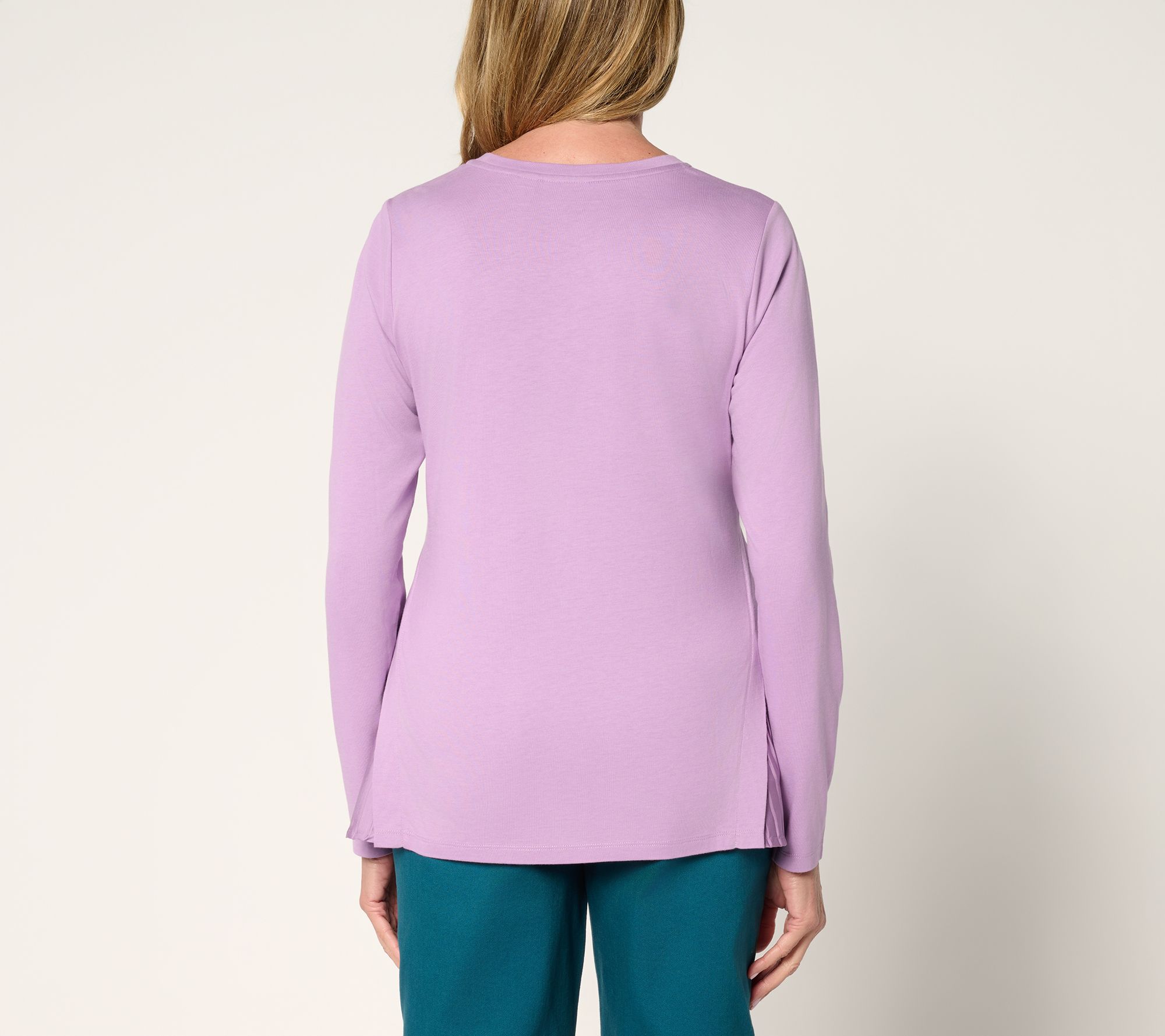 Godet, all day. Transition comfortably from a busy day to a casual evening with this LOGO long-sleeve tee, designed with sweet side pleat insets that add movement to your look-at-me moment. From LOGO by Lori Goldstein®.