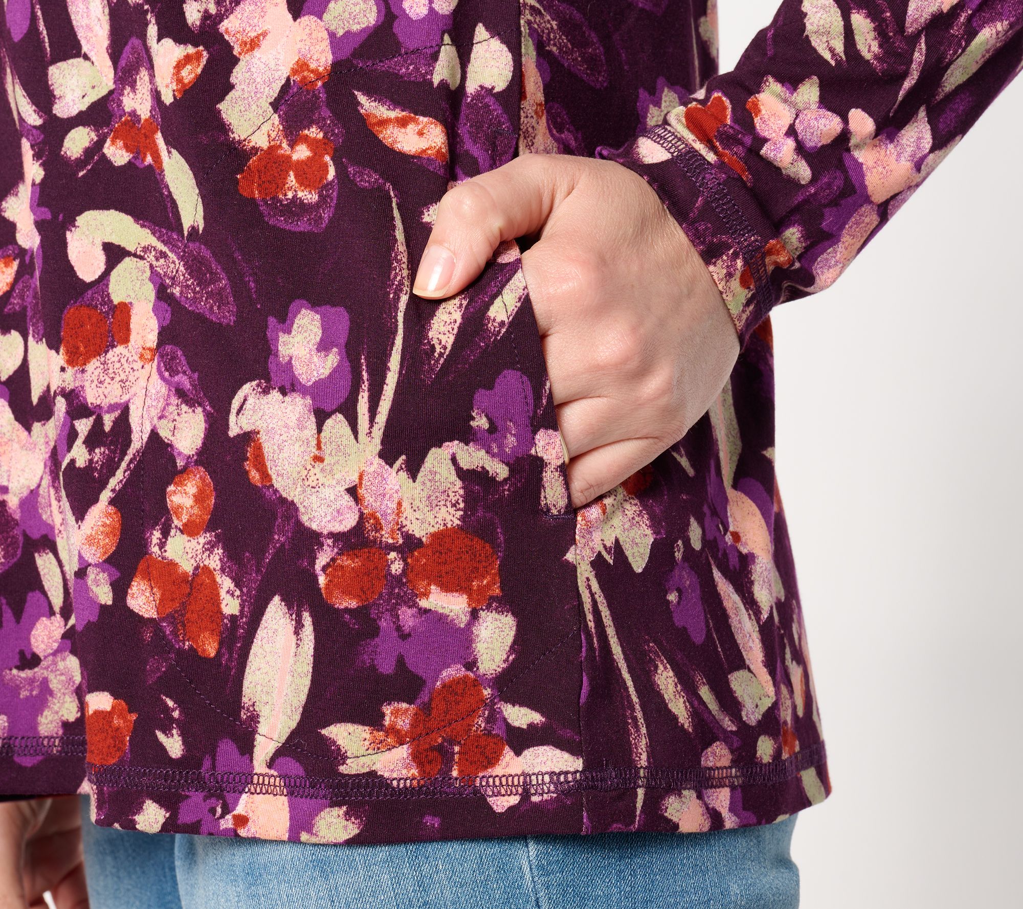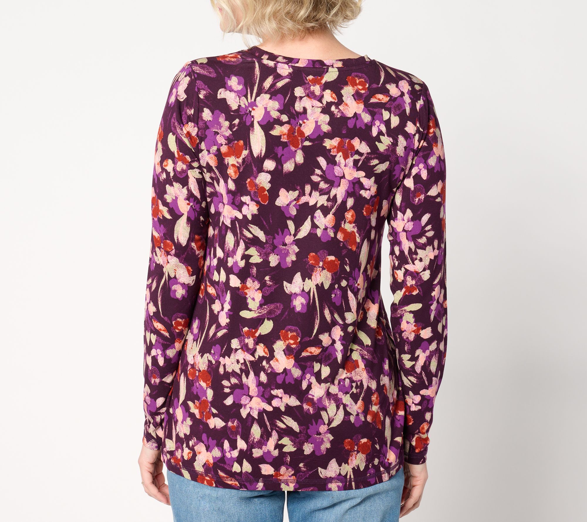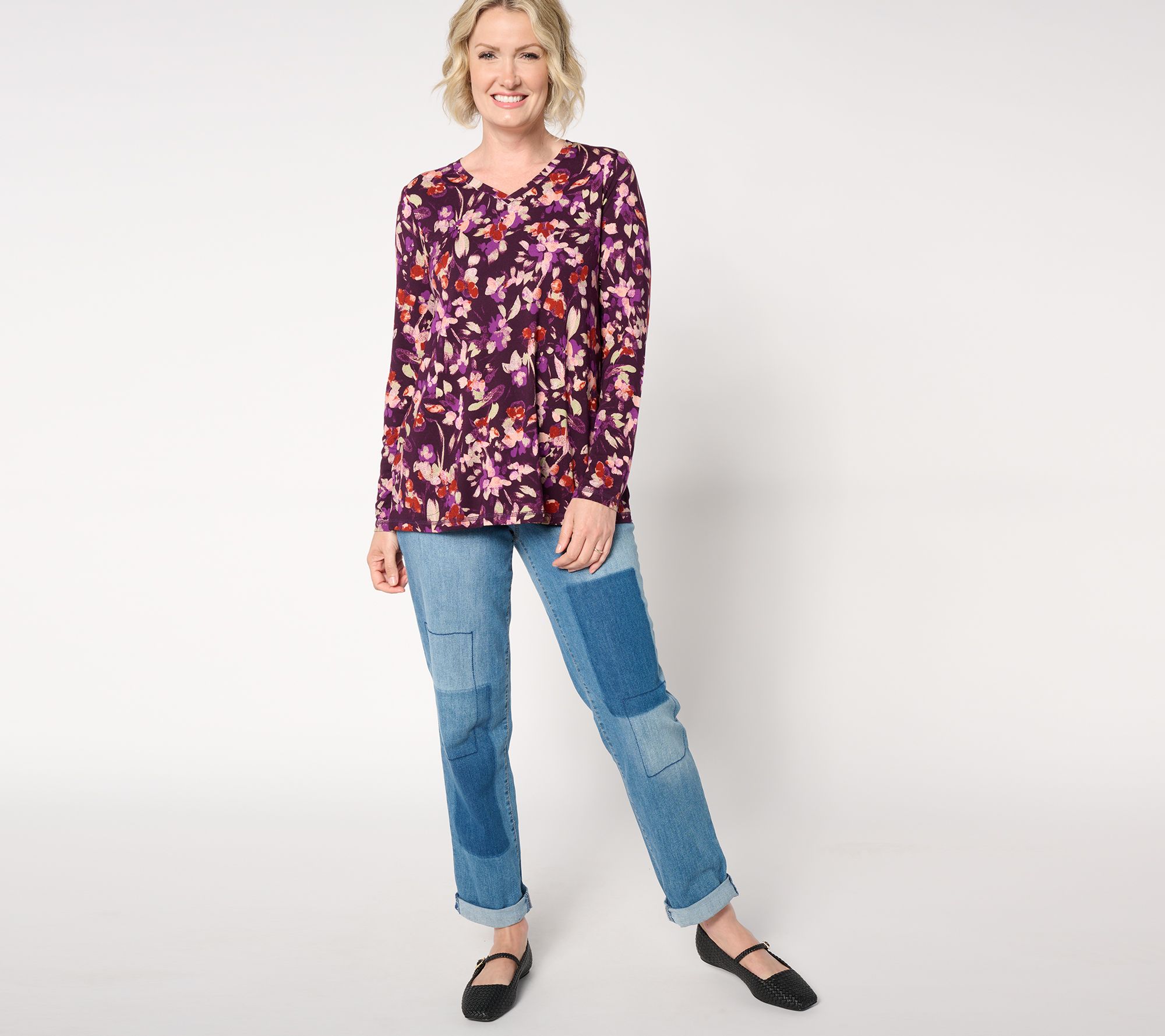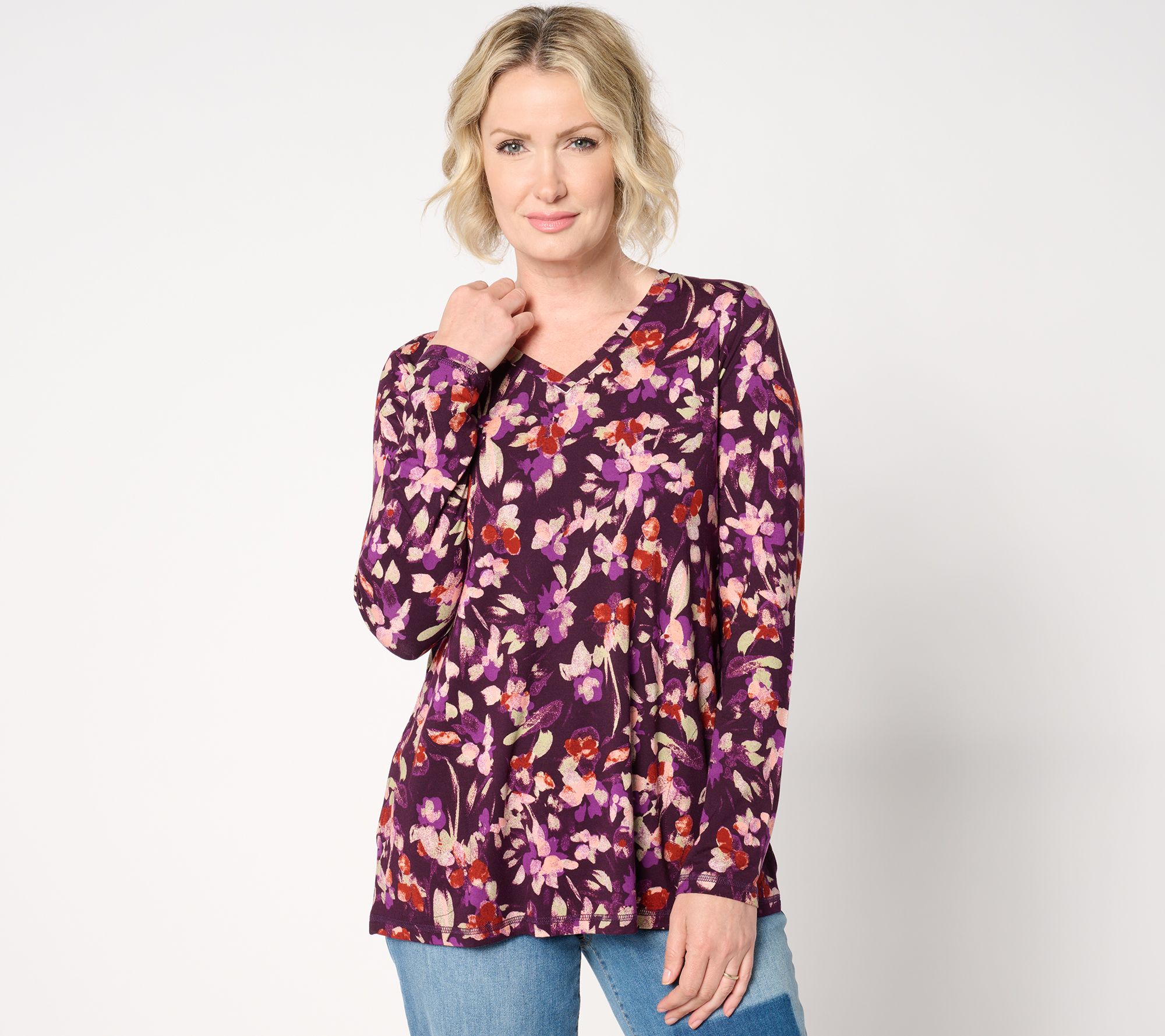 Color us impressed with this floral printed top. Designed with a flattering swing silhouette and functional pockets, this charming V-neck effortlessly combines style and practicality. From LOGO by Lori Goldstein®.