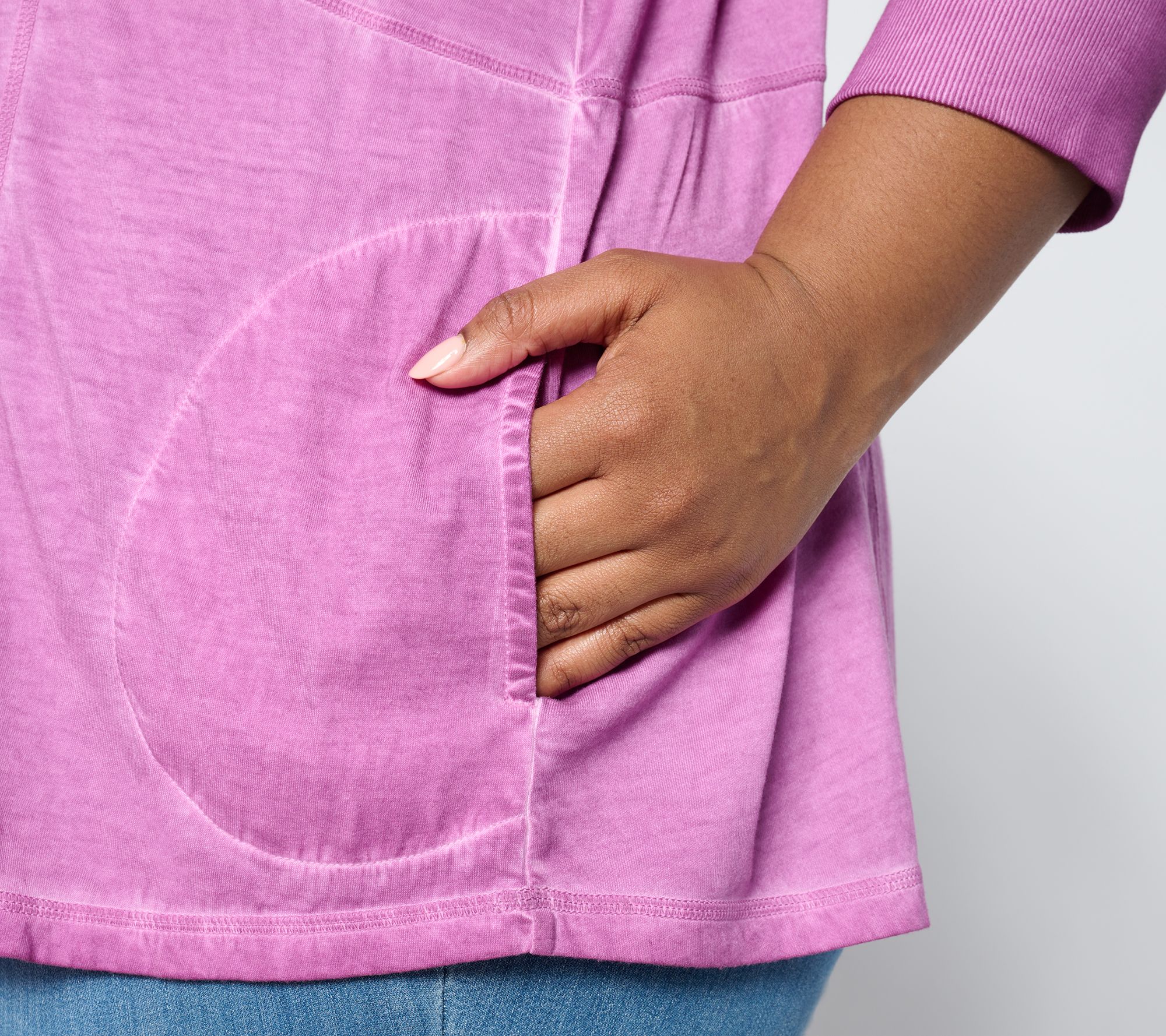 Take your casual style up a notch with this easy-breezy long-sleeve top. A flattering V-neckline placket with peplum design creates an eye-catching silhouette, while side pockets and ribbed cuffs complete the laid-back look. From LOGO by Lori Goldstein®.