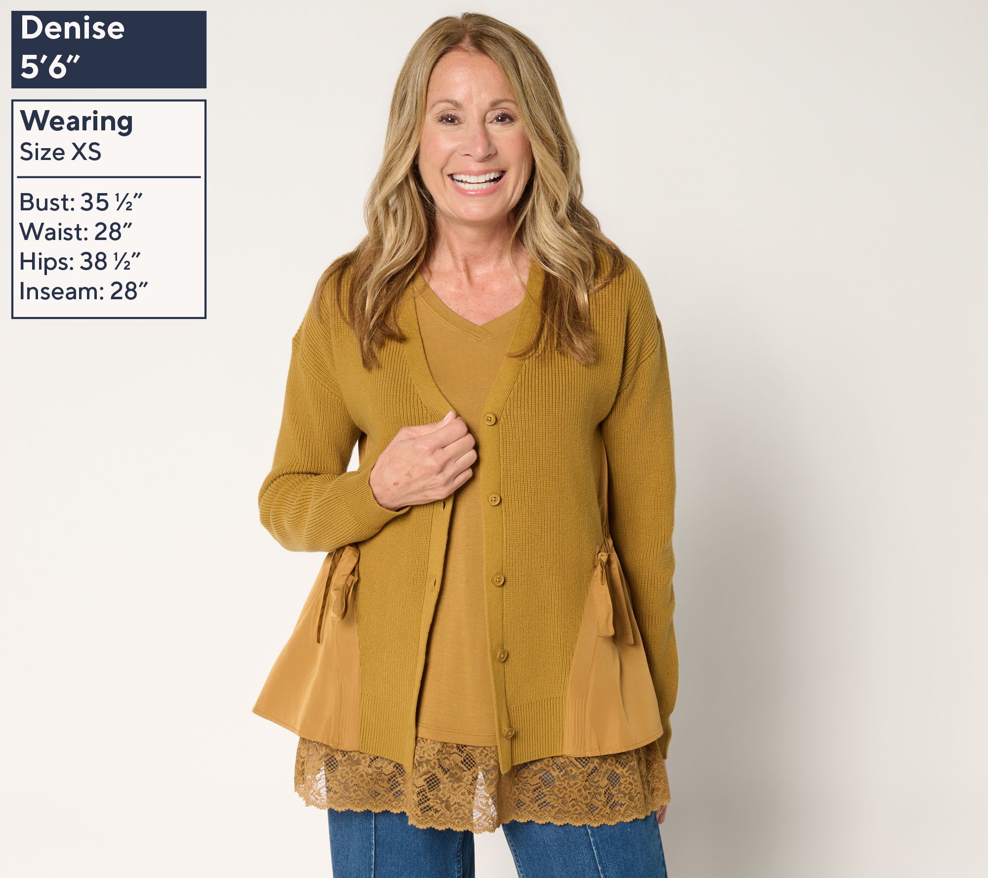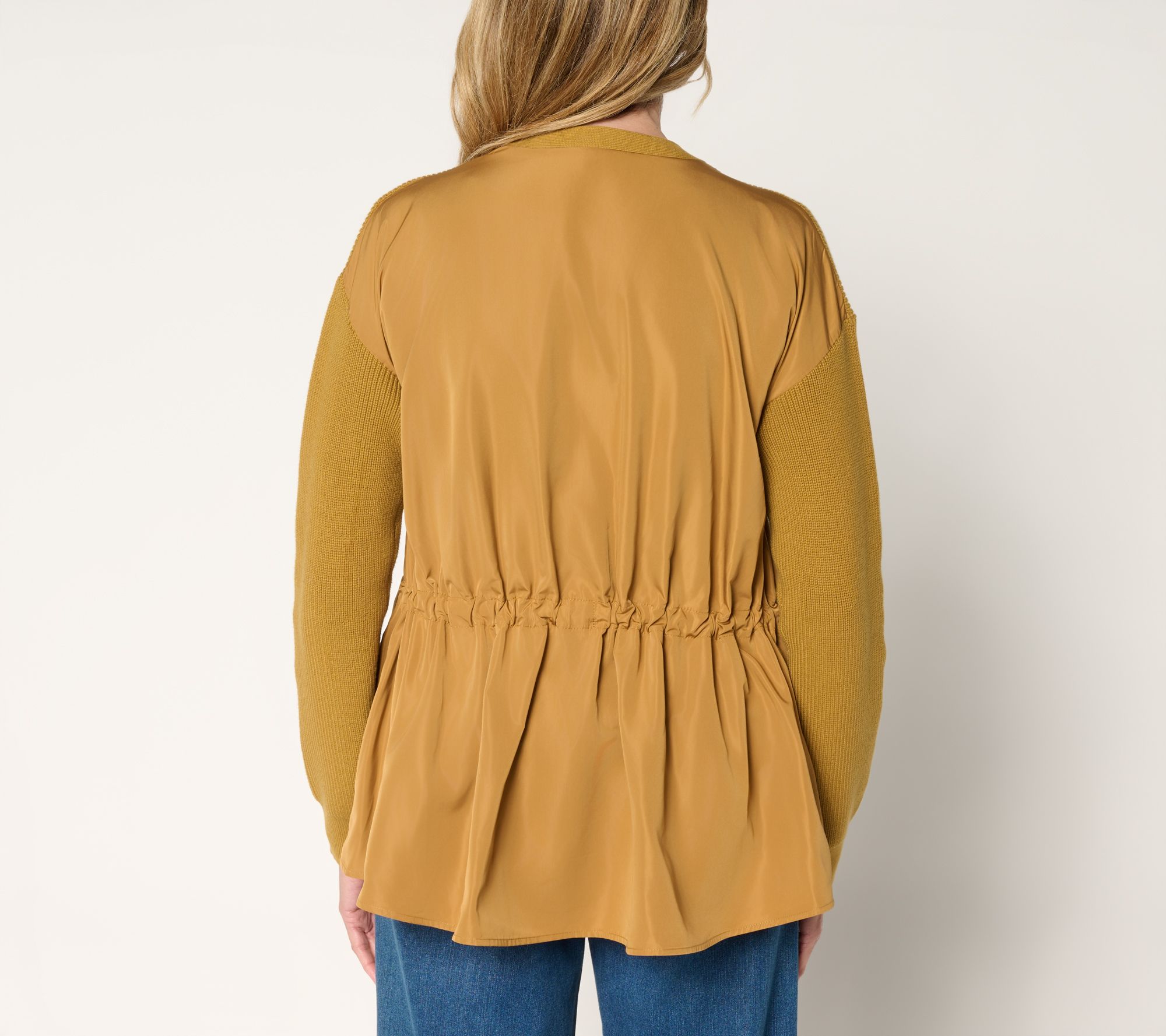Go from weekday errands to dinner with friends in a cardigan that feels as stylish as it does comfortable. The clever combo of cable sweater knit, woven side panels, and an adjustable drawcord back gives this piece an unexpected twist, making it a standout over a simple tee or layered atop your favorite dress. From LOGO by Lori Goldstein®.