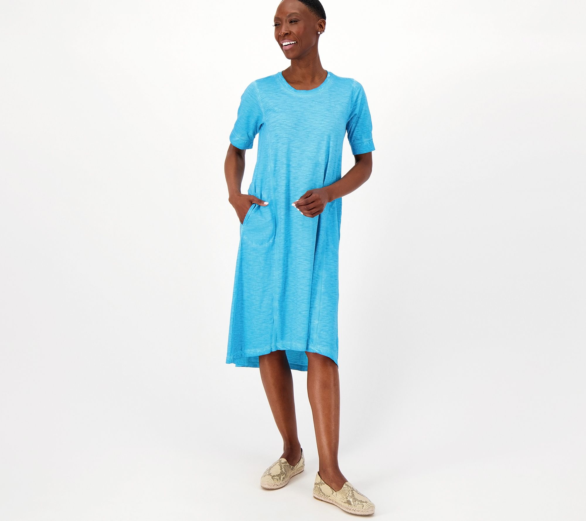 • Features: scoop neckline, elbow-length sleeves, on-seam pockets, distressed wash