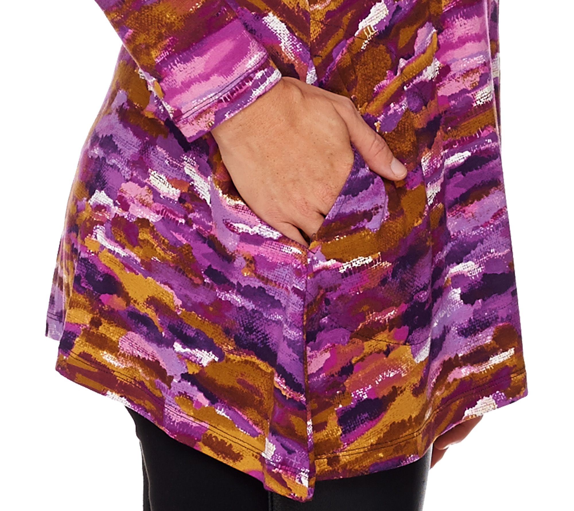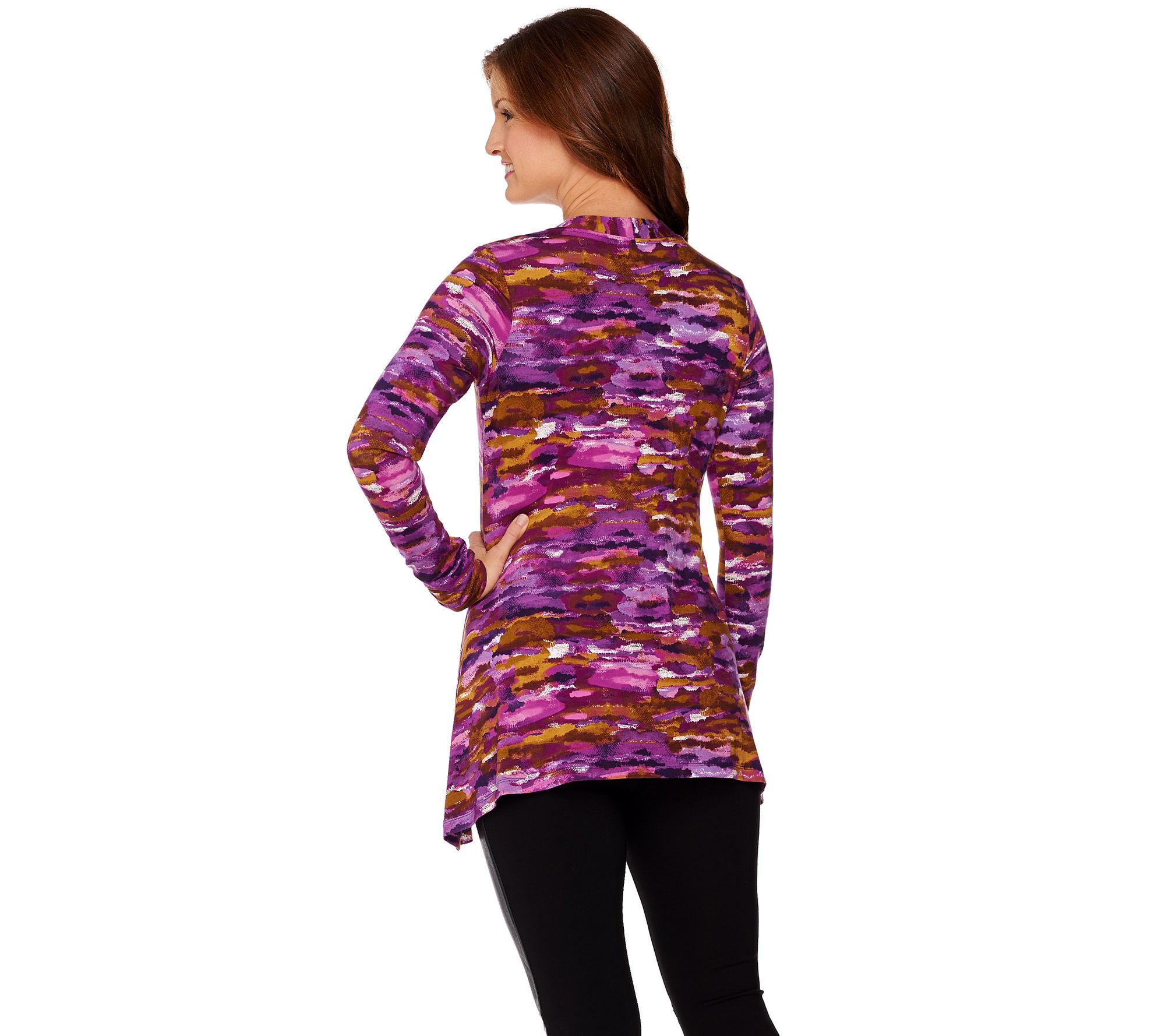 Perk up your cool-weather wardrobe with this printed knit cardigan from LOGO by Lori Goldstein, and give your favorite basics a fresh new look. Perfect for pairing with your solid tops and leggings, this cardigan's flattering cut is semi-fitted up top, with a more flared A-line bottom for effortless, easygoing style. From LOGO by Lori Goldstein.