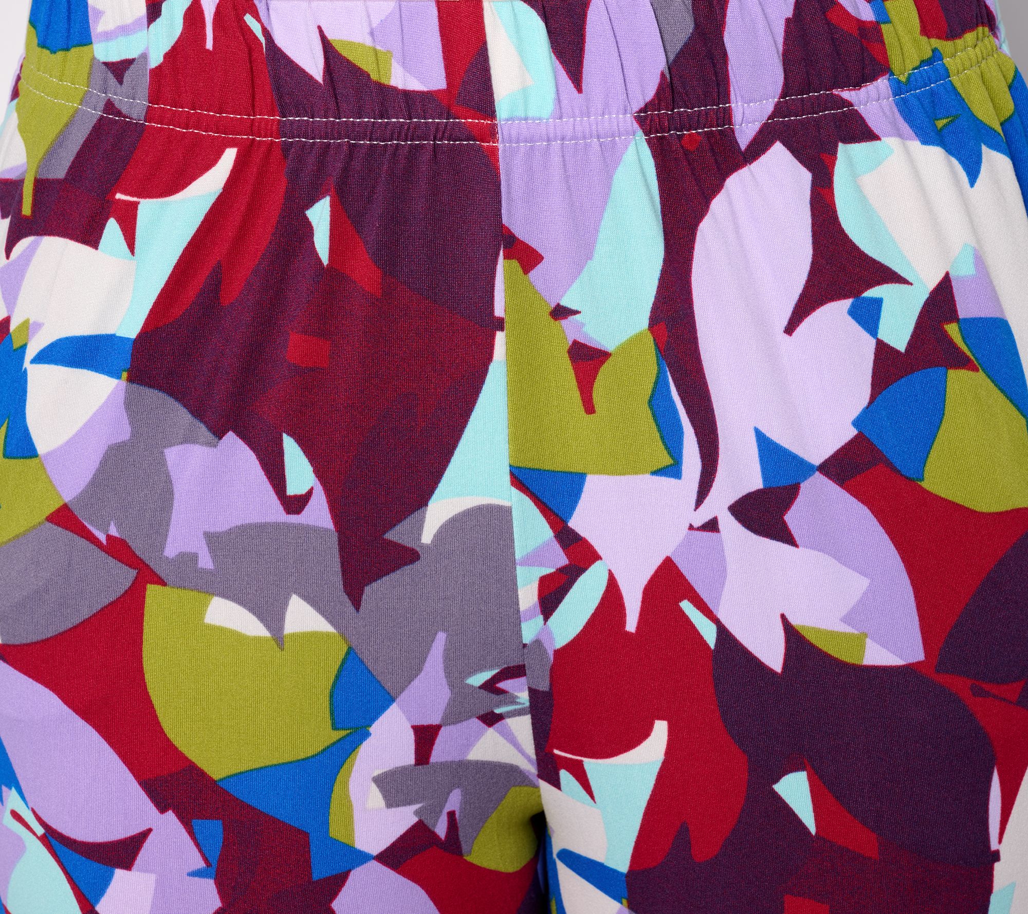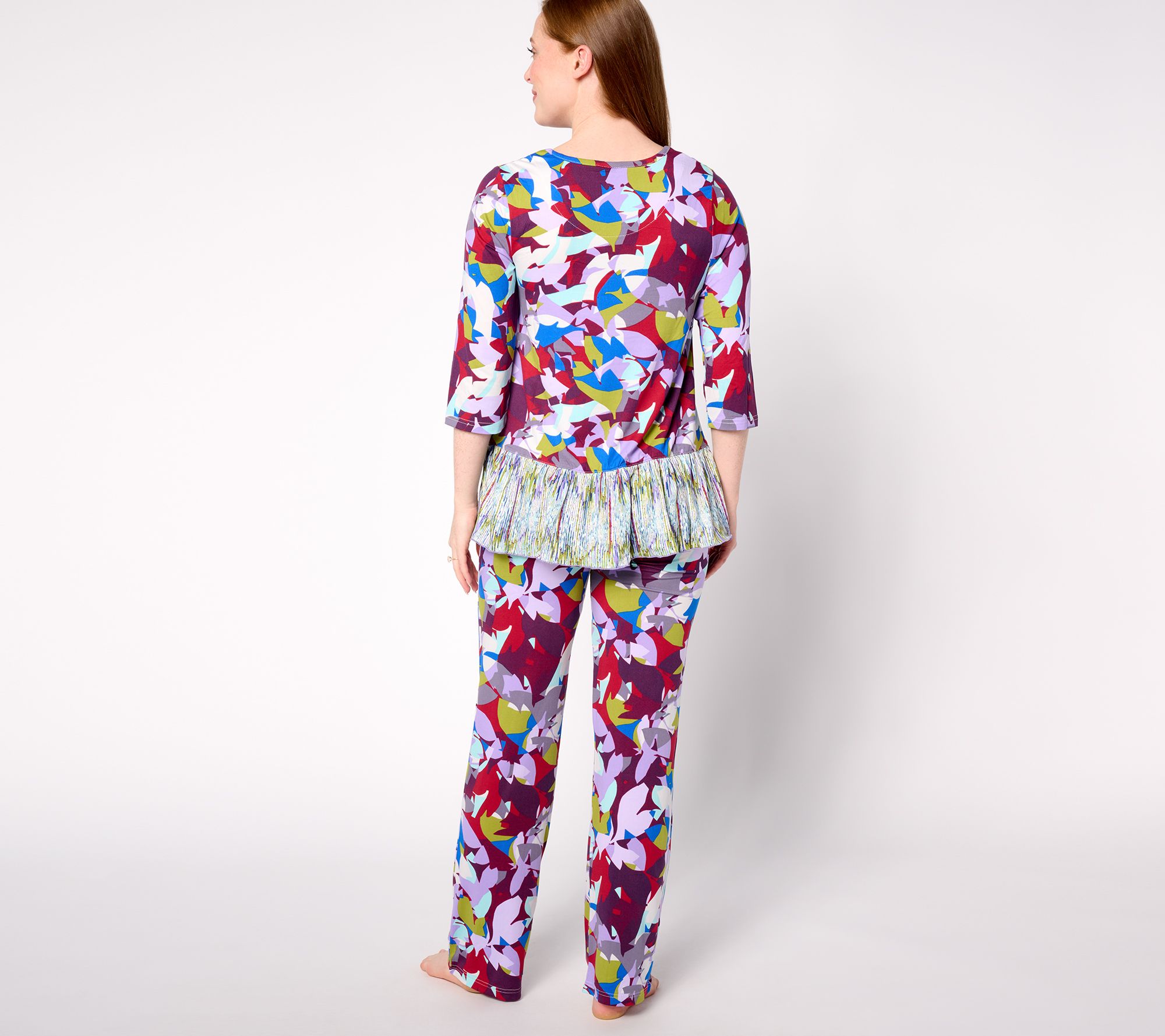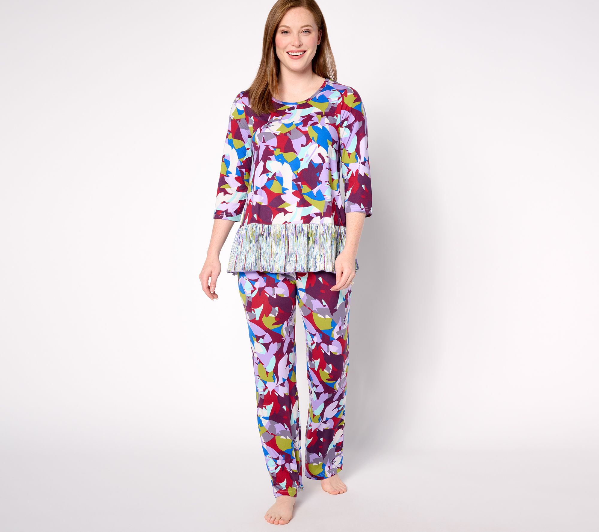 Sleep in style when you don this tiered tunic and matching pants set. The vibrant print is eye-catching and attention-grabbing, and the contrasting peplum-like piece adds visual interest. Could this be the pajama set of your dreams? We think so! From LOGO by Lori Goldstein®.