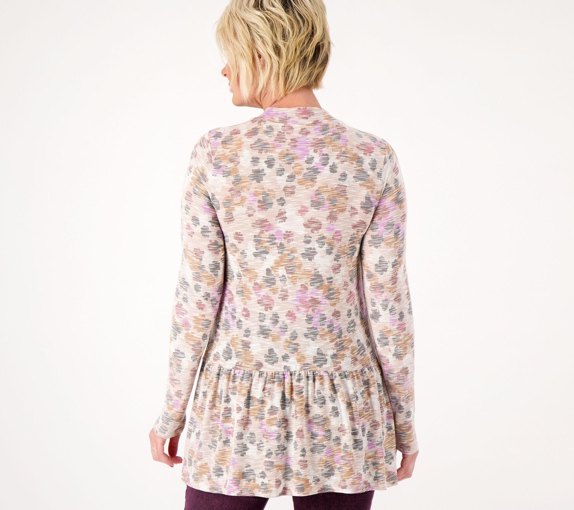 Details, details, details -- Lori knows how to bring 'em. With a flattering mock neckline, a feminine peplum style, and a playful allover print, this top stands out from the rest. Can you say, new obsession?! From LOGO by Lori Goldstein®.
