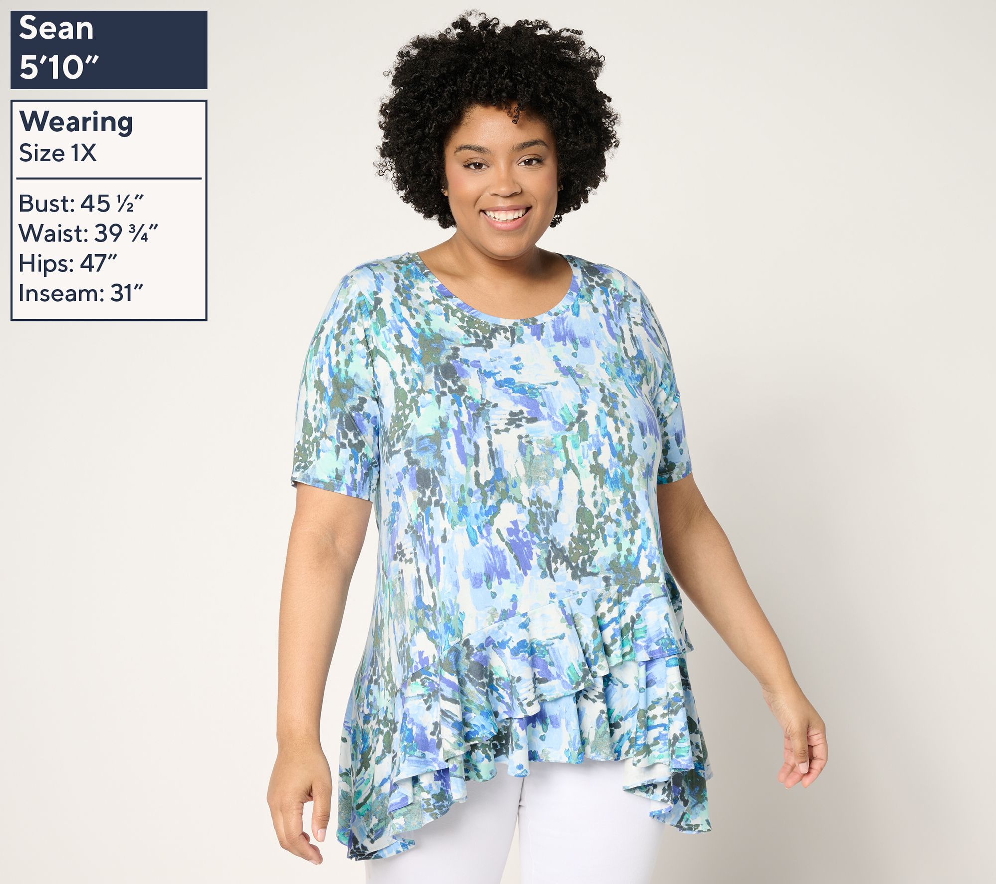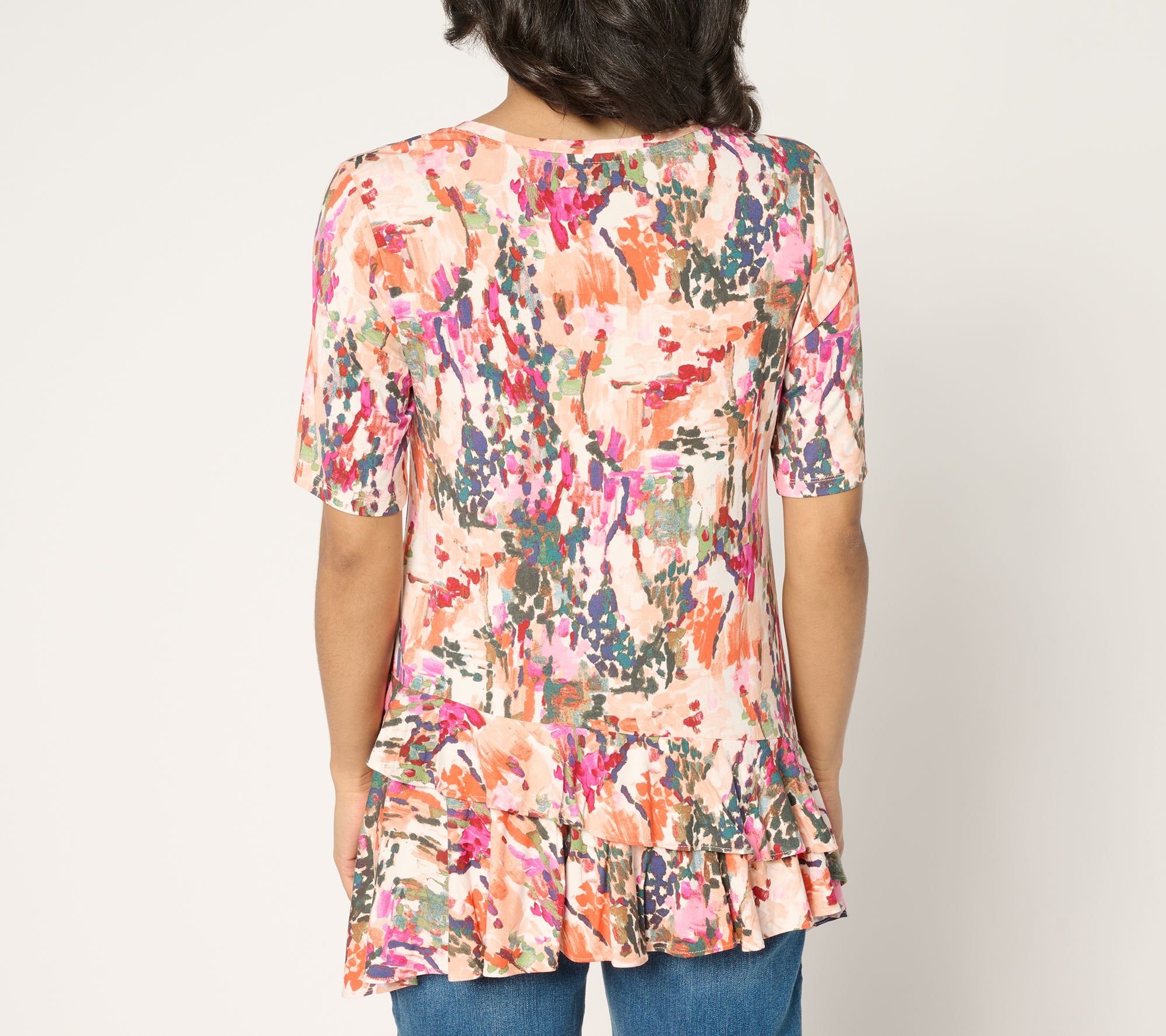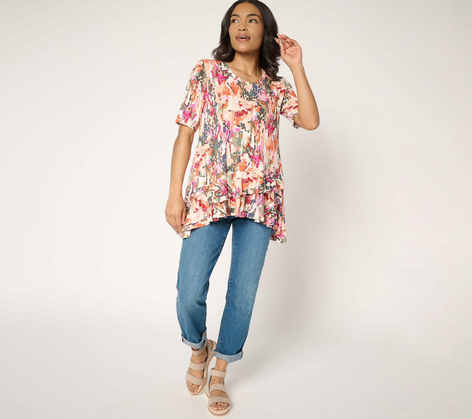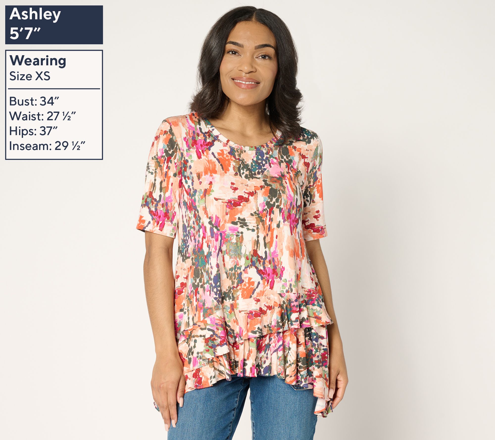 Ready for a style update? Show off your fashion-forward flair with this ruffle hem top. The elbow-length sleeves and crew neckline pair perfectly with a unique two-layered diagonal ruffle at the bottom, ensuring a fun twist on your everyday wear. Crafted in Rayon 230 knit, it’s your go-to piece to add a little flair to any outfit. From LOGO by Lori Goldstein®.