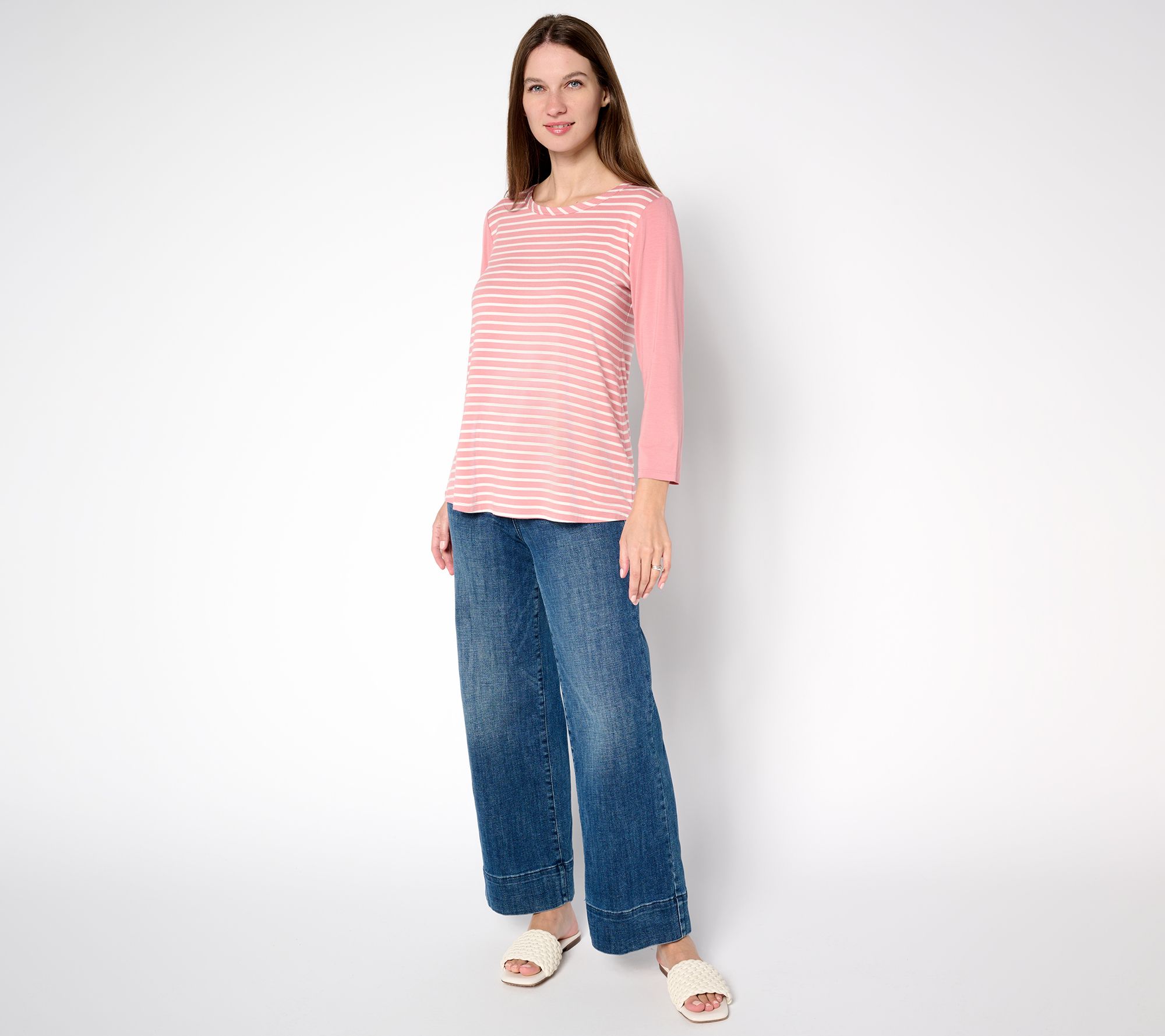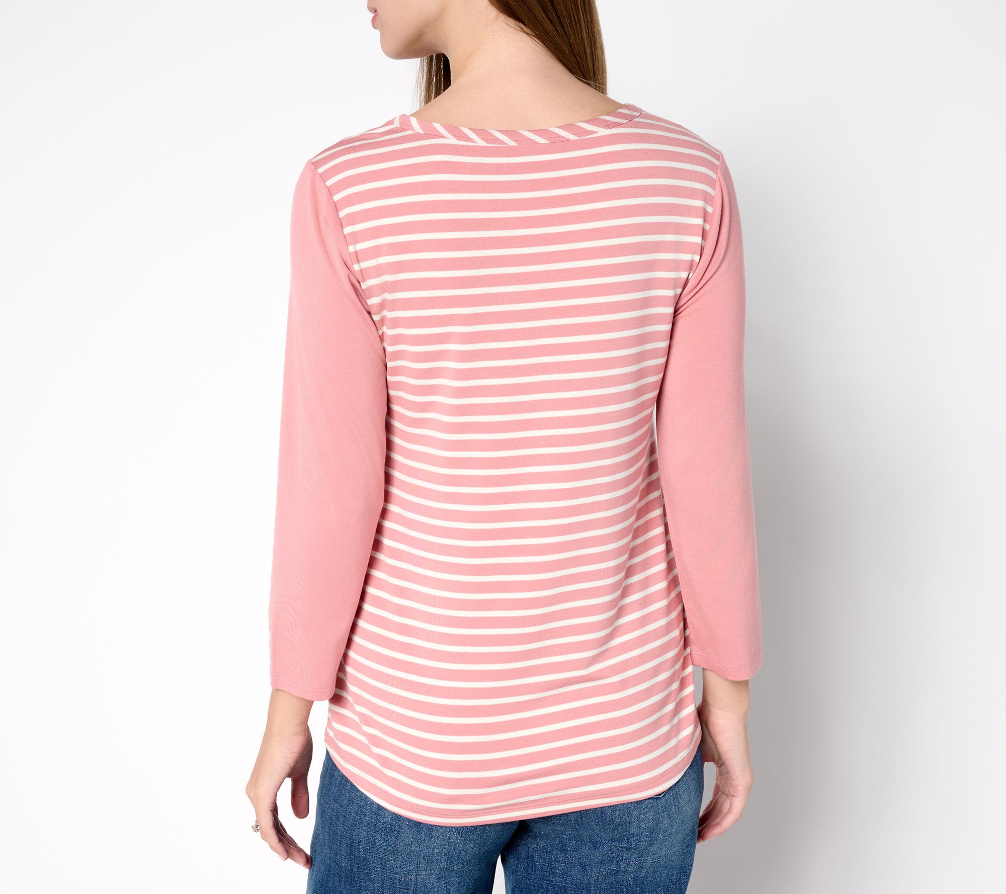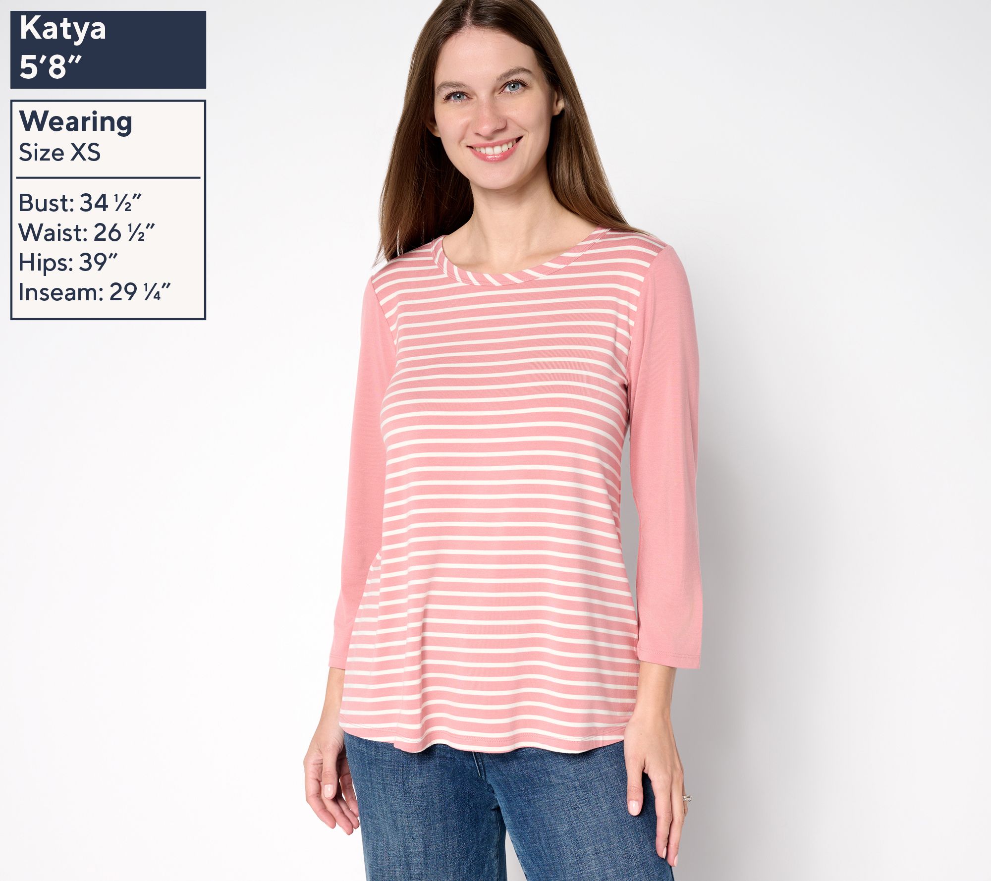 Feel like mixing things up? This striped top brings vibrant energy to your everyday routine, thanks to its comfy rayon-spandex jersey and bias stripe at the neckline. Slip it on with joggers for weekend errands, or tuck it into tailored pants when you're in the mood for a fresh take on stripes. From LOGO by Lori Goldstein®.